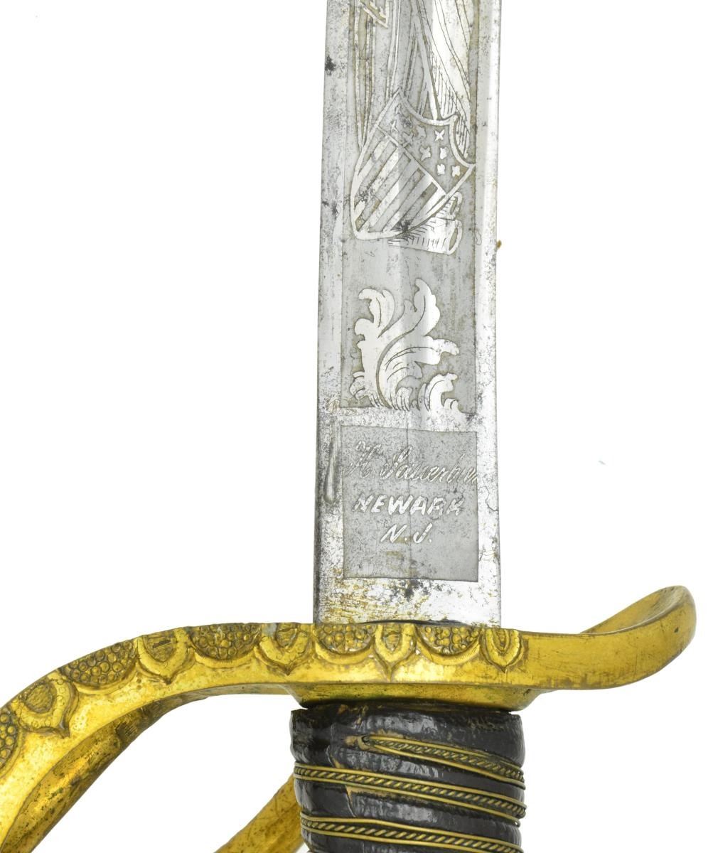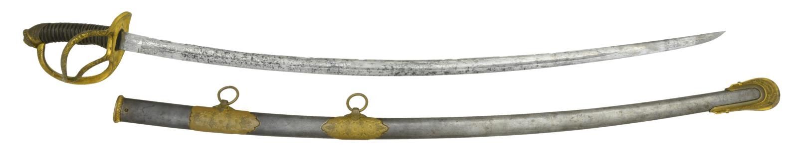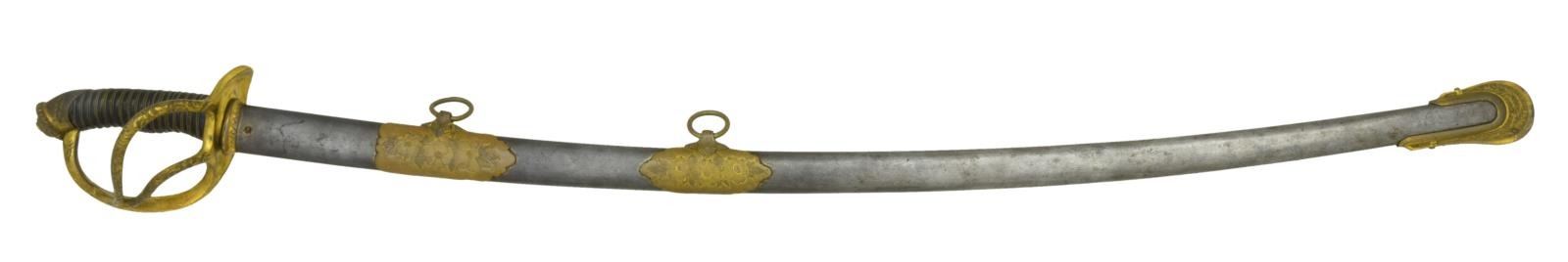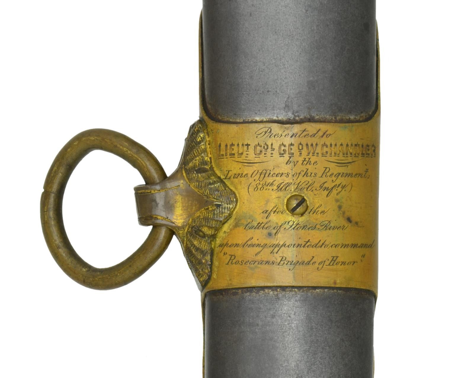 GEORGE CHANDLER, 88TH ILLINOIS, KILLED AT KENNESAW MOUNTAIN, GEORGIA. 35" finely etched Henry Sauerbier, Newark, NJ blade, characteristic heavy Sauerbier engraved branched hilt, cocked pommel with spanner nut, engraved brass mounts. Top ring mount finely inscribed in 9-line presentation on reverse side: "Presented to LIEUT. COL. GEO W. CHANDLER" by the Line Officers of his Regiment (88th Ill Vol. Inf.) after the Battle of Stones River upon being appointed to command "Rosecrans Brigade of Honor". George Warner Chandler (1832-1864) born in Canada, enlisted from Chicago September 1862 as major in 88th, had 2 horses killed at Stones River, heavily engaged at Chickamauga & Missionary Ridge and through out the Atlanta campaign. Chandler died from wounds received at the "Dead Angle" on Cheatham Hill during battle of Kennesaw Mountain, June 27, 1864. UNATTACHED ACCESSORIES: small file of research materials. CONDITION: very good to fine overall, lots of original luster on blade, dark staining especially one side. Hilt retains much of its original gold wash, traces of gold on scabbard mounts, steel scabbard body is fine with one dent, complete grip, grip slightly misfit at throat. (02-19260/JS). $3,000-4,000.