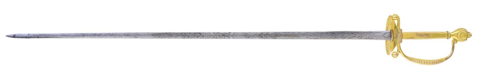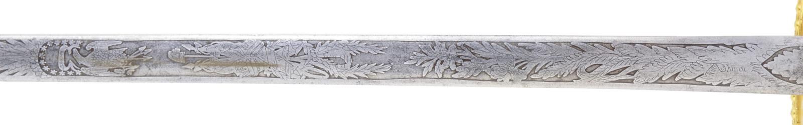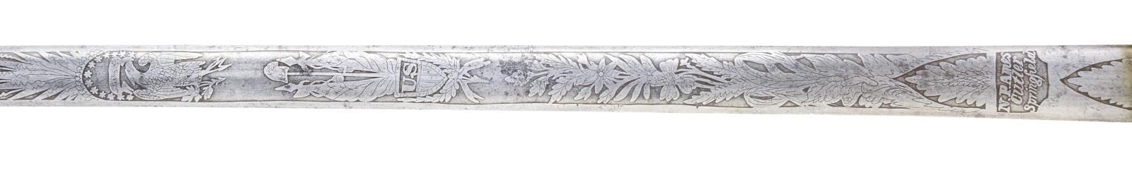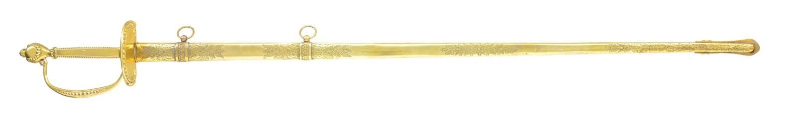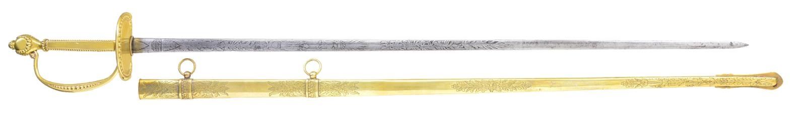 Overall length 37 1/2". Blade length 30 1/8”. This is an exceptionally rare and seldom encountered officer’s sword by Ames. It was regulation for medical staff for a scant 8 years from 1832 to 1840. This sword would have been regulation during the Black Hawk War, Second Seminole War, and of course during the Texas Revolution. Blade is elliptical in cross section and etched over 2/3 of its length with various patriotic & foliate motifs, including American eagles with liberty banners and a central spray of arms with “US” in shield. Blade is etched near the hilt “N.P. Ames Cutler Springfield”. Heavily gilded brass hilt with a single kidney-shaped guard. Orb decorated guard, pommel, grip and knuckle bow. Gilded brass scabbard with foliate engraving. CONDITION: blade has a pleasing light gray patina. Hilt retains nearly all of its original gilded finish. Scabbard has a few tiny dents and retains much of its original gilded finish. (02-19453/BF). $2,500-3,500.