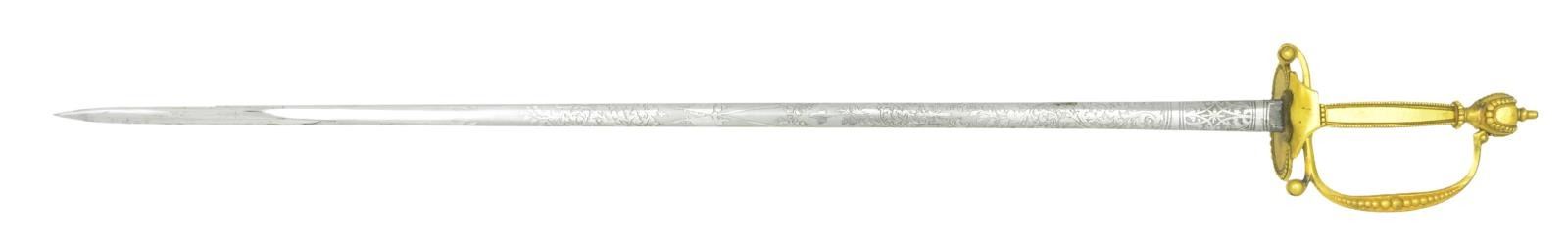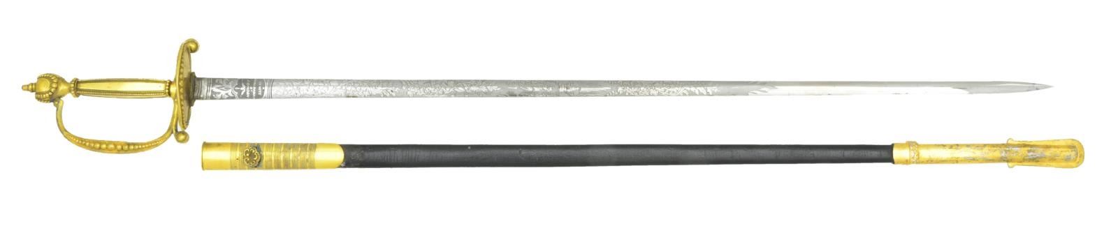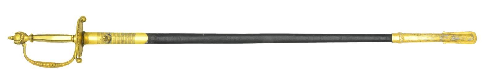 SWORD. Overall length: 37 3/4". Blade length: 30 3/4". This is an obviously English made sword but follows the form & style exactly of a US M1832 Medical Staff. Blade is elliptical in cross section & etched over 2/3 of its length with various military & foliate motifs including a crowned "GR". Blade is etched near the hilt, "WHITE MARLBROUGH ST. LONDON". Gilded brass hilt with orb decoration throughout the guard, knuckle bow, pommel & edges of the grips. Gilded brass mounted leather scabbard. CONDITION: blade shows original factory polish with a few widely scattered, discolored spots. Hilt retains nearly all of its original gilding. Scabbard mounts retain 90% of original gilded finish. Leather remains strong. (02-19517/BF). $700-1,000.