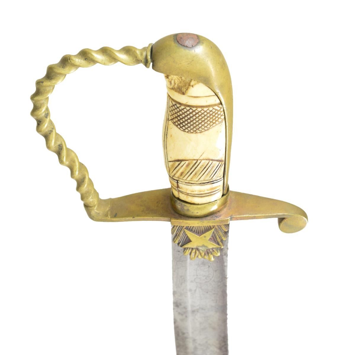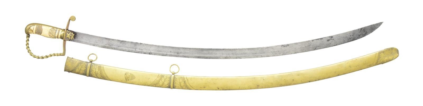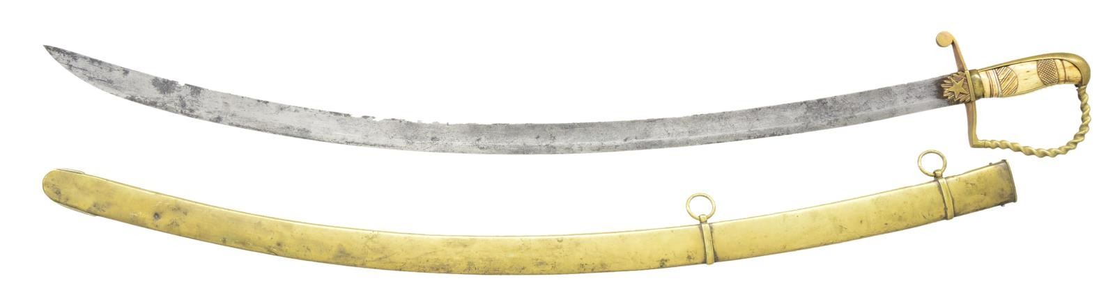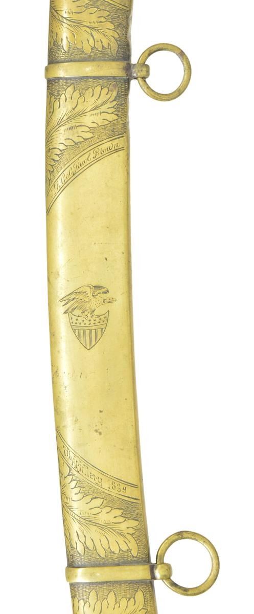 Overall length: 38 1/2". Blade length: 32 5/8”. The blade has a single wide fuller with etching over the first 1/3 of the blade. Etching includes foliate, military & patriotic motifs featuring a federal shield & spray of arms. Gilded brass hilt with a large star on each languet. Plain guard with a disc quillon. Knuckle bow has a multi-twist motif. Plain backstrap with bird’s head pommel. Carved bone grip. Brass scabbard with oak leaf engraving featuring an American eagle atop a federal shield. There are 2 bands on the scabbard that read “Lt. Col. Jacob Brown” & “7th Artillery 1839”. CONDITION: blade has a gray mottled patina with significant wear to the etching. Hilt has a pleasing mustard patina with no traces of gilding remaining. Grip has several tight age cracks & chipping near the pommel. Scabbard has a few minor shallow dents. (02-19182/BF). $1,500-2,500.