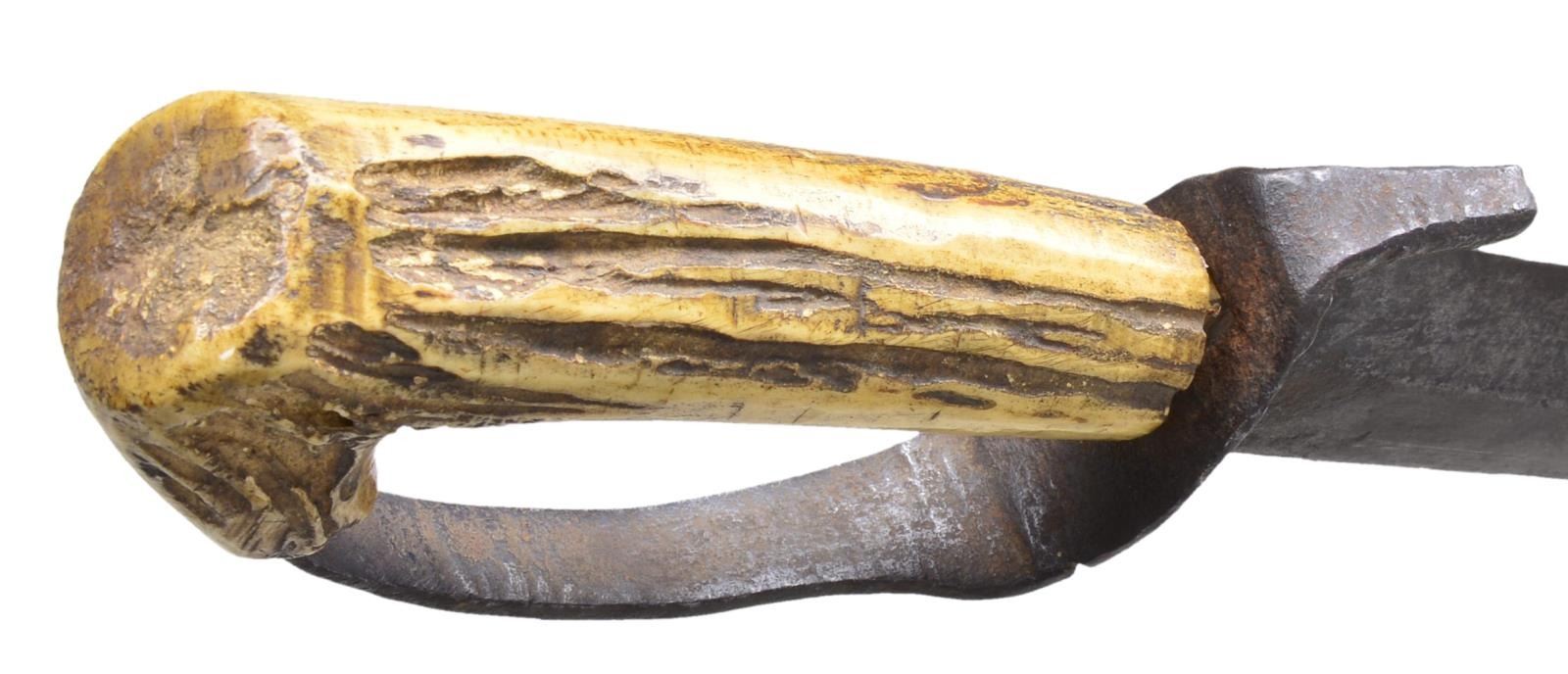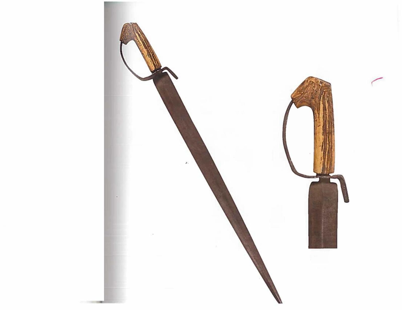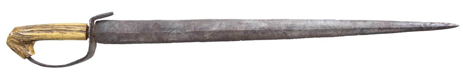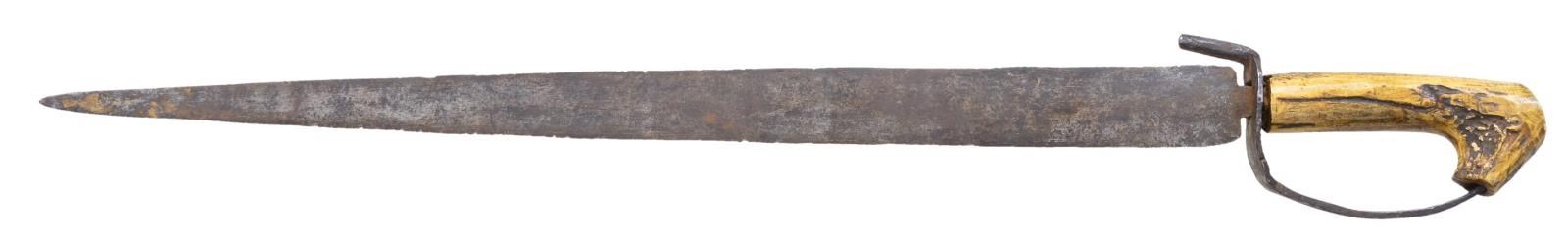 D-GUARD SHORT SWORD. “Knife or sword measures 28” with 22” dagger pointed blade. The tang runs through the “D” shape iron guard and was force fitted into the stag handle. The blade is flat on one side and has a median ridge running its full length with both edges sharpened. This is probably a variation of the “Confederate “D” guard bowie used during the Civil War with the unusual stag handle.” CONDITION: very good “as found”, iron patina, appears to be missing ferrule between grip and guard. Many small nicks in cutting edge from use. Stag has nice hand worn patina. PROVENANCE: Pictured on page 172 “Accoutrements IV” by Jim Johnston. (02-16783/JS). $1,000-2,000.
