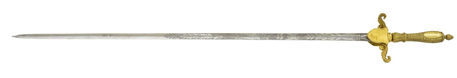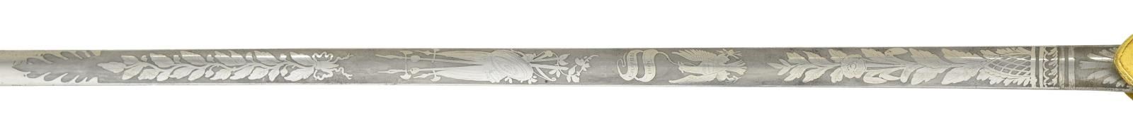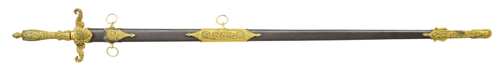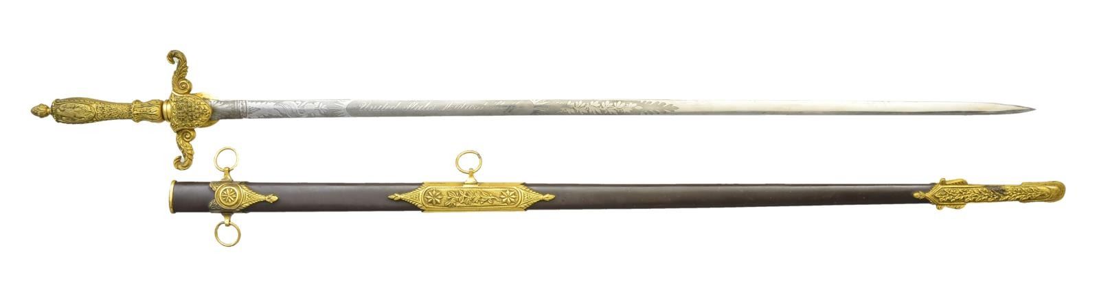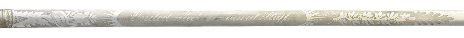 Overall length: 38 1/4". Blade length: 30 1/2". Blade is etched over half its length with foliate, military & patriotic motifs, including a 6 1/2" panel that reads “United States Medical Staff”. Gilded brass hilt with shield languets. The front shield has an “MS” over 13 stars and the rear shield is blank to facilitate a presentation. Solid grip with an American eagle on the face & various leaf decoration. Pineapple nut on the pommel. Scabbard has a plum brown finished body with heavily gilded foliate & star mounts. CONDITION: blade shows areas of original factory polish. Hilt is undamaged, but slightly loose and retains nearly all of its original gilded finish. Scabbard is undamaged and the mounts also retain nearly all of their gilded finish. (02-19581/BF). $1,800-2,400.