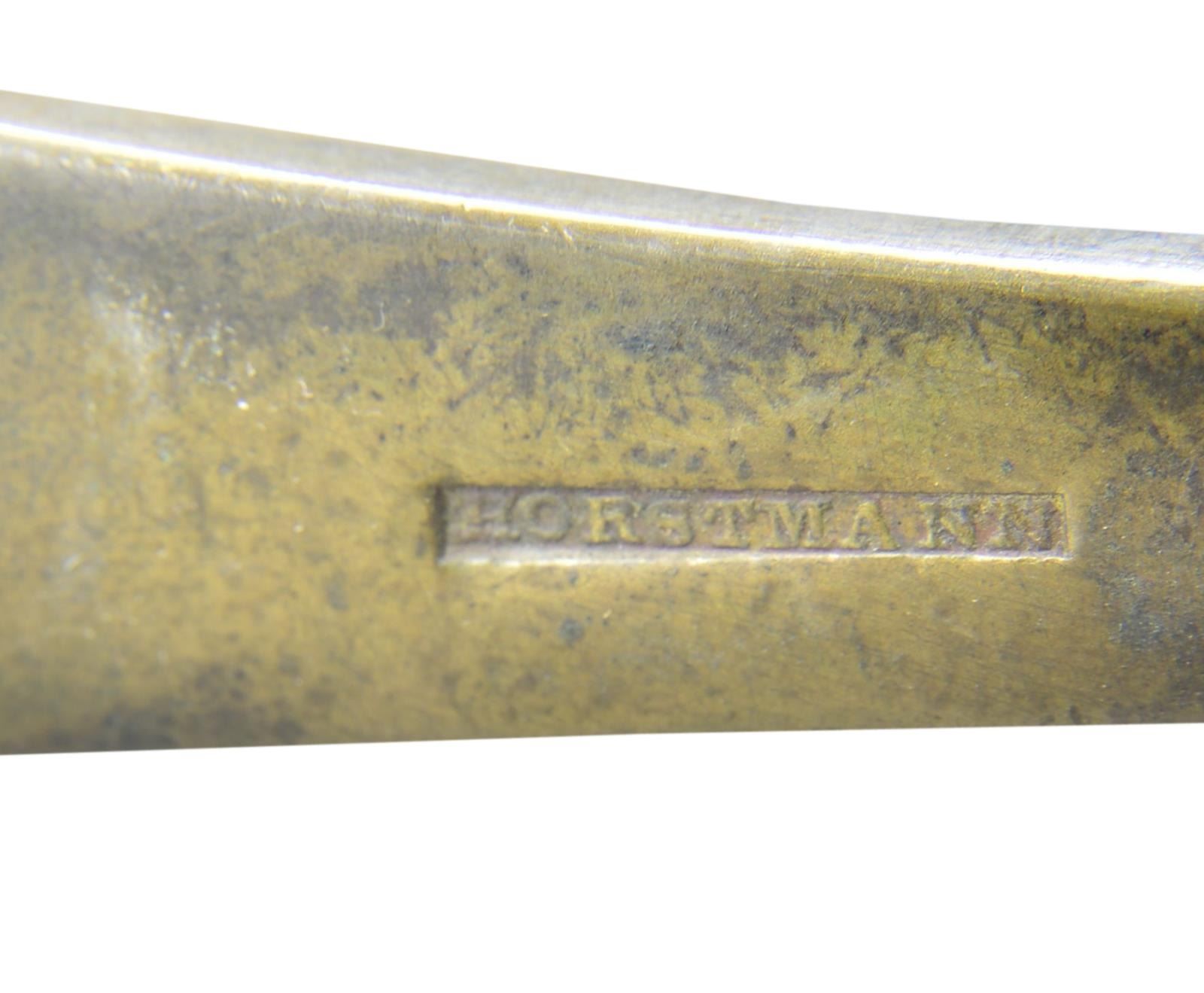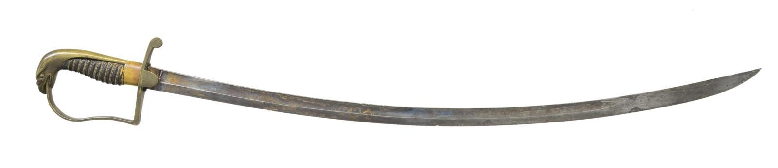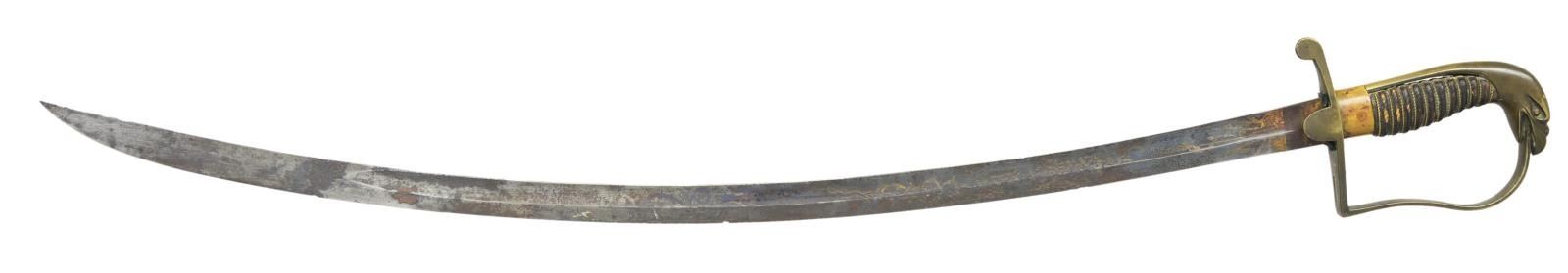 A very interesting sword first produced by Widman and then by Horstmann after Widman’s death in 1848. Extensive research has been done into this style of sword and it has been determined that starting as early as 1820's Marine NCO’s carried this style eagle head sword. This style sword remained in favor until just prior to the Civil War. This sword was also a popular sword with Militia Officers and NCO’s with many being sold by both Widman and Horstmann to non-Marine Militia soldiers. This sword measures 37 1/4" with a 31 5/8” blade. The single wide fullered blade is blued over about half its length. Gold highlighted etching includes patriotic, military & foliate motifs. There is also a ribbon on the blade bearing the words “W.H. Horstmann & Sons Philadelphia”. Brass hilt with slight reverse P knuckle bow and small languets on the cross guard. The underside of the cross guard is stamped “HORSTMANN” near the joint with the knuckle bow. Stylized eagle head pommel with knuckle bow entering the mouth of the eagle. Plain backstrap with wire wrapped leather grip. No scabbard. CONDITION: blade has a dark patina and areas of significant pitting. Less than half of the bluing remains in the blade along with areas of gilding in the etching. Hilt is a bit loose but undamaged. Grip shows light to moderate wear. (02-19475/BF). $1,000-1,400.