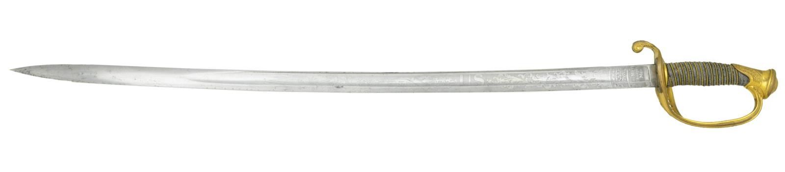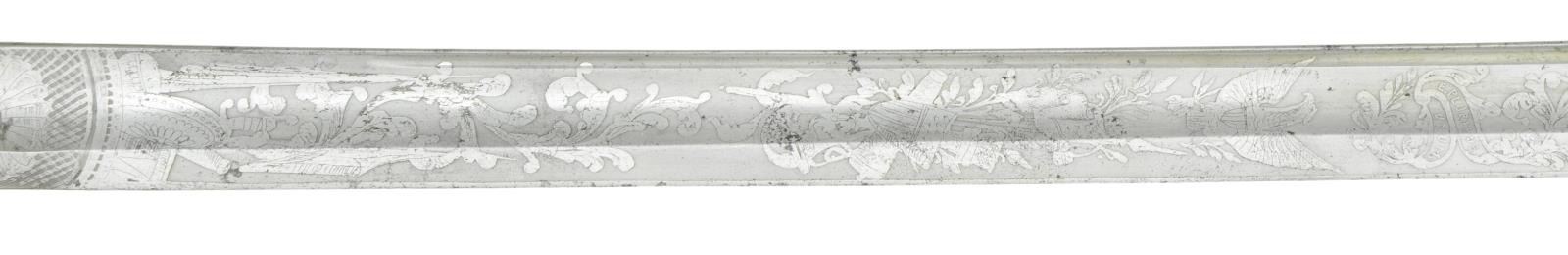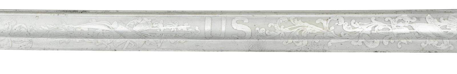 Overall length: 39 1/2". Blade length: 32 1/4". Blade has a single wide fuller with a single narrow fuller near the spine. Blade is etched over 2/3 of its length with various military, patriotic & foliate motifs, including a large central “U. S.”. There is an etched panel near the ricasso that reads “Ames Mfg Co Chicopee Mass.”. Heavily gilded brass hilt with pierced semi-basket guard featuring a cutout “US”. Foliate & floral embellished pommel with gilded wire wrapped sharkskin grip. Plum brown finished scabbard with gilded brass mounts. CONDITION: Fine, blade shows some original factory polish remaining with occasional spots of discoloration. Hilt retains most of its heavily gilded finish. Grip & wire are complete, though sharkskin has dried a bit. Scabbard shows light overall wear with nearly 90% of the original gold finish on the mounts remaining. (02-19420/BF). $1,400-1,800.