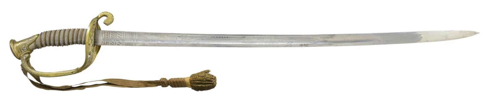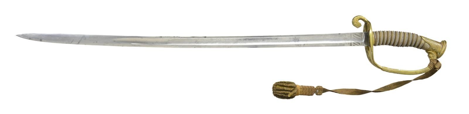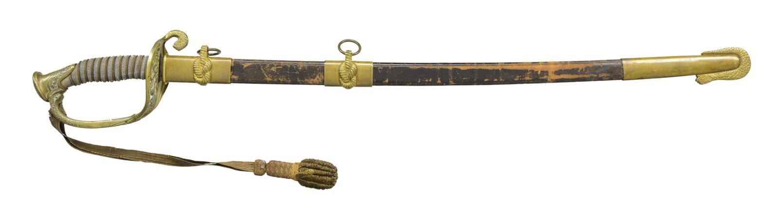 Overall length 35". Blade length 28 1/4". Blade is etched over the first 16 1/2" with various naval & foliate motifs. The mark “WH HORSTMANN & SONS PHILIDELPHIA” is etched near the ricasso. Gilded brass hilt with “USN” in the guard & a dolphin quillon. Knuckle bow turns to a dolphin head where it enters the pommel. Wire wrapped white sharkskin grip. Gold bullion sword knot attached. Gilded brass mounted leather scabbard. CONDITION: blade shows areas of original factory polish with a few very minor spots of staining. Hilt retains areas of original gilding. Grip shows wear but is complete. Knot shows moderate wear with a few loose strands. Scabbard mounts show traces of original gilding. Leather shows scuffs & scrapes but no breaks or serious damage. (02-18984/BF). $800-1,100.