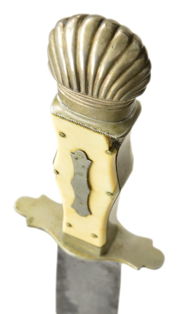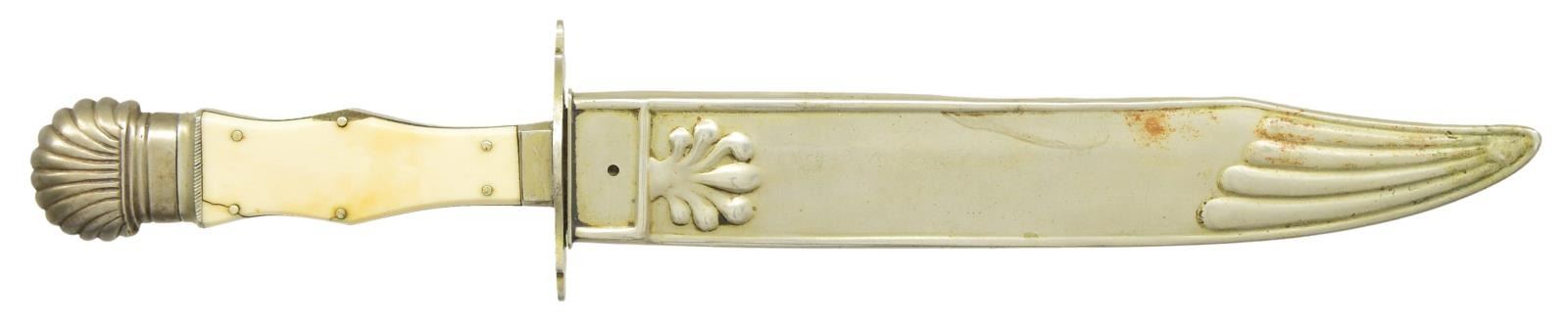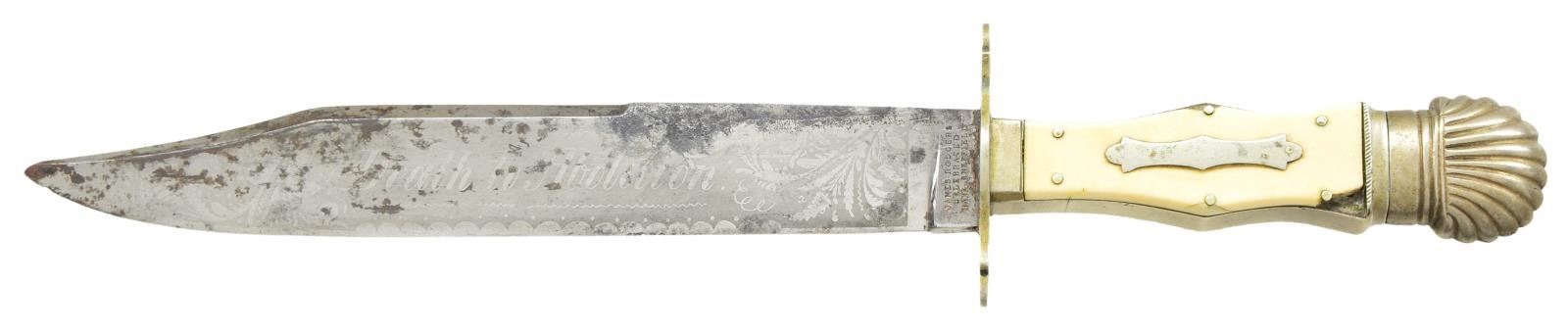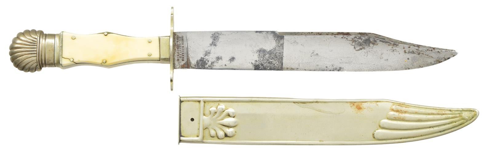 ROGERS BOWIE KNIFE. 14” overall, 9” clip point blade etched in large script panel: “DEATH TO ABOLITION”. One of the earliest motto’d Sheffield knives and among the most historic and iconic messages seen on antebellum American Bowies, its etched sentiment being culpable for starting the Civil War. Very few “DTA” knives exist with this script style and floral background motif. An 1838 anti-slavery broadside is known to exist with a drawing of this same motto on a blade, but with block lettering as seen on most examples. Blade is stamped on ricasso “JAMES ROGERS / CELEBRATED / MAKER. SHEFFIELD”, heavy cast German Silver grip with German silver pinned ivory slab grips, German silver escutcheon, sculptured cross guard, and clamshell pommel. Its original and rarely seen German silver, relief repousse sheath fits knife perfectly. This is a great opportunity for those with a keen interest in collecting Confederate. Its script motif, fine high-polish blade condition and complete scabbard offer a rare opportunity to add to any exceptional collection. CONDITION: One of the finest of the “DTA” knives this writer has seen. Fine overall, blade retains 90% original polish and lustrous etching with areas of black staining and blood pitting. Point worn. Maker’s mark and etched panel are crisp and complete. Ivory slabs sound and well fit, a small ivory chip on each side of one slab pin. The original embossed German silver sheath still retains its composite lining, which is almost always missing, frog button still attached, minor small dents and stains. (02-19433/JS). $25,000-45,000.
