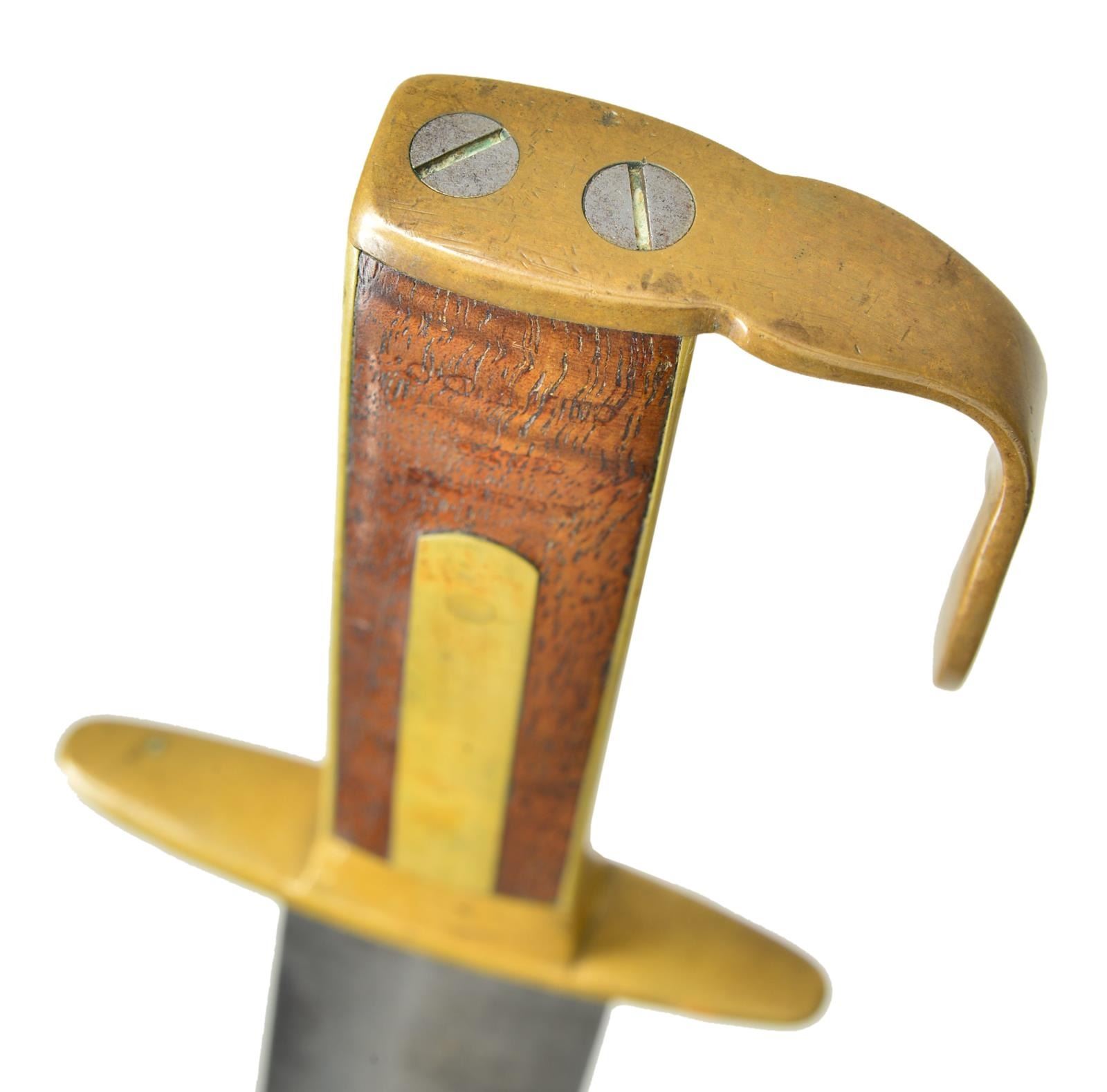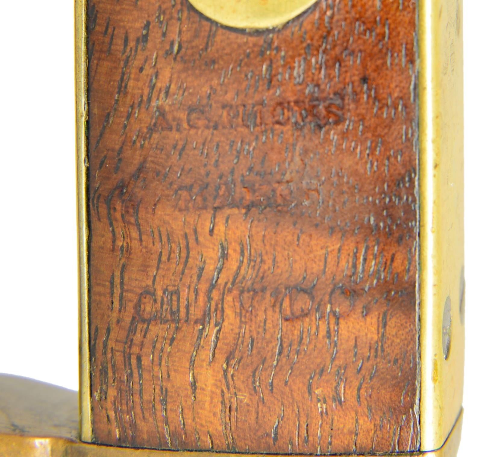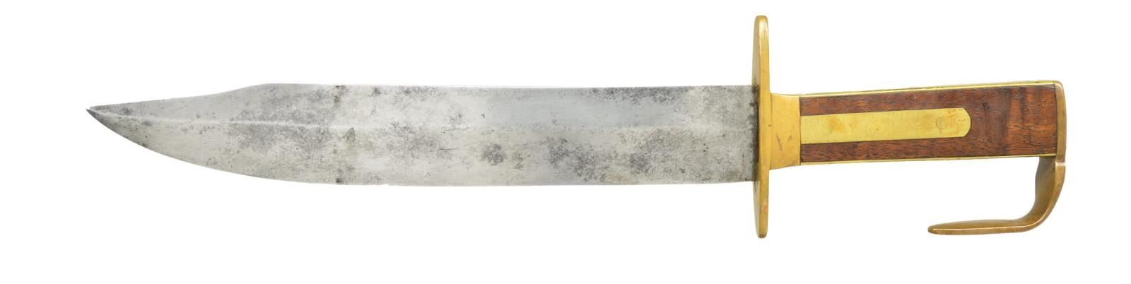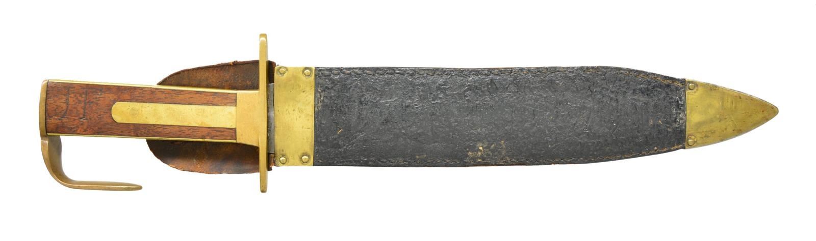 ORIGINAL SHEATH. 14.5”overall, 9.75” clip point slightly upswept blade, unique to Hicks. Grip is made by encasing walnut slabs with brass side pieces each attached with 6 iron screws, the heavier gauge brass pommel with turned sculpted 2” turned down hook is attached with 2 larger iron screws. Stamped in 3 lines in wood "A.G. HICKS / MAKER / CLEVELAND, O". The original and unique design sheath is 3-layered tarred leather sewn at edges with pinned & soldered 3-piece brass tip and pinned brass reinforcement at throat, integral belt loop. Once thought to be Mexican war era rifleman's knives as speculated by Berkeley Lewis in his 1956 “Small Arms & Ammunition in the United States Service”, later reinforced by Harold Peterson in his 1958 “American Knives”, these knives are now known to have been made no earlier than 1856. Mark Zalesky wrote wonderfully researched article in November 2015 “Knife Magazine” “The A.G. Hicks “Rifleman’s Knife” A Sixty Year Old Mystery Finally Solved”. The most interesting part of the article Is a quote from the Cleveland Plain Dealer July 18, 1861 telling of confiscation of trunk with 102 of these knives, “A Walking Arsenal” was title in newspaper. The confiscated trunk was sent to Governor Morton of Indiana. Another news article referring to these knives “He said he expected to find a ready sale for his knives among the Indiana volunteers. It is suspected that he designed taking them South.” of the approximately 20 known survivors, one is inscribed to a “Louisiana Tiger” captured at Manassas. There are several images of Union soldiers with Hicks Bowies, so they did get around. Hicks died in 1866 at age of 59. A lifetime maker of planes and other cutting tools, he also made some of the most desired of all American Civil War Bowies and this is the best survivor of them all. CONDITION: Fine overall, grey blade with staining, pinprick pitting. Sheath is sound, complete, brass mounts cleaned & varnished en suite to brass mounted grip, minor cosmetic scratches, and dents unaffecting the overall aesthetic. PROVENANCE: ex-Ray Bentley collection, Josh Phillips collection. (02-19365/JS). $10,000-15,000.