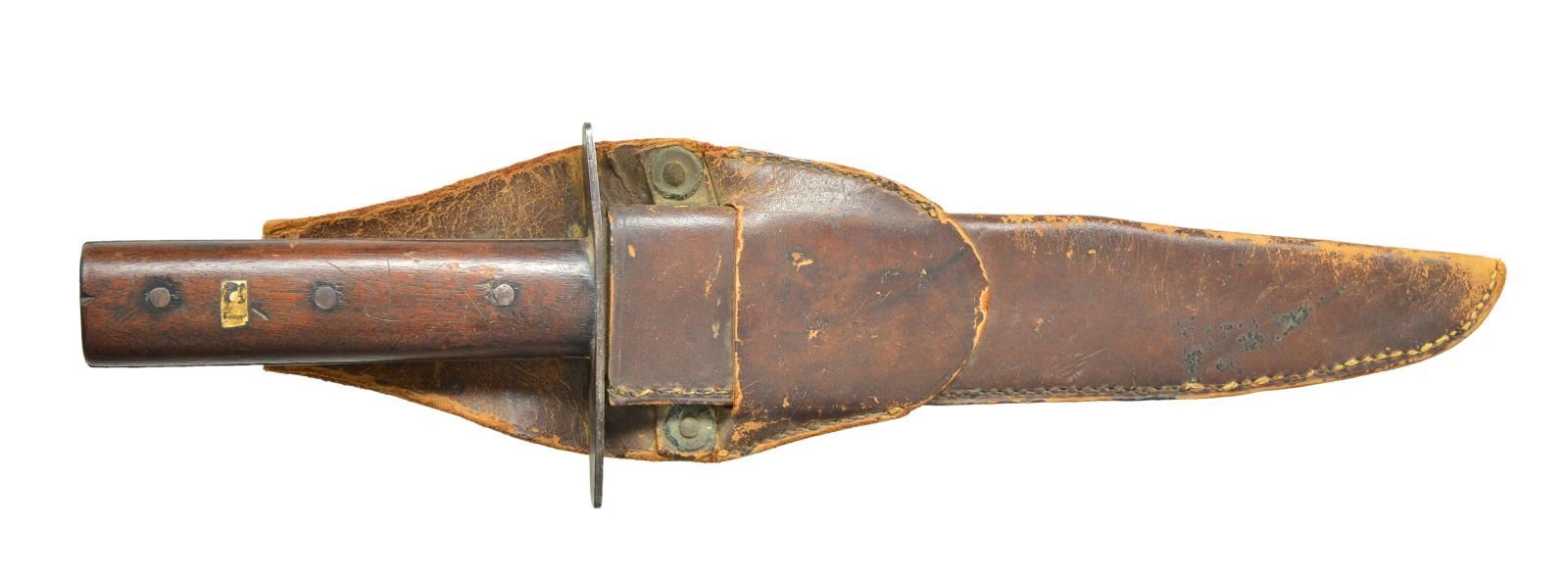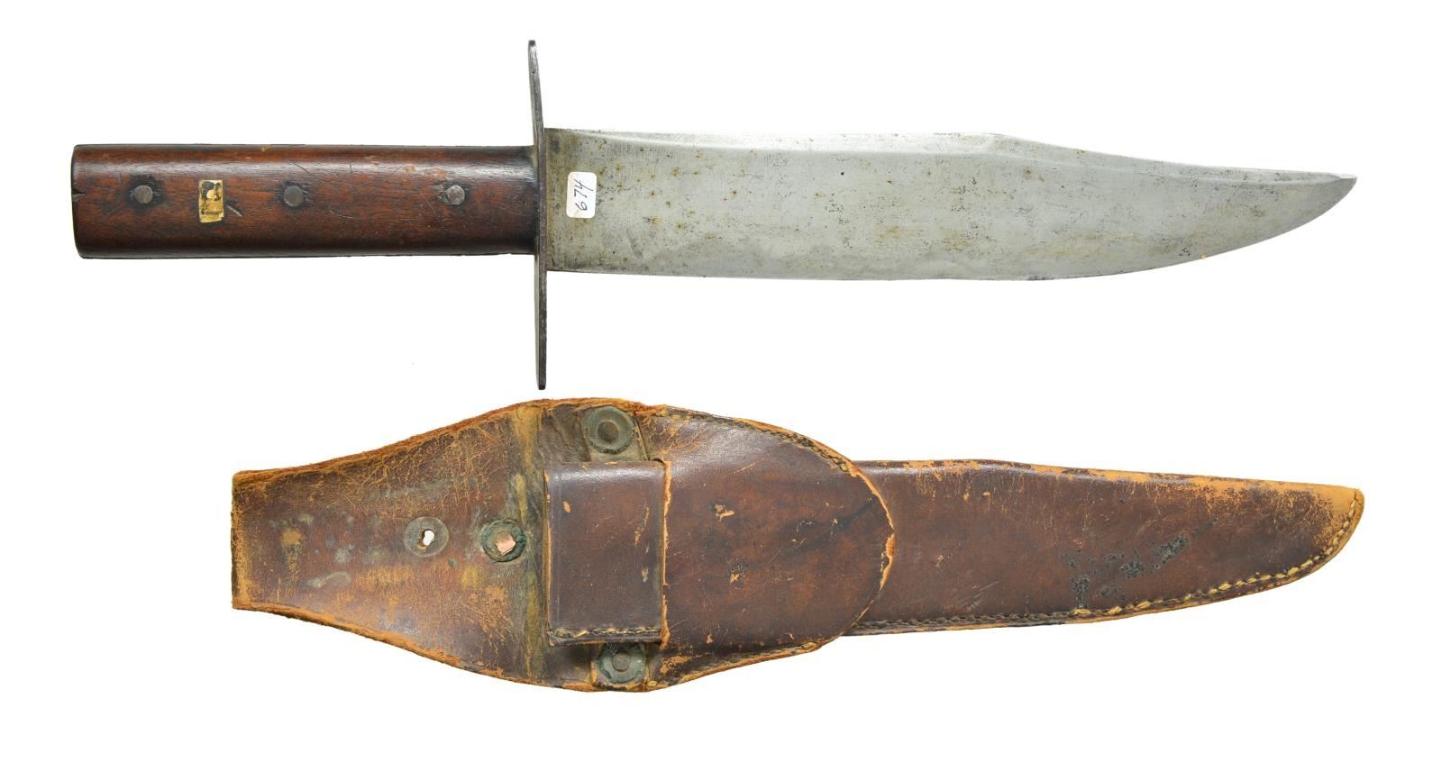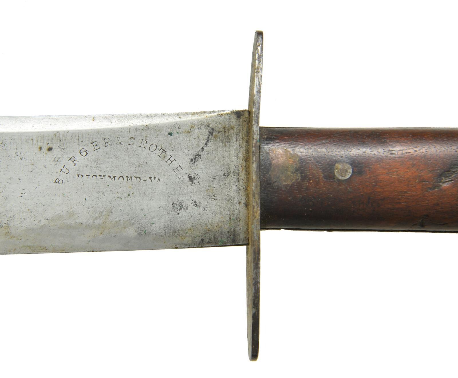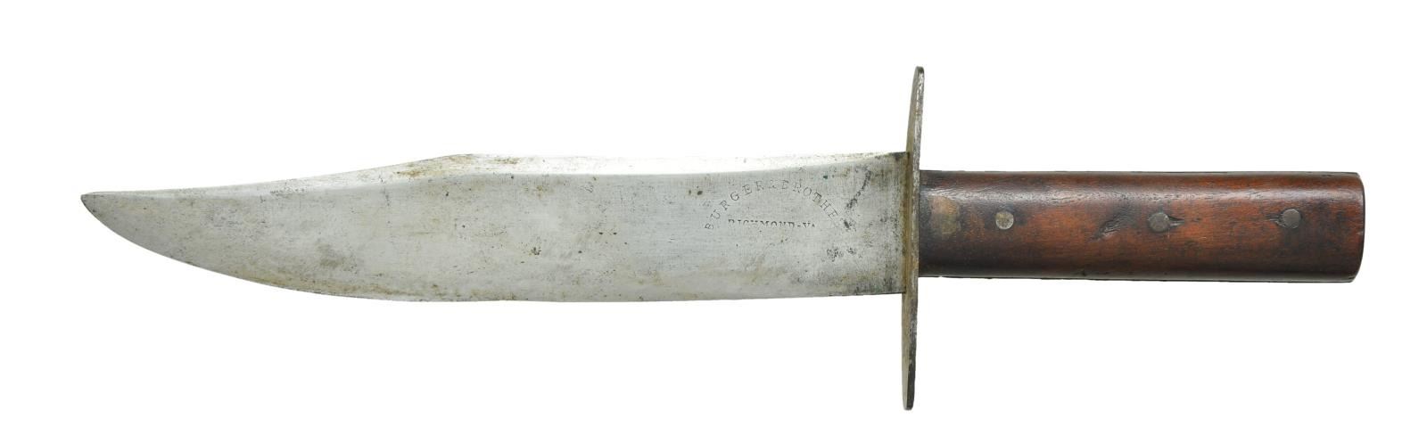 KNIFE WITH SHEATH. 14” overall, 9.25” clip point blade, 4.5” clip with beveled top edge, “BURGER & BROTHER / RICHMOND-VA” stamped on blade, 4” iron cross guard, iron pinned wood slabs on full tang, this is your classic Richmond side knife by the rarest maker and nicely marked. The sheath and frog attached with brass rivets appear original to its time of use and fits it well. CONDITION: very good overall, blade is gray/bright with old sharpening, light staining and pitting, hand worn patina to grip with old small pasted paper tag with indiscernible number. brown leather sheath is sound with scuffing as is frog. PROVENANCE: Pictured on page 193 “Accoutrements IV” by Jim Johnston. Ex-Jack Malloy Collection. (02-18172/JS). $7,000-9,000.