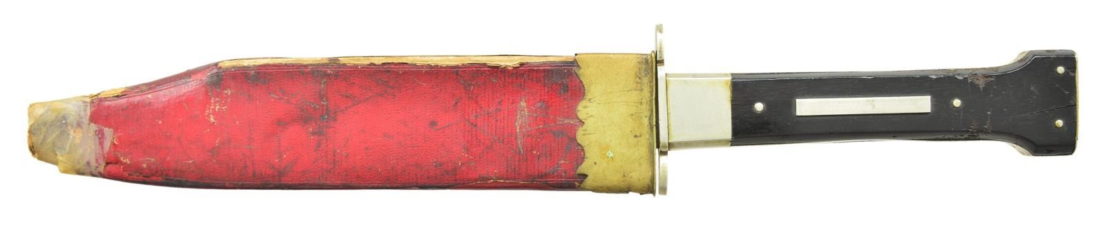 13” overall, 8” clip point blade with Spanish notch, “W BUTCHER / SHEFFIELD” stamped on ricasso below “WR” cypher and crown. 2.5” German silver cross guard, heavy cast German silver handle with pinned Rosewood slab grips. Red Moroccan leather veneered sheath with German silver mounts. CONDITION: good-very good overall, blade is overall grey with some original luster, staining and pitting, tip resharpened and missing about ¼”. Makers mark legible, sheath missing tip and frog button. (02-17902/JS). $4,000-6,000.