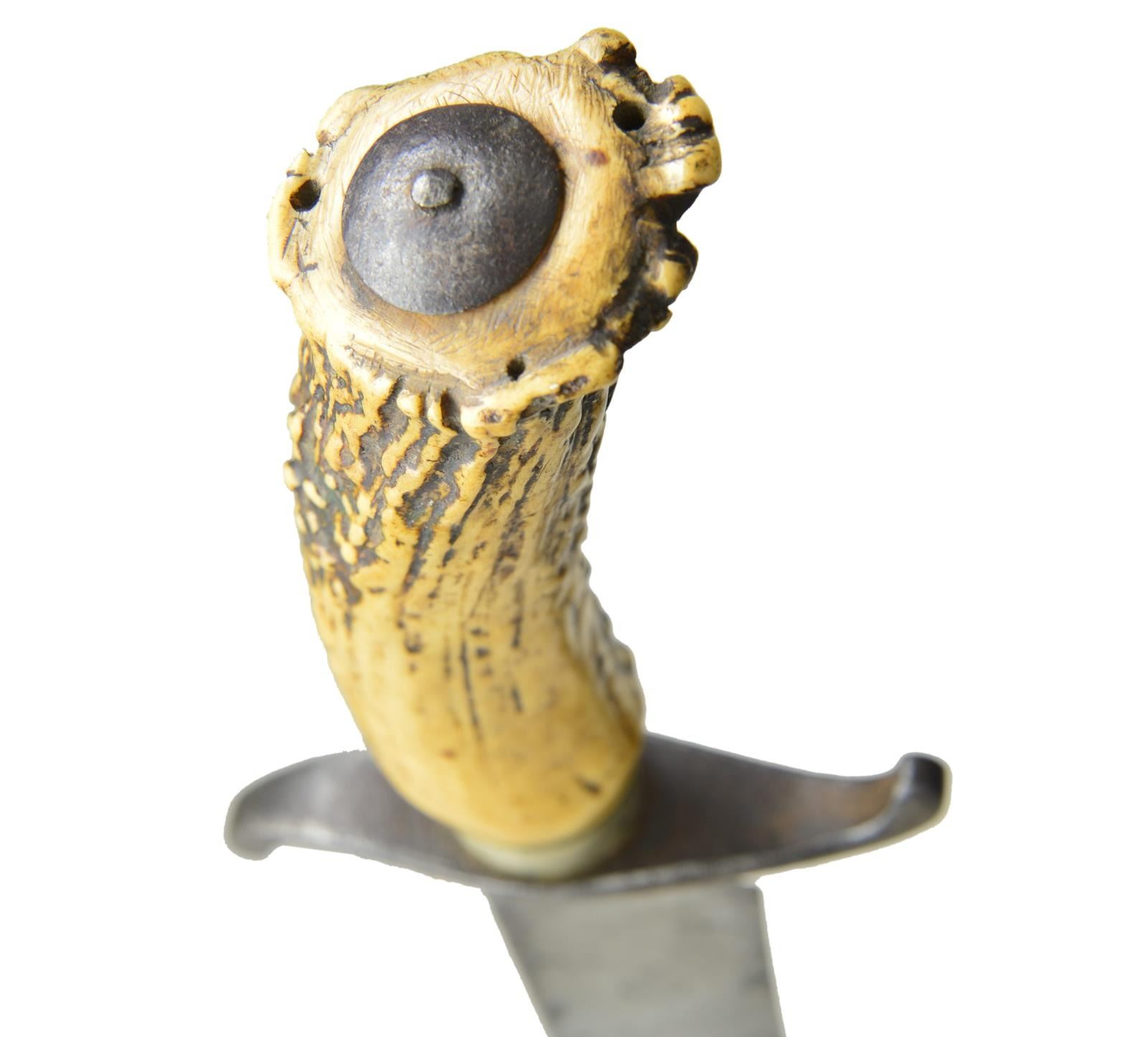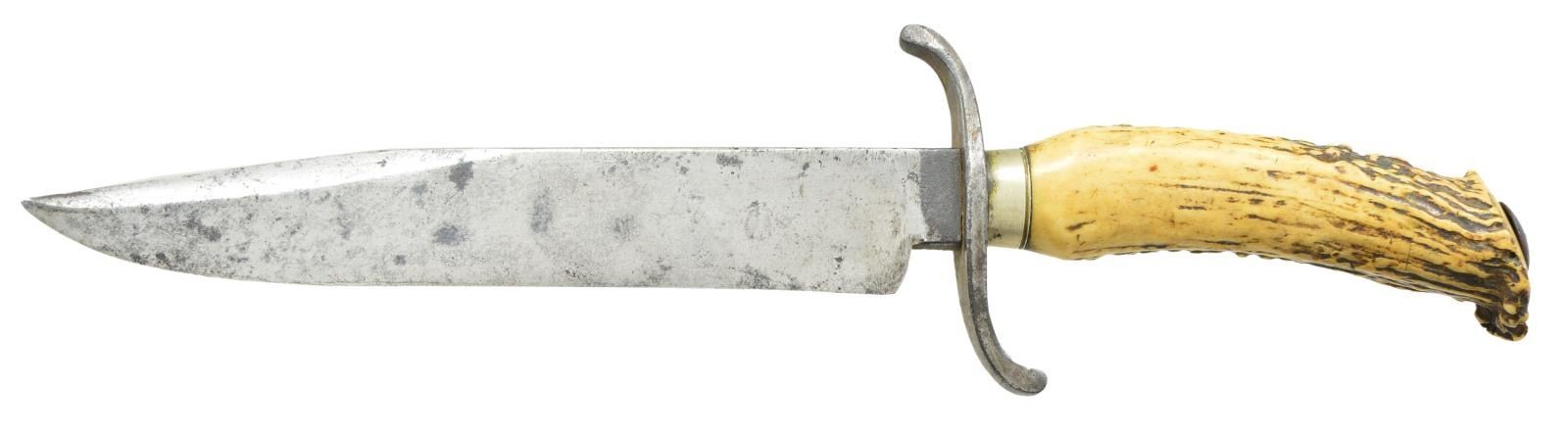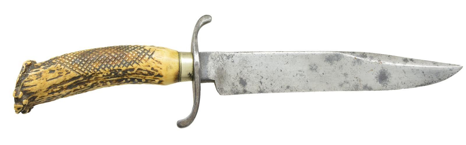 13.25”overall, 8” heavy saber ground clip point blade, .35” thick at ricasso, 3.5” partially sharpened clip Unmarked but distinctive & unique Hassam form with 3.75” iron “S” shaped crossguard, large convex iron capstan rivet, German silver ferrule and well fitted crown stag grip, grip is also nicely checkered on this example for even better fit. Several Hassam bowies have inscribed sheaths to Boston area soldiers. Unfortunately, this fine survivor is missing its sheath. CONDITION: very good overall, gray/bright blade with staining and light pitting. Crown stag grip has had worn patina. (02-19367/JS). $3,000-5,000.