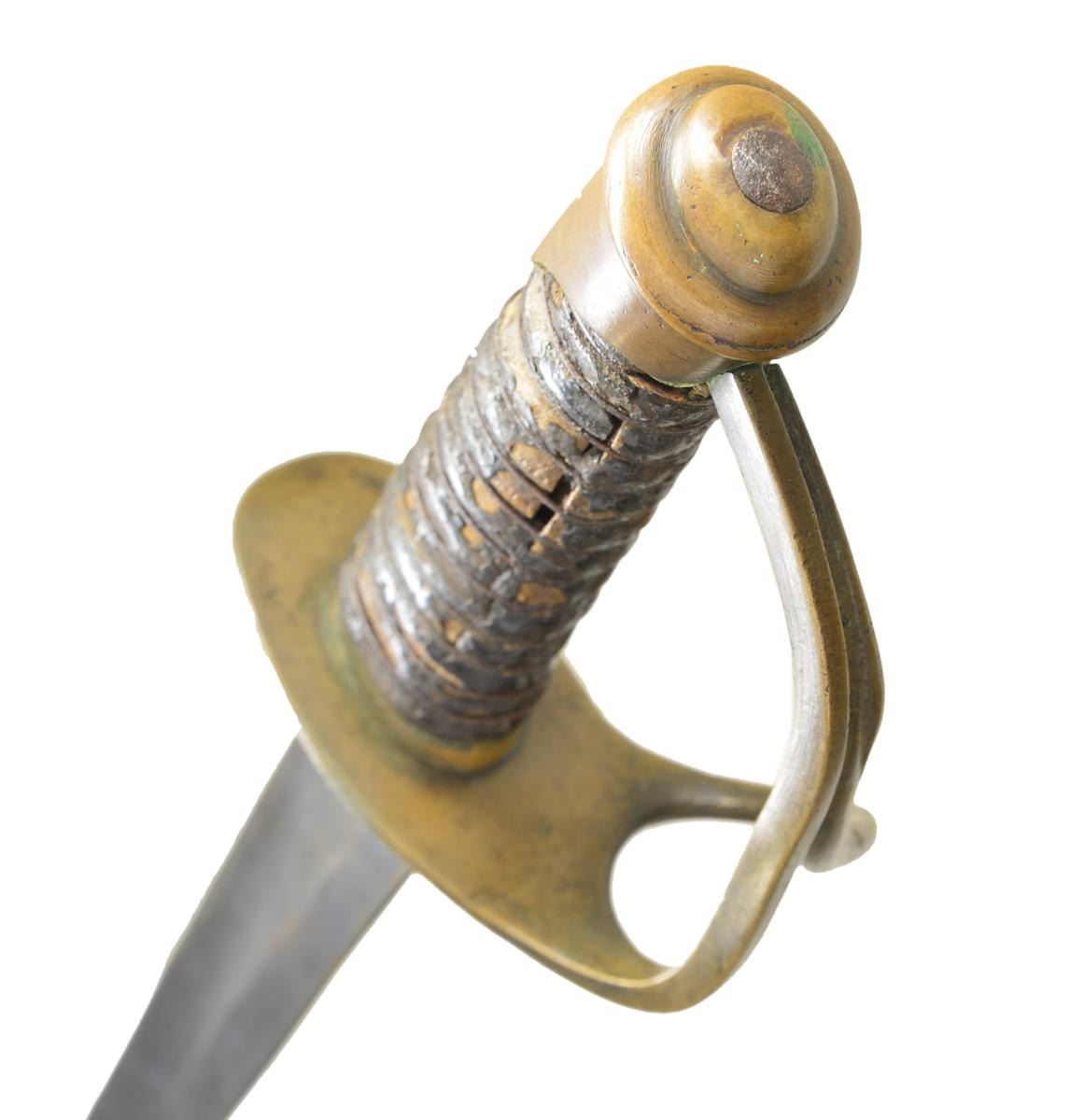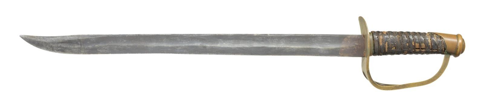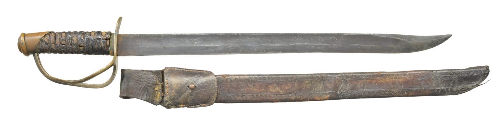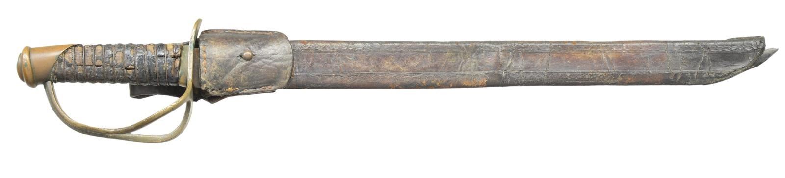 WITH ORIGINAL SCABBARD. 24.5” overall, 19” clip point blade. This knife was for many years in the extraordinary Confederate edged weapon collection of Fred Edmonds. His letter accompanies this lot stating that this is a product of the Atlanta Saber Manufactory and not KG&K. Regardless, it is the best example ever to surface. On page 108, of “Confederate Bowie Knives” is shown another example of the possibly 20 survivors accounted for. Most are rough and this is only example documented with original scabbard. Text states: “Some question remains as to whether swords with this hilt form are a product of the Atlanta Saber Manufactory or KG&K. Well known for their Confederate swords, these factory modified sword-bowies are the only known knives made by Kraft, Goldschmidt, & Kraft. At first glance appearing to be nothing more than one of their cavalry sabers cut down to knife size, a closer look reveals something else. The grip, ferrule and pommel are those of a Saber, only the guard was cast with two branches instead of the usual three. A third branch has not been removed. All extant examples of this form are identical, even down to the same grind modifications on the clip point and identical blade lengths. While the blades may have originally been intended for use on sabers, all of these Bowies left the factory in knife form.” CONDITION: very good overall, “attic as found”. blade has smooth iron patina with staining and light pitting, brass hilt has deep olive/copper patina. carved wood grip retains about 80% of its original leather which much is dry and flaking with tight original iron wire wrap. The tooled brown leather scabbard is sound with craquelure and open seam at tip. The original belt loop is attached with small brass frog button, seam on one side is unsewn. Belt loop has old wire repair where thread broken. (02-19074/JS). $6,000-8,000.