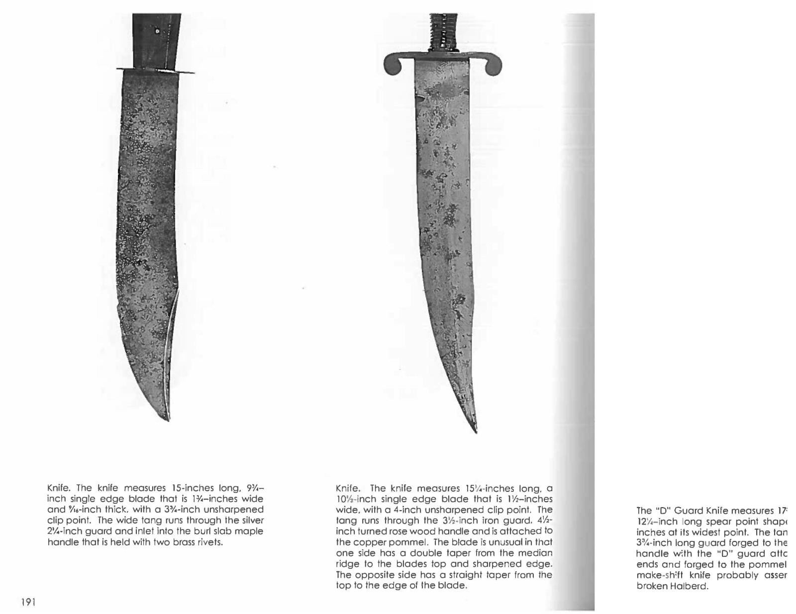 KNIFE. 15” overall, 9.25” clip point blade, very thick .5” at ricasso, 1.6” wide at ricasso widening to 1.8” near clip which is nicely beveled, 2.25” oval coin silver crossguard. Curly maple slab grips incase the tang which is attached with 2 small brass pins. CONDITION: very good overall, smooth gray blade, handworn wood patina. PROVENANCE: This well made early bowie is pictured on page 191 “Accoutrements IV” by Jim Johnston. (02-16791/JS). $1,500-2,500.