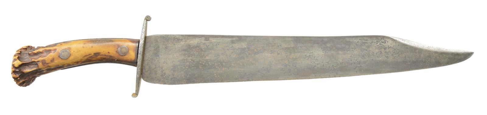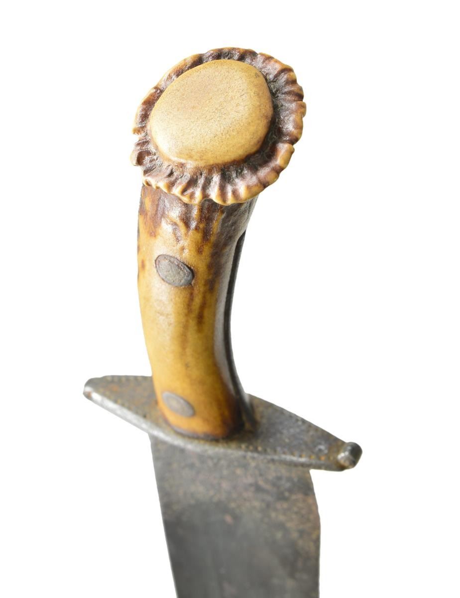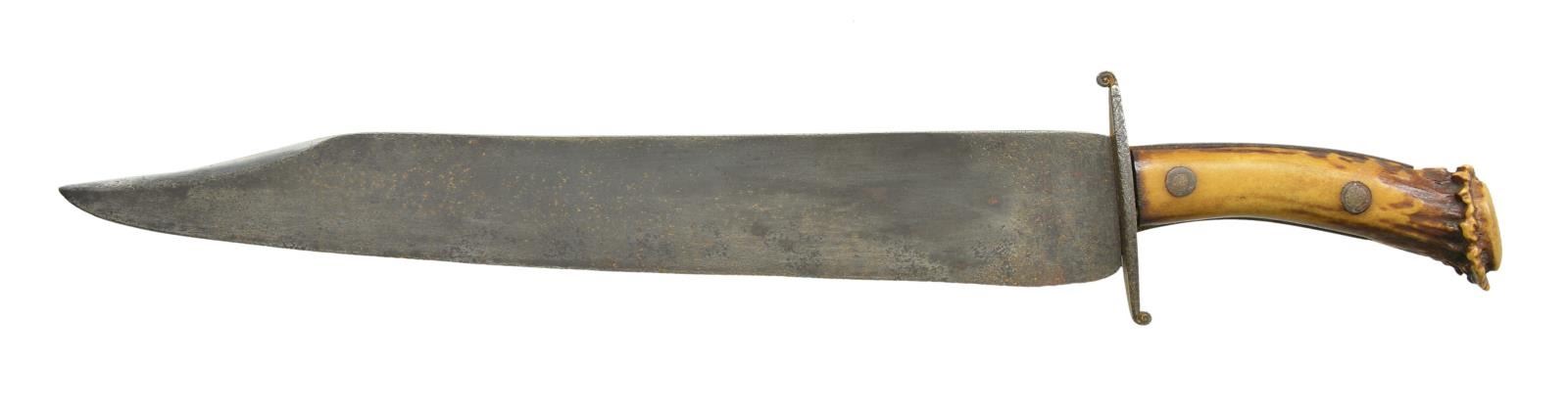 17.5”overall, 13” sharpened clip point blade, crown stag grip retained by 2 iron pins & washers, 3.25 narrow decorated “S” shaped crossguard, well used but still very sharp. CONDITION: good very good overall, iron patina with pitting, stag grip Has hand worn dark patina. (02-18183/JS). $2,000-3,000.