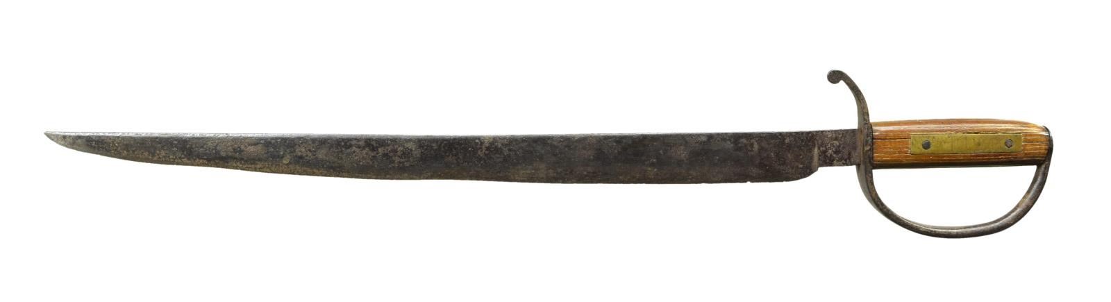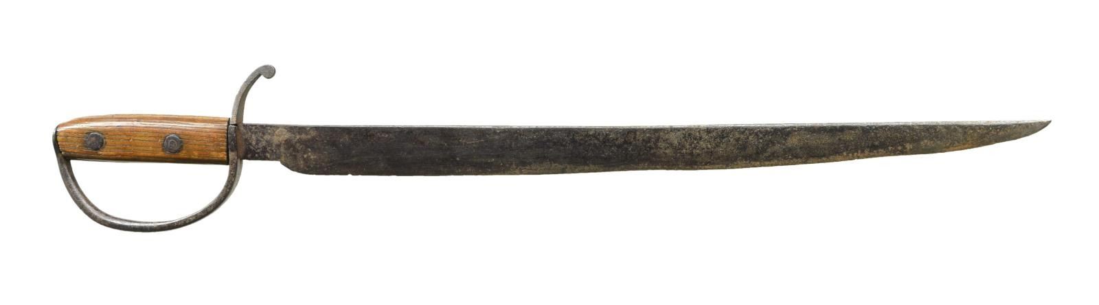 Overall length: 29". Blade length: 23 1/2". A truly wonderful, blacksmith made Confederate bowie knife by an accomplished knife maker. Plain, hand forged blade with a plain, hand forged iron D guard style hilt featuring a turned down quillon. 1 Piece wood grip with 2 iron rivets & a 3" x 1/2" brass plate on 1 side. No sheath. CONDITION: blade & hilt have a dark ancient patina. Grip shows moderate wear with a few cracks as a result of the wood drying. PROVENANCE: Estate Collection of Jack Verret Sr. (02-16490-2/BF). $1,500-2,500.