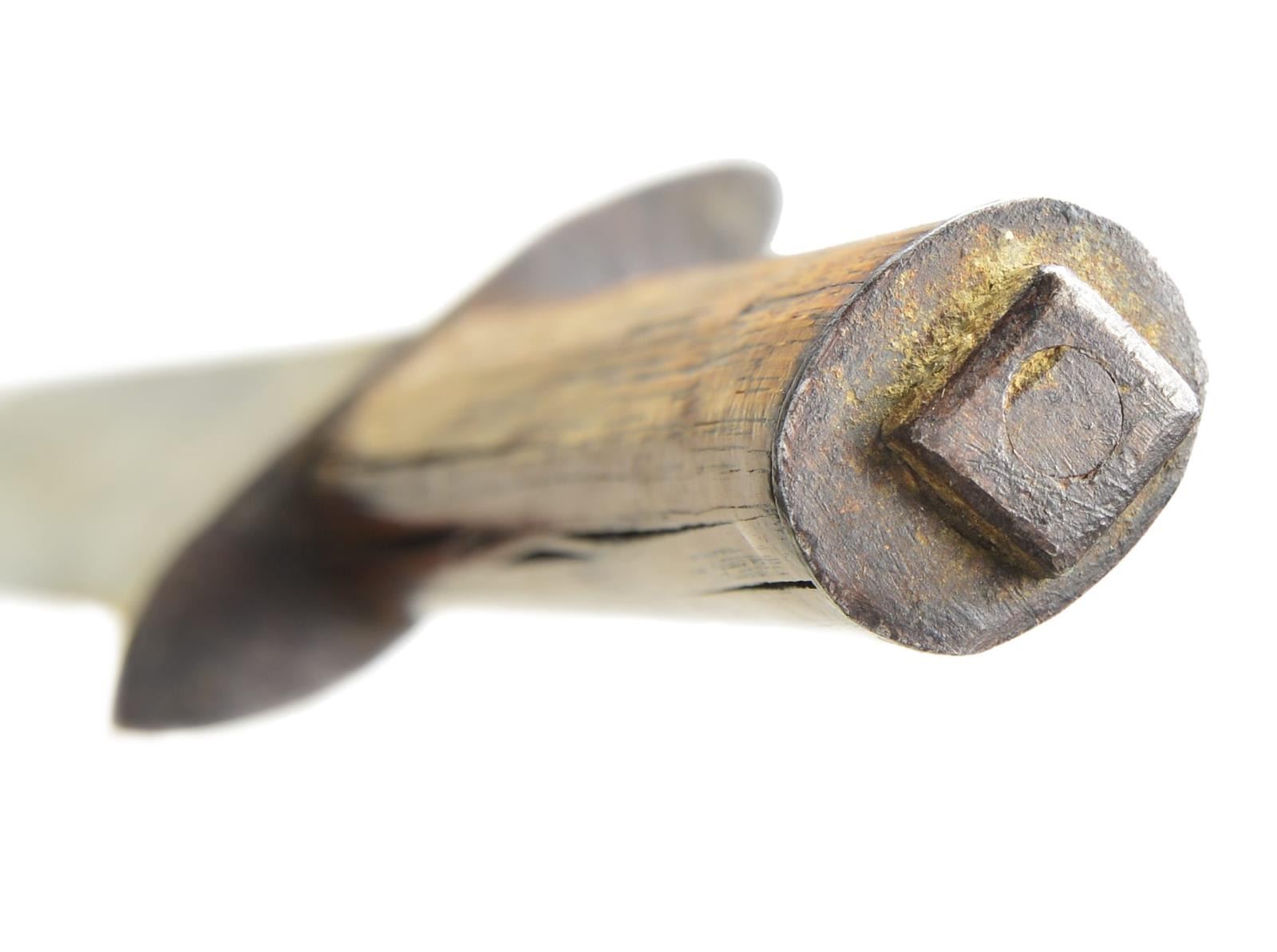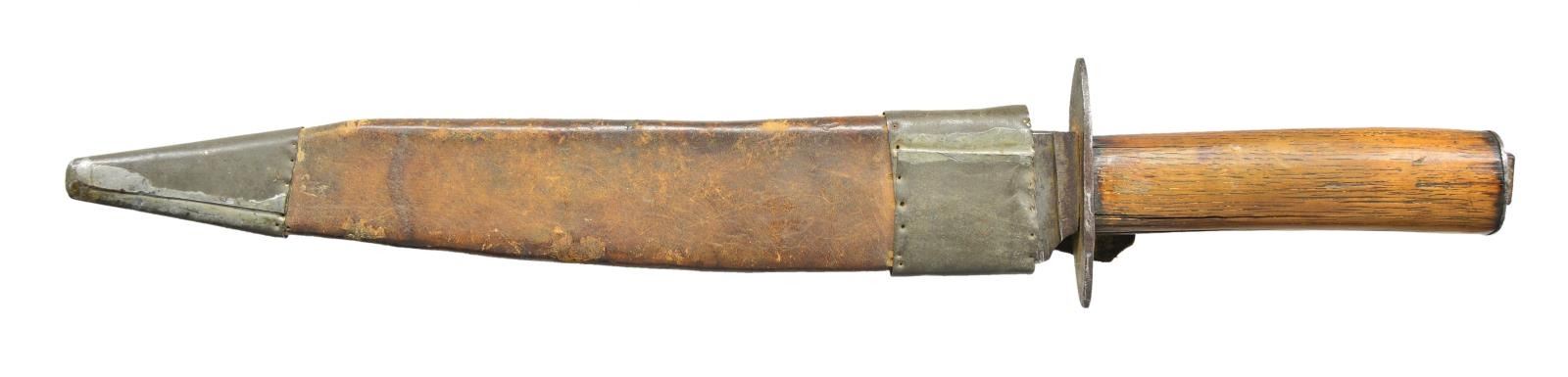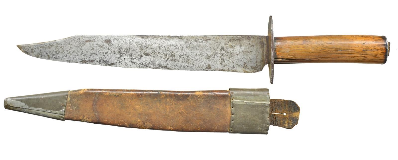 16” overall, 11” clip point blade, .35” thick meaty fighting knife. wood grip, oval pommel cap with hand forged nut like seeing on some Mississippi maker marked knives. Sheath has tin throat and tip, attached leather loop. CONDITION: good very good overall, blade has seen some use with sharpening, stained and pitted, sheath shrunk with half inch gap between throat and 3” iron crossguard. PROVENANCE: Pictured on page 189 “Accoutrements IV” by Jim Johnston. (02-18173/JS). $2,000-3,000.