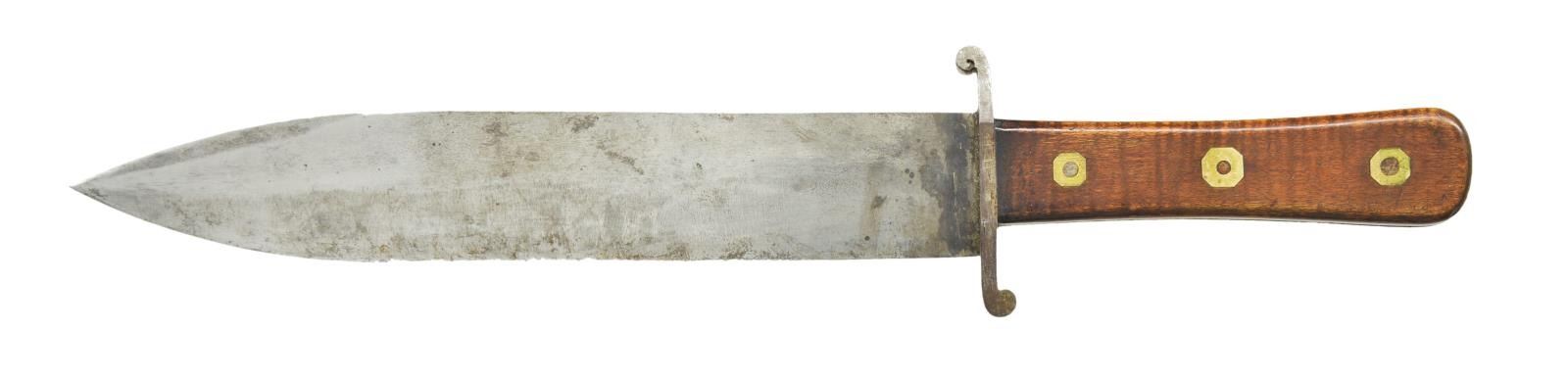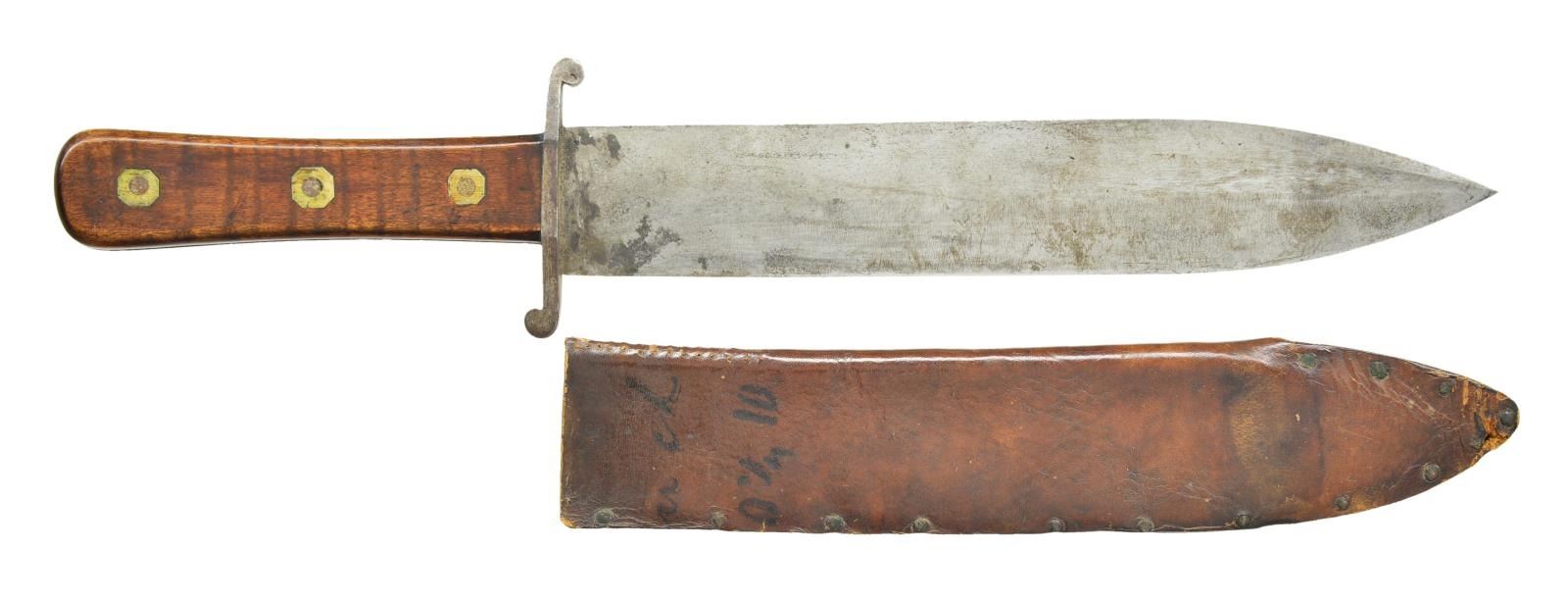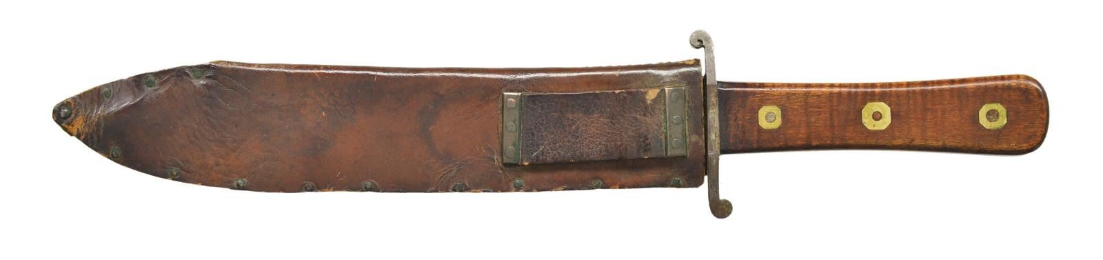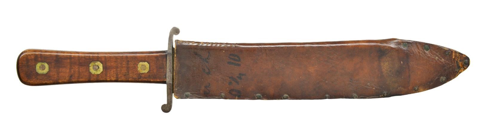 WITH ORIGINAL SHEATH. 13.5” overall, 9” spear point with 2.5” unsharpened clip, 2.75” sculptured “S” crossguard, full tang, striped maple grip slabs iron pinned with German silver washers, brown leather sheath pinned at edges, belt loop pinned with brass reinforcement strips. This elegant knife was made by a true craftsman in every aspect, blade, handle, and sheath. Knife has survived in beautiful “as found” condition. CONDITION: very good to fine overall, blade is gray/bright with original sharpening marks still very sharp edge, several small nicks in blade, grip retains much of old varnish finish, brown leather sheath is also fine, bending and scuffing at tip. Partial ink text on sheath possibly shows leather was repurposed. PROVENANCE: Pictured on page 136 “Accoutrements V” by Jim Johnston. (02-18177/JS). $2,500-3,500.