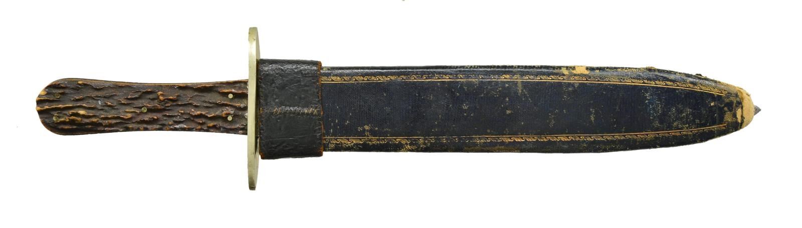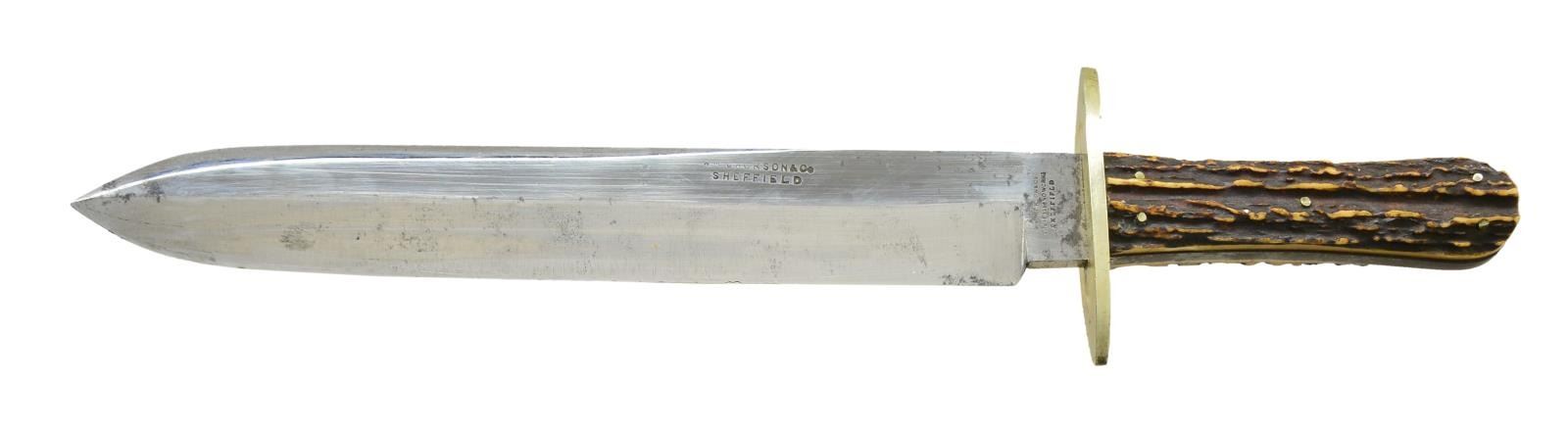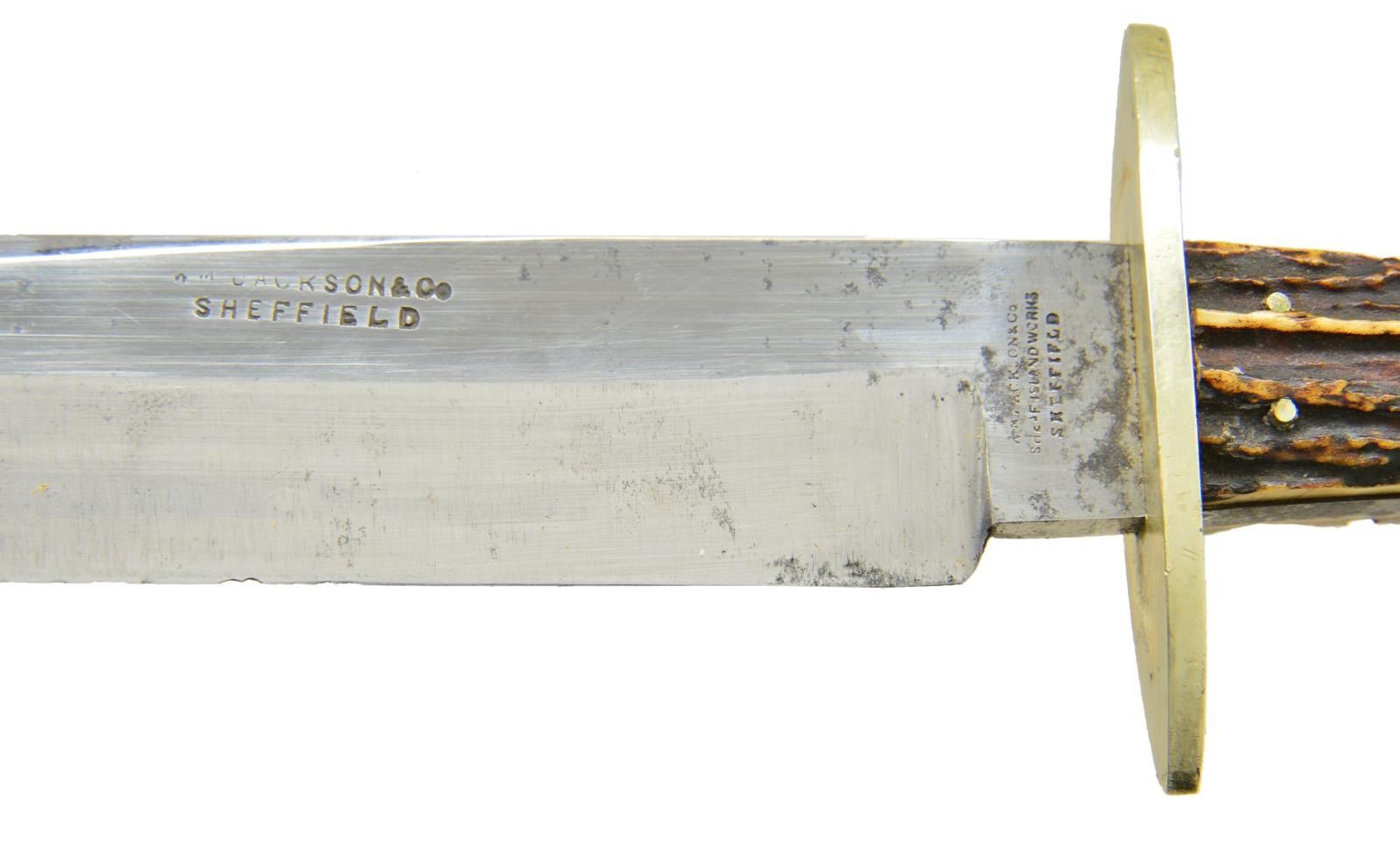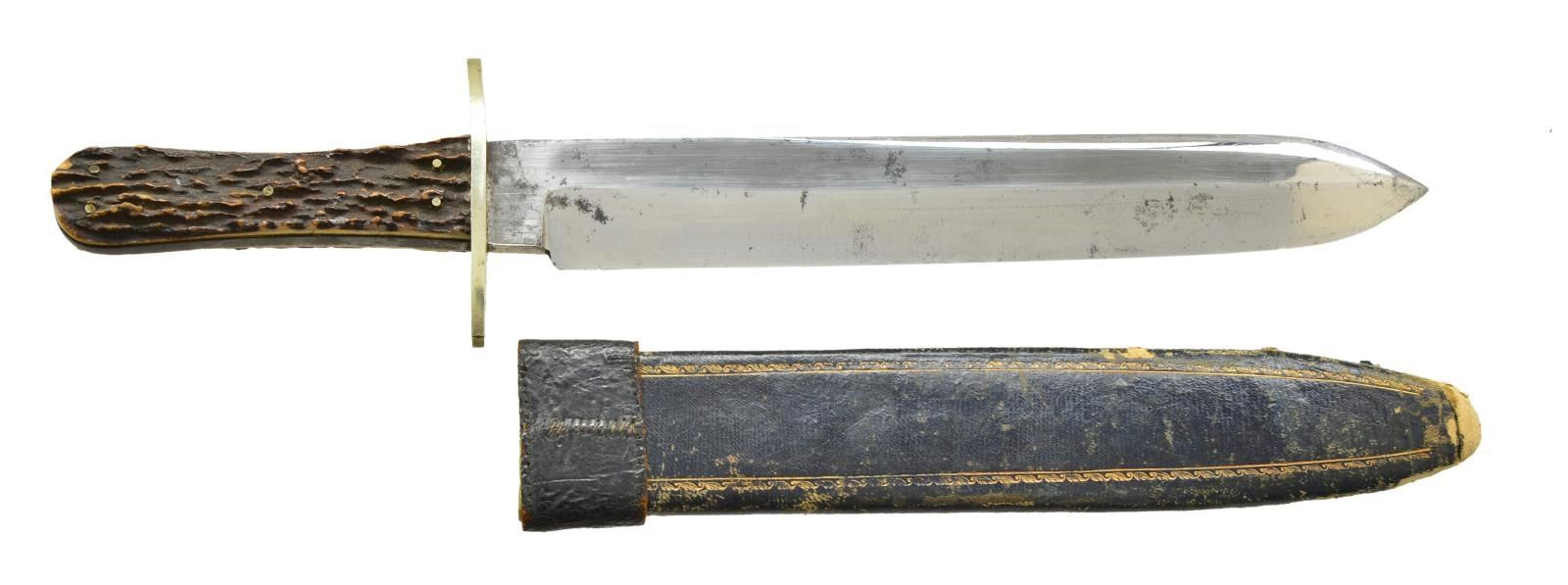 14” overall, 9.75” spear point blade maker marked on ricasso & longitudinally on blade, like their “Rio Grande Camp Knife” but just “WM JACKSON & CO / SHEFFIELD”, 3” German silver cross guard, pinned stag slab grip, original gold embossed decorated veneered cardboard scabbard. CONDITION: knife is fine overall, blade retains most of its original polish & luster, about a dozen small nicks in cutting edge. Sheath scuffed and missing tip, original German silver throat has leather collar sewn over. PROVENANCE: From the Lifelong Collection of Glen E. Mattox. (02-18399/JS). $800-1200.