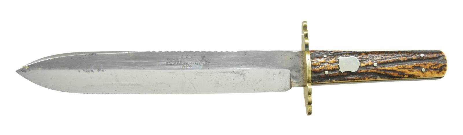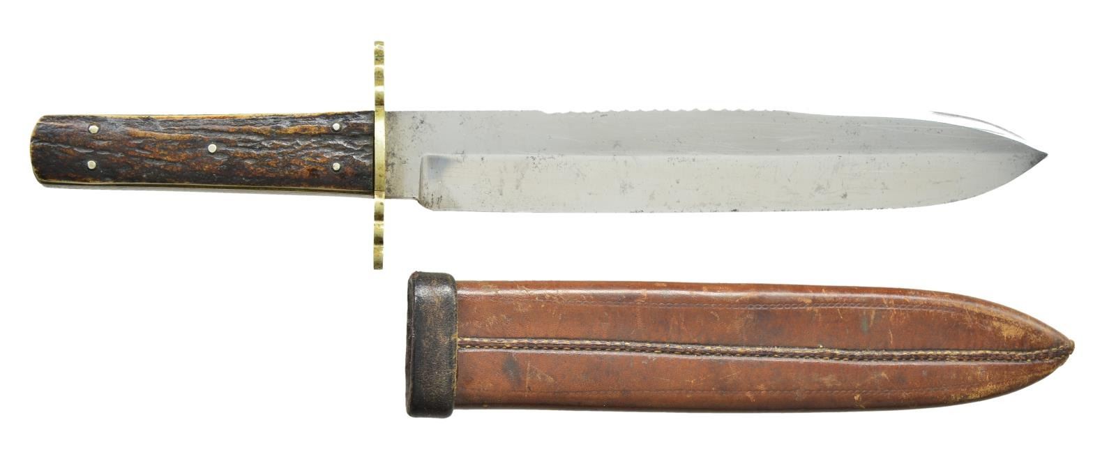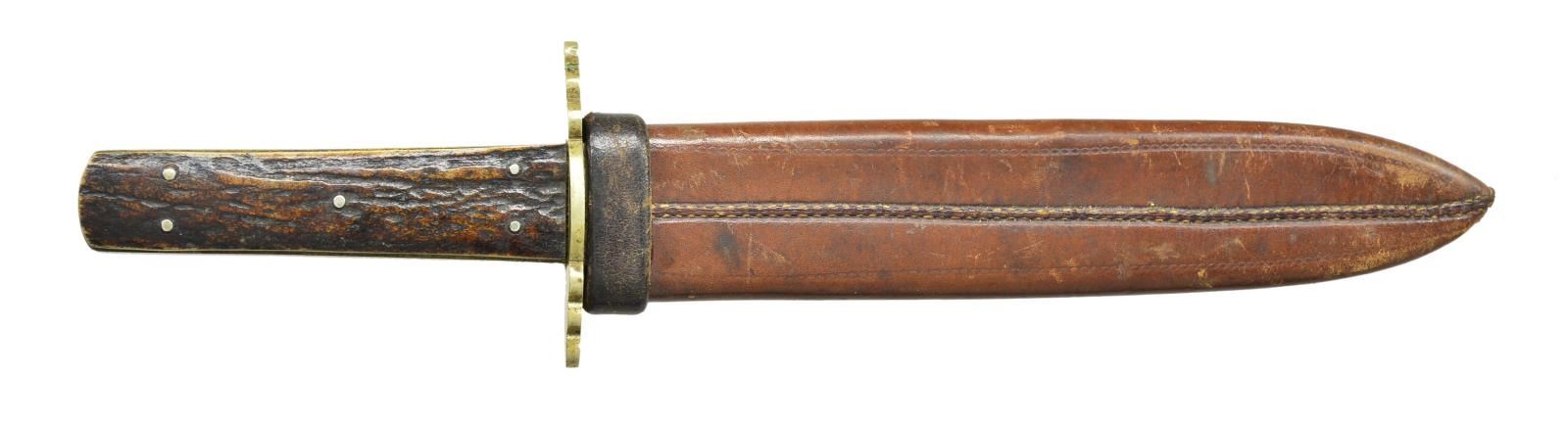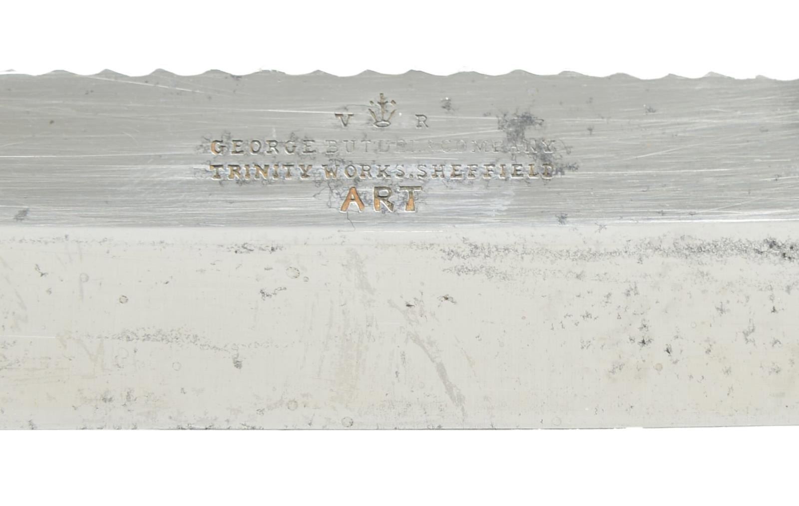 11.75” overall, 8” spearpoint blade, 3” grooved sawback top, “GEORGE BUTLER & COMPANY / TRINTYWORKS SHEFFIELD / ART” with “VR”cypher, stag slab grips, sculptured 3” German silver crossguard, original brown leather sheath with belt loop. CONDITION: very fine overall, blade retains most all of its original polish and lustre, scabbard scattered cosmetic scuffs and scratches. PROVENANCE: From the Lifelong Collection of Glen E. Mattox. (02-18527/JS). $600-800.