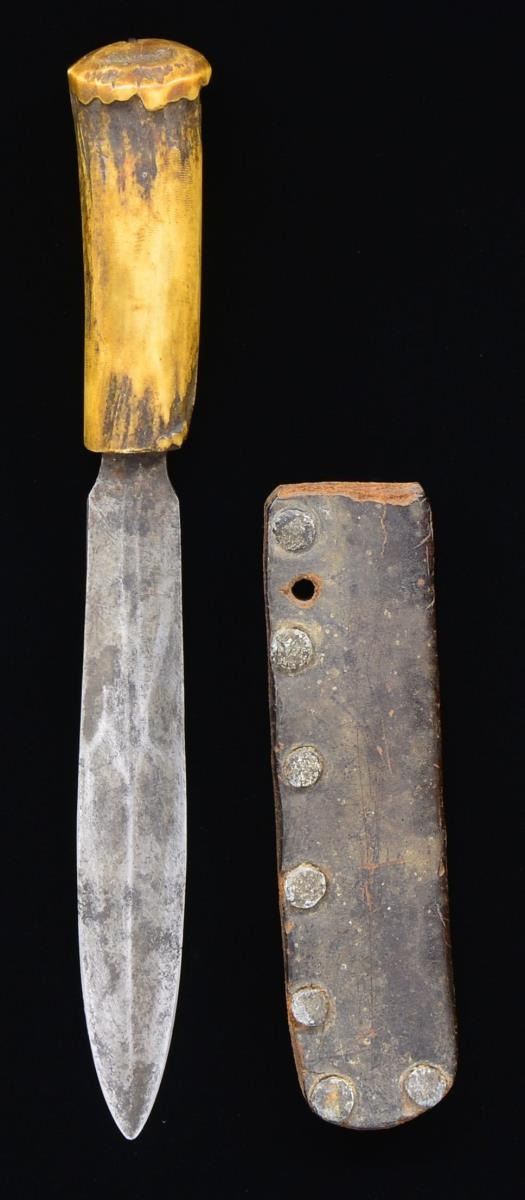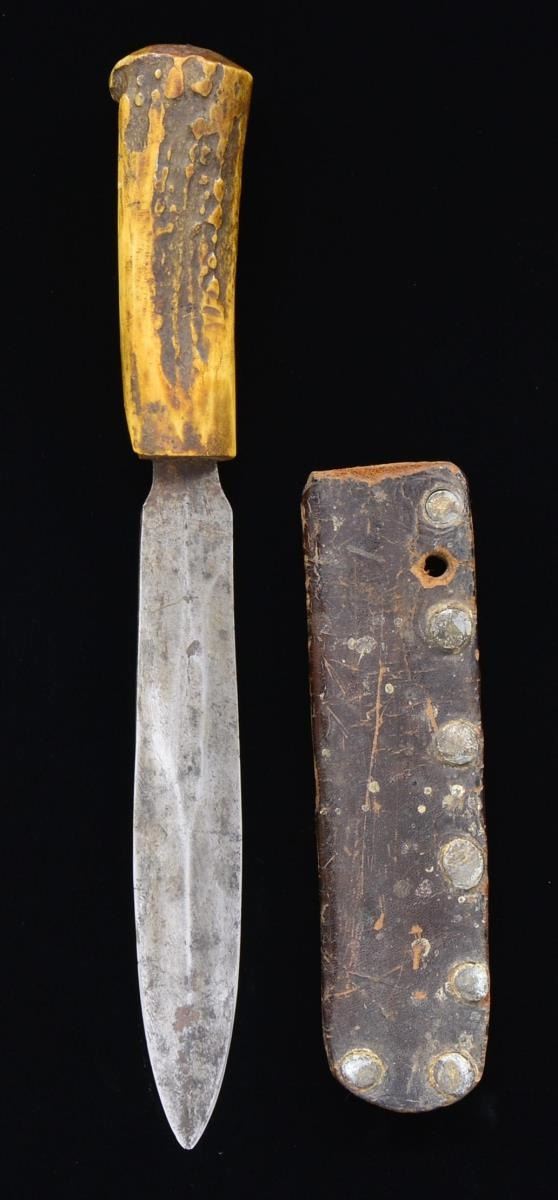 DAGGER. 10” overall, 6” sharp spear point, crown stag grip with tang crimped over at top, well balanced heavy dagger, sheath is folded over heavy leather with lead rivets like seen on many Confederate knives. CONDITION: very good “as found”. (02-16799/JS). $400-600.