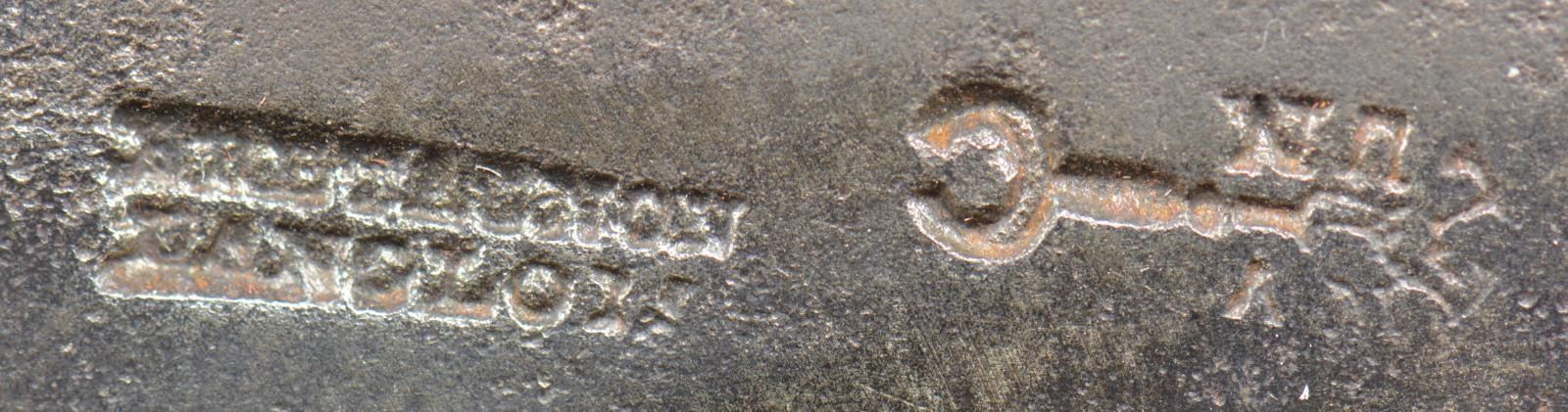 8.5”overall opened, 3.5” curved blade, polished stag grip slabs. Maker mark indiscernible as is logo. Knife is typical of excavated pruners from Revolutionary War Era sites. CONDITION: good to very good overall, iron patina and pitting, markings discernible. (02-18180/JS). $300-400.