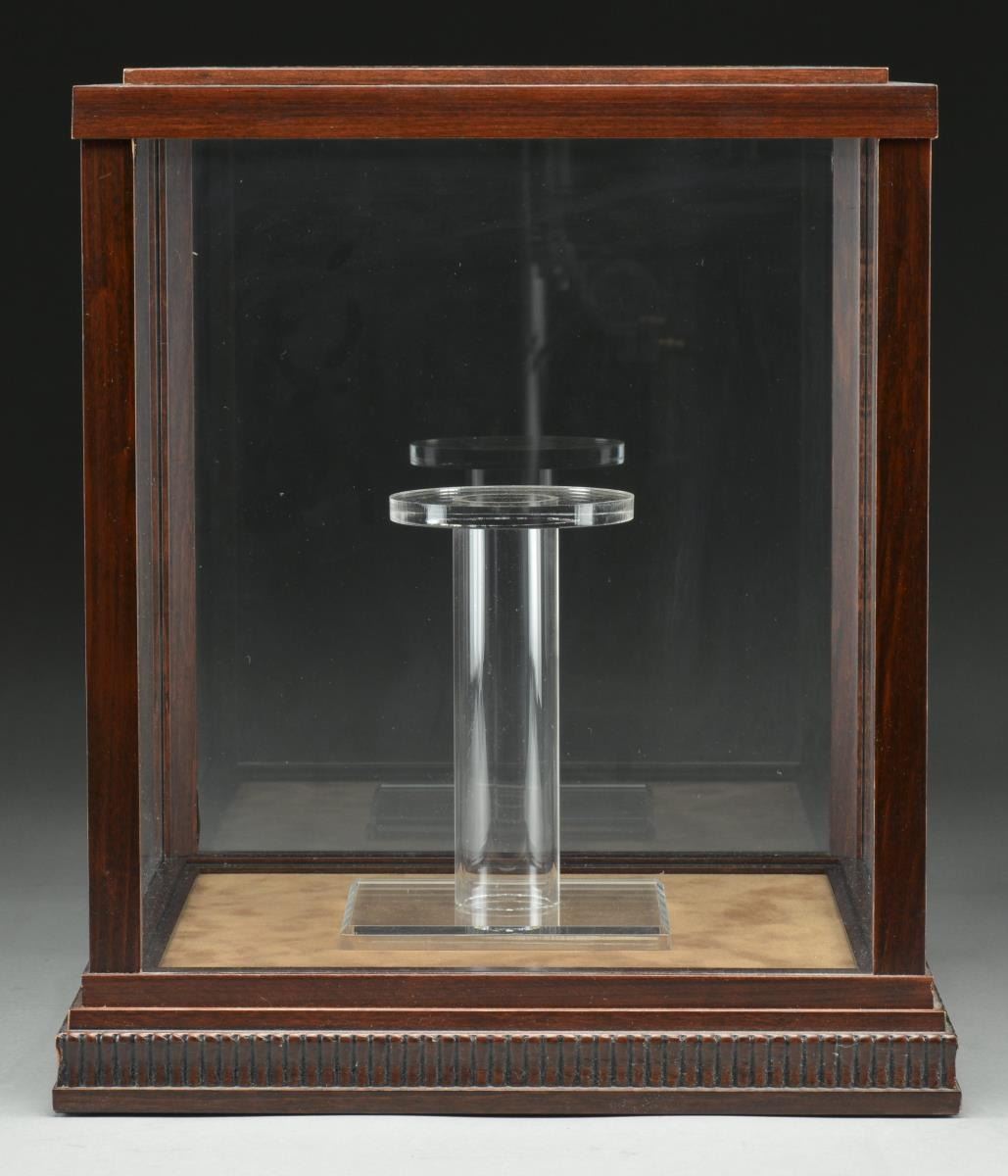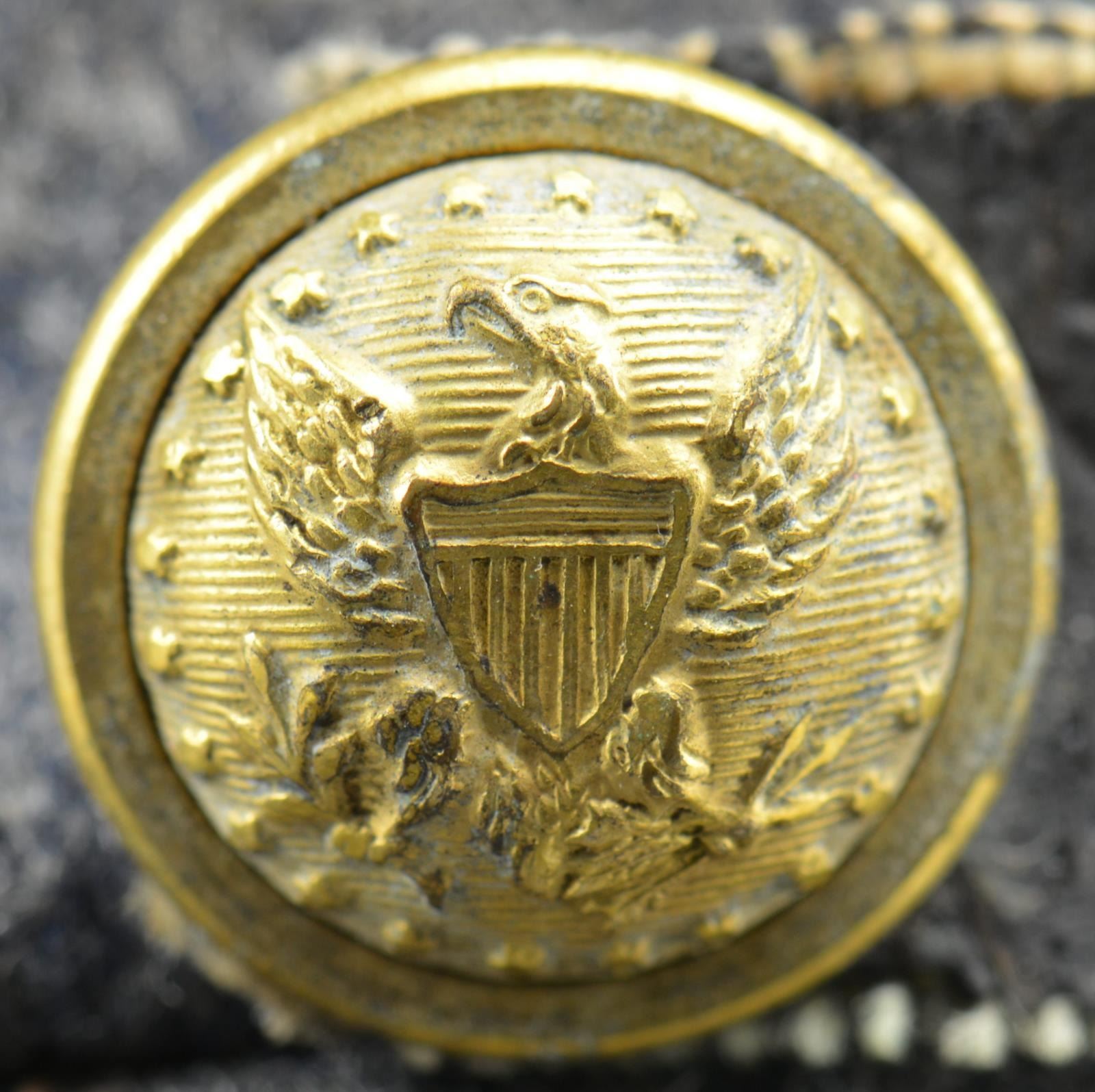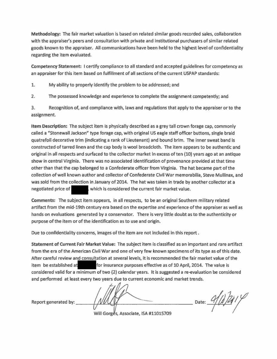 Tall Confederate forage caps have long been known among collectors as "Stonewall Jackson" style due to Jackson's wearing same tall style cap. 4" high in front, 8" central seam in back. Made with cadet gray wool broadcloth, one strand bullion trim & quatrefoil (lieutenant rank), tarred linen 1.5" sweatband, tarred linen sewn binding on visor edge, tarred linen chin strap attached with two 15mm eagle staff buttons. Crown is lightly quilted and lined in lightweight cotton single ply fabric. Part of Steve Mullinax collection for many years. He purchased it at Virginia Civil War show from a gentleman who brought it in not knowing who in his lineage as to who would have worn it. UNNATACHED ACCESSORIES: copy of 2014 consulting report by Will Gorges as to value and authenticity. Custom display case with stand, custom "pillow" that's fits interior of cap. CONDITION: Cap appears original and authentic in every regard, no noted restoration or new stitching. Wool body has minor moth damage as seen in the few scattered small holes. Sweat band, chin strap, lining all tight & in place. PROVENANCE: Cullen Smith estate collection. (02-17253/JS). $15,000-20,000.