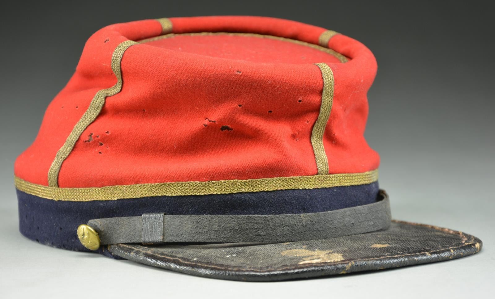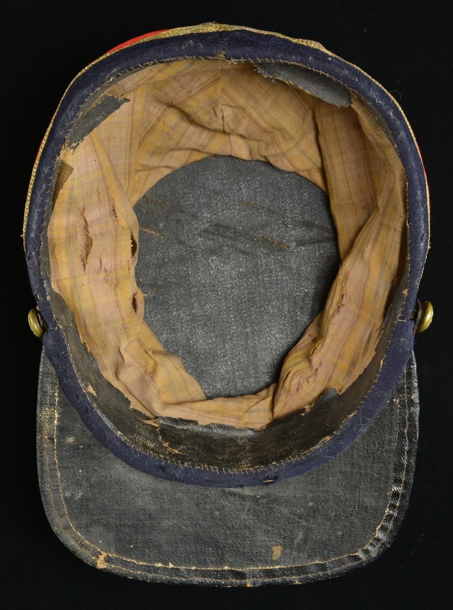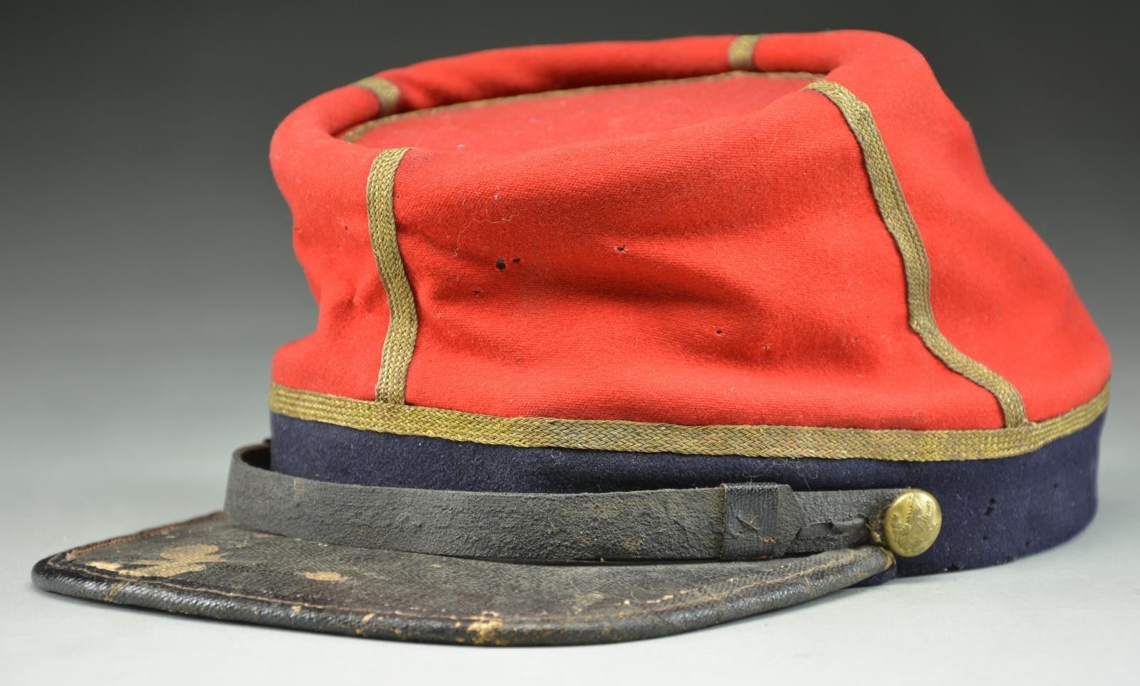 ARTILLERY OFFICER’S RED KEPI. A splendid example of a Confederate Civil War Artillery Officer’s kepi made of red wool broadcloth. There is a dark blue band of similar cloth & weave at the base of the crown. The kepi measures 6 1/2" from the lower rear edge to the top of the crown, including the roll. It measures 3 5/8" from the lower front edge to the crown, including the roll. The dark blue band is 1" wide tapering to 1 1/8" at the rear seam. The diameter of the crown is 4 3/4", excluding the roll. There is 1/4" gold bullion trim covering the seam between the red & blue wool, as well as adorning the front, rear & sides of the kepi rising from the band to the crown. The outside of the crown is trimmed in 1/4" gold bullion tape. Pasteboard is used for a backing on the cap band and is also possibly used as a stiffener in the crown. The visor is made of tarred linen with a tarred linen sewn binding at the edge. The 1/2" chinstrap also appears to be stiff tarred linen with no buckle, but 2 slide adjustments. The chinstrap attaches to the band with 2 cuff-sized eagle general service buttons. The inside of the crown is also lined with the same tarred linen material. The sweatband is tarred linen, but much thinner than seen in the crown & visor. The lining is a wonderful folky cotton material showing an underlying plaid pattern utilizing tan, yellow, brown & light blue. This kepi is one of the finest Confederate Artillery kepis we have seen and every aspect of this kepi sings Dixie. Not only is the kepi visually attractive & impactful, its historic significance cannot be understated. CONDITION: the red & blue wool remain bright & vivid. There is scattered light mothing on the red crown & the blue band. The moth nips in no way compromise the integrity of the hat, but rather attest to its 160 year history and its hard life on the battlefields of the Civil War. The chinstrap & visor are quite strong, yet show expected wear. The sweatband appears nearly complete and has a few minor separations. The lining has ample sweat stains and shows some separation to the cotton material. (02-19579/BF). $7,000-10,000.