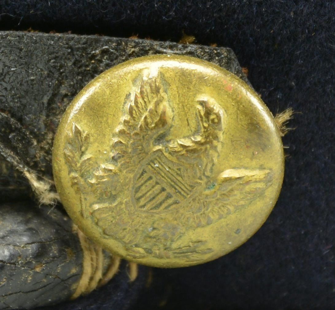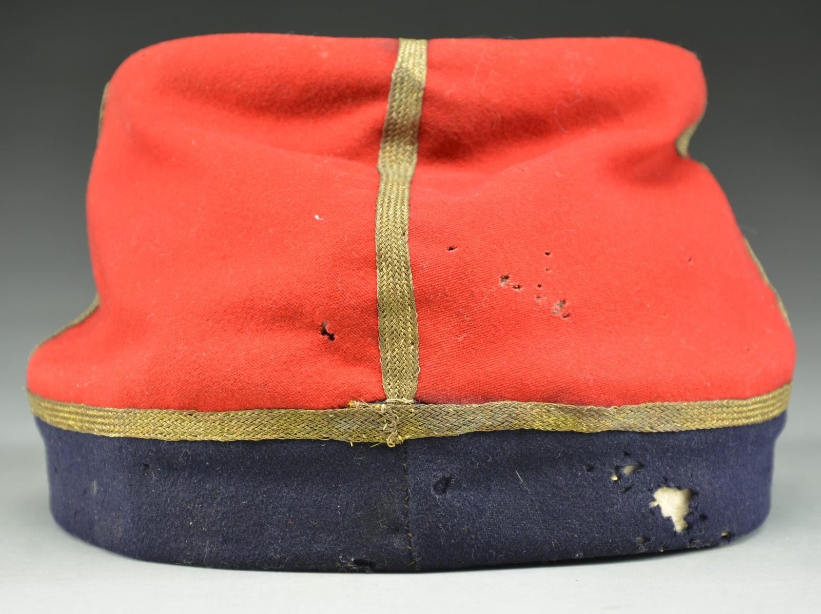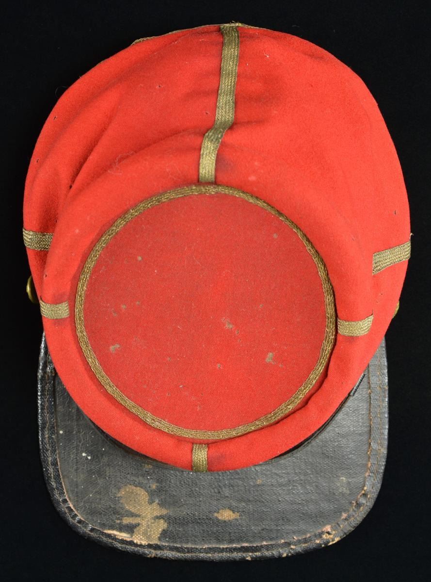 ARTILLERY OFFICER’S RED KEPI. A splendid example of a Confederate Civil War Artillery Officer’s kepi made of red wool broadcloth. There is a dark blue band of similar cloth & weave at the base of the crown. The kepi measures 6 1/2" from the lower rear edge to the top of the crown, including the roll. It measures 3 5/8" from the lower front edge to the crown, including the roll. The dark blue band is 1" wide tapering to 1 1/8" at the rear seam. The diameter of the crown is 4 3/4", excluding the roll. There is 1/4" gold bullion trim covering the seam between the red & blue wool, as well as adorning the front, rear & sides of the kepi rising from the band to the crown. The outside of the crown is trimmed in 1/4" gold bullion tape. Pasteboard is used for a backing on the cap band and is also possibly used as a stiffener in the crown. The visor is made of tarred linen with a tarred linen sewn binding at the edge. The 1/2" chinstrap also appears to be stiff tarred linen with no buckle, but 2 slide adjustments. The chinstrap attaches to the band with 2 cuff-sized eagle general service buttons. The inside of the crown is also lined with the same tarred linen material. The sweatband is tarred linen, but much thinner than seen in the crown & visor. The lining is a wonderful folky cotton material showing an underlying plaid pattern utilizing tan, yellow, brown & light blue. This kepi is one of the finest Confederate Artillery kepis we have seen and every aspect of this kepi sings Dixie. Not only is the kepi visually attractive & impactful, its historic significance cannot be understated. CONDITION: the red & blue wool remain bright & vivid. There is scattered light mothing on the red crown & the blue band. The moth nips in no way compromise the integrity of the hat, but rather attest to its 160 year history and its hard life on the battlefields of the Civil War. The chinstrap & visor are quite strong, yet show expected wear. The sweatband appears nearly complete and has a few minor separations. The lining has ample sweat stains and shows some separation to the cotton material. (02-19579/BF). $7,000-10,000.