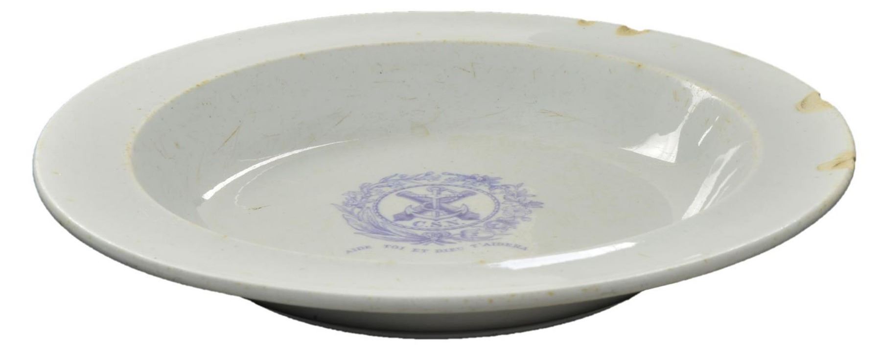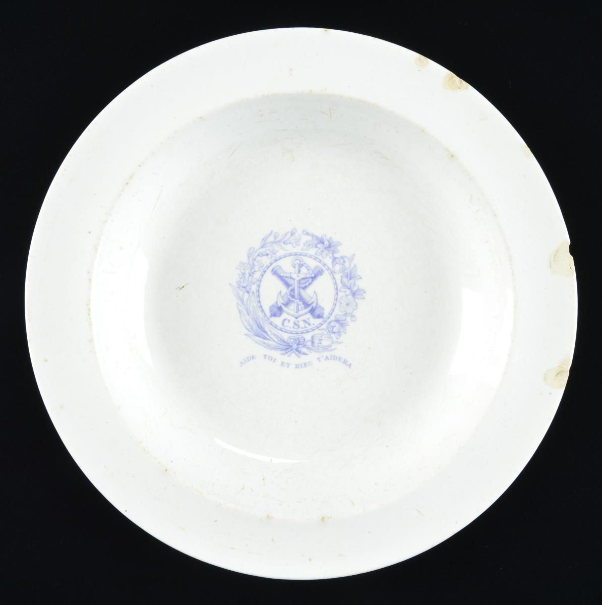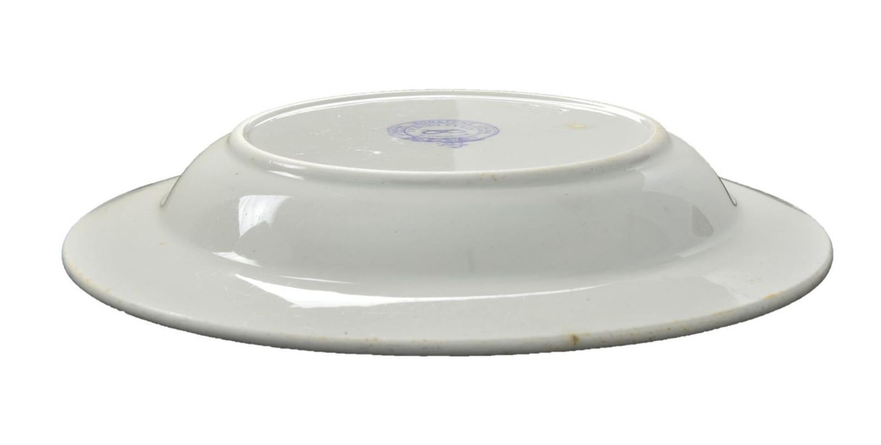 CHINA BOWL. 9” diameter, 1.25” deep, 2.5” blue CSN insignia of fouled anchor over crossed cannon surrounded by cotton and tobacco wreath (the wealth of the South), beneath is Confederate navy motto: “AIDE TOI ET DIEU T’AIDERA” translates “God helps those that help themselves”. Confederate Naval china has been sought & collected not soon after the war ended. Most pieces known are scattered among prominent museums and institutions, donated by Confederate naval officers or their families. Very few pieces have reached the collector market and these are only the 2nd & 3rd pieces to ever be sold at auction. Official Confederate Naval china is all made and bears the mark of “GENUINE IRONSTONE CHINA / E. F. BODLEY & CO / BURSLEM”. There is one identical soup dish in museum collection, a saucer with same decoration is attributed to CSS TEXAS. All confederate naval China pieces are rare. CONDITION: good very good overall, 4 chips on rim as can be seen in photos, makers mark and insignia are excellent. (02-19063/JS). $8,000-12,000.