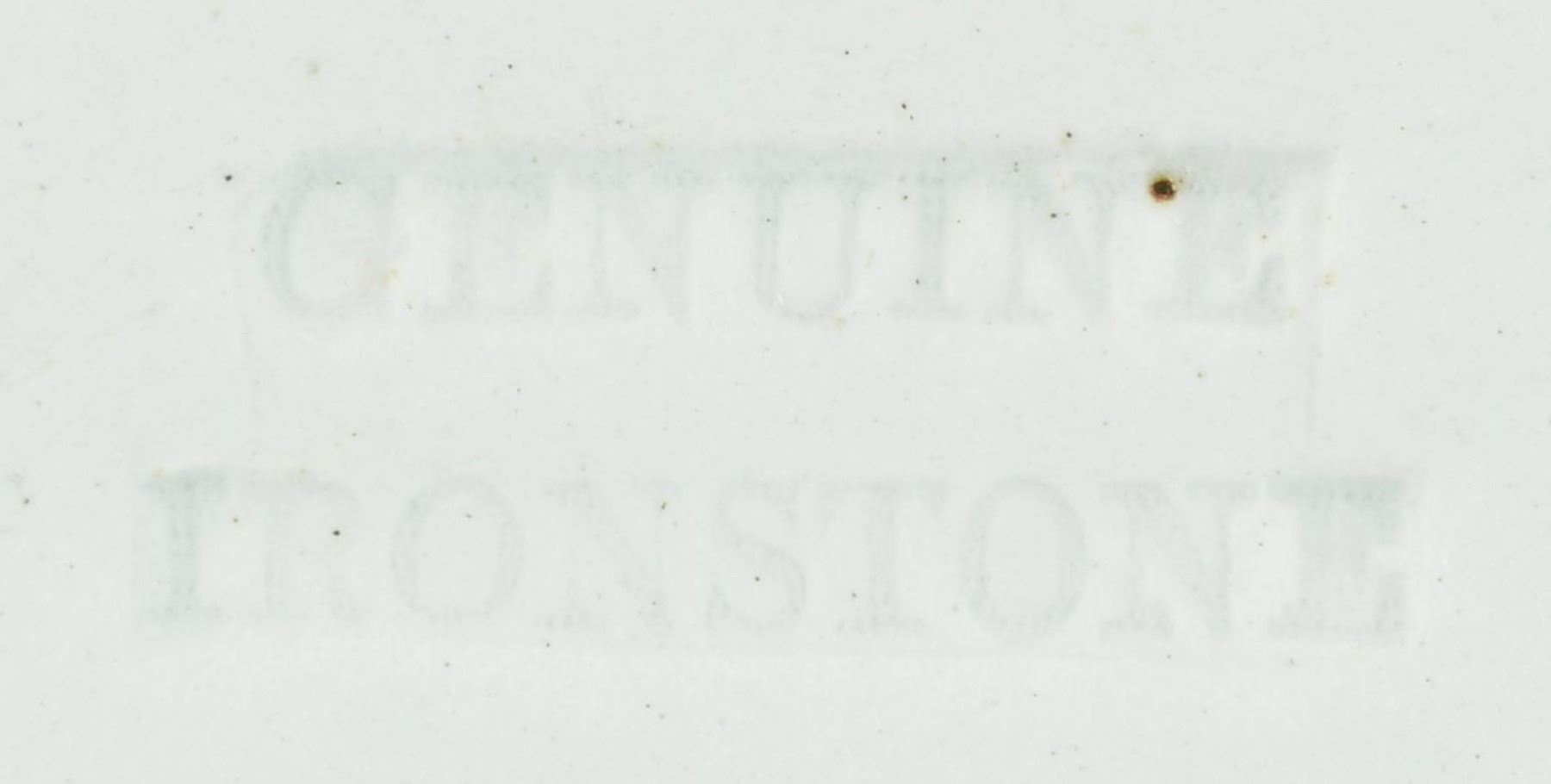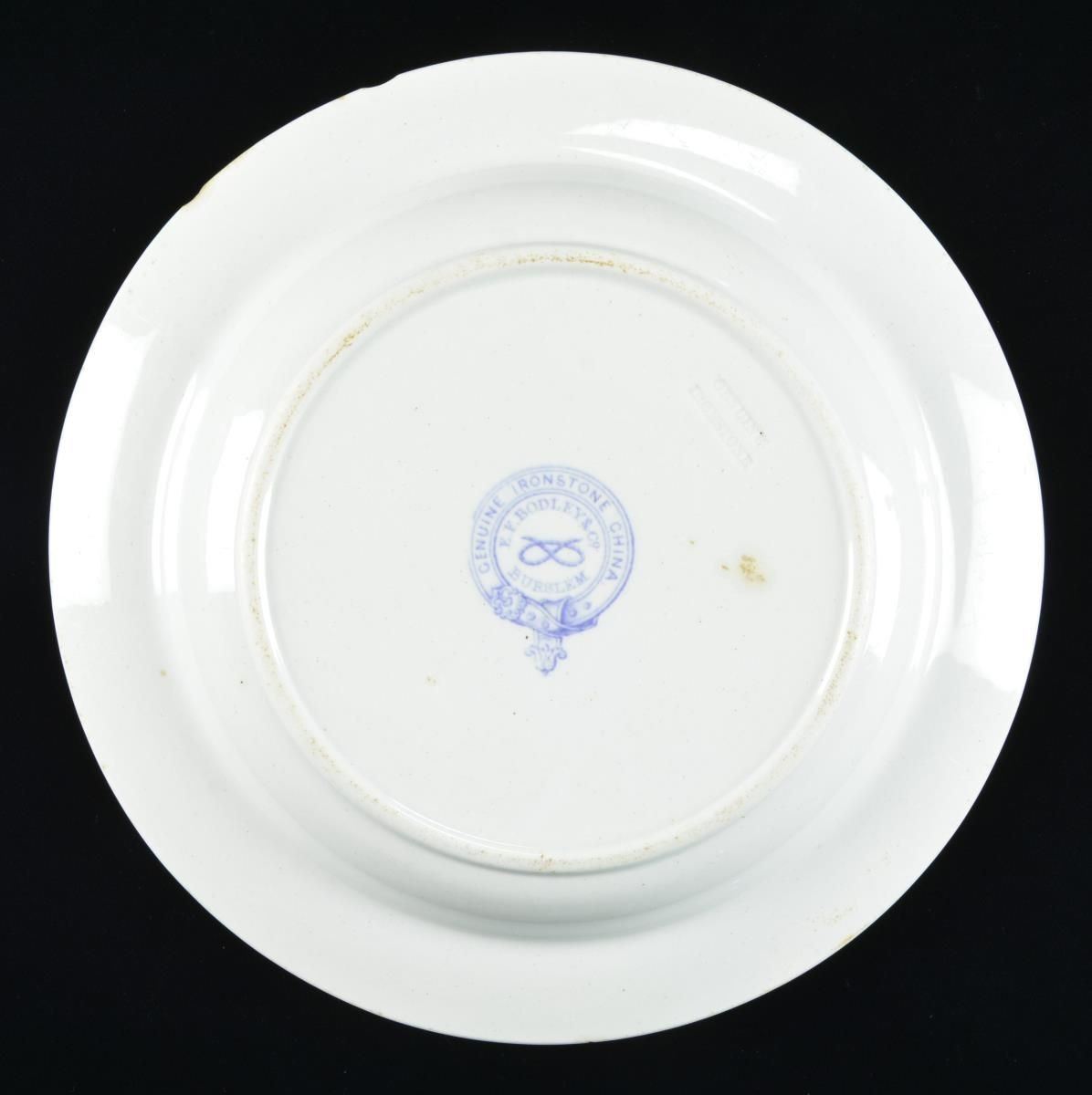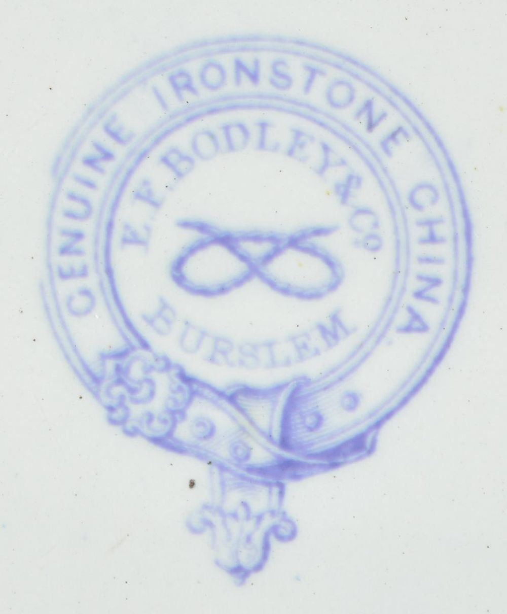 CHINA BOWL. 9” diameter, 1.25” deep, 2.5” blue CSN insignia of fouled anchor over crossed cannon surrounded by cotton and tobacco wreath (the wealth of the South), beneath is Confederate navy motto: “AIDE TOI ET DIEU T’AIDERA” translates “God helps those that help themselves”. Confederate Naval china has been sought & collected not soon after the war ended. Most pieces known are scattered among prominent museums and institutions, donated by Confederate naval officers or their families. Very few pieces have reached the collector market and these are only the 2nd & 3rd pieces to ever be sold at auction. Official Confederate Naval china is all made and bears the mark of “GENUINE IRONSTONE CHINA / E. F. BODLEY & CO / BURSLEM”. There is one identical soup dish in museum collection, a saucer with same decoration is attributed to CSS TEXAS. All confederate naval China pieces are rare. CONDITION: good very good overall, 4 chips on rim as can be seen in photos, makers mark and insignia are excellent. (02-19063/JS). $8,000-12,000.