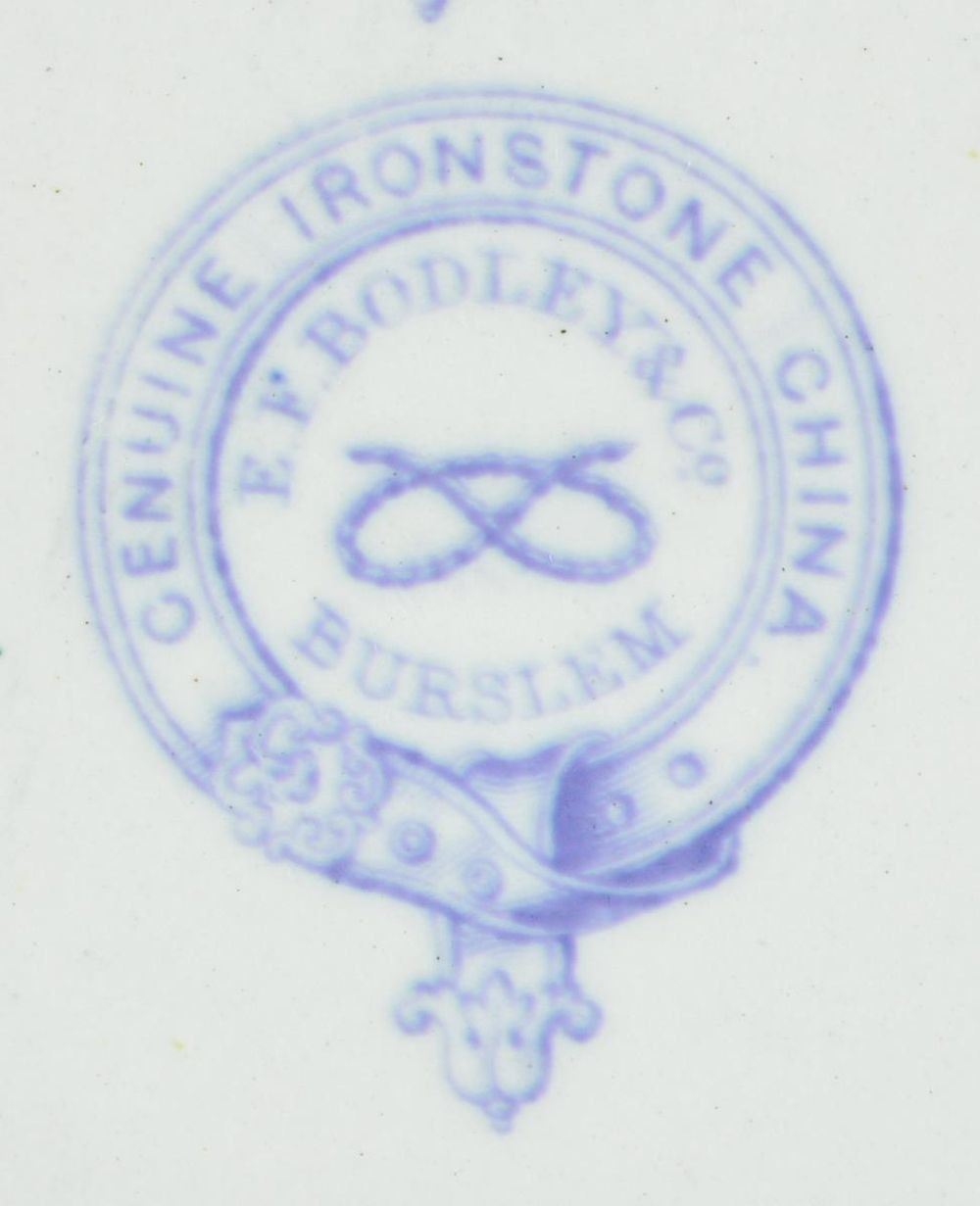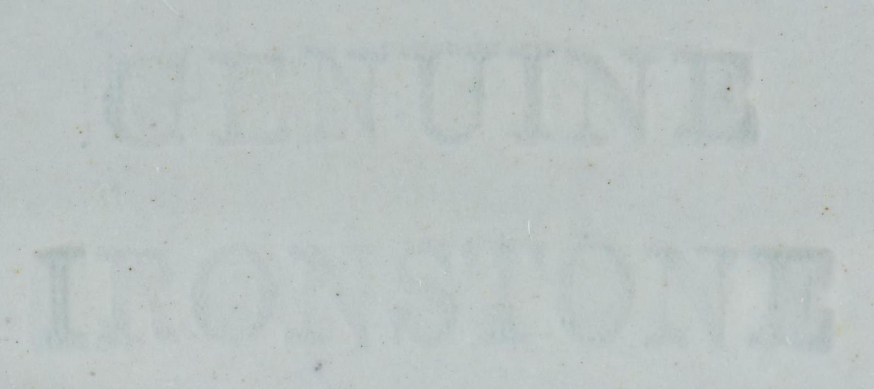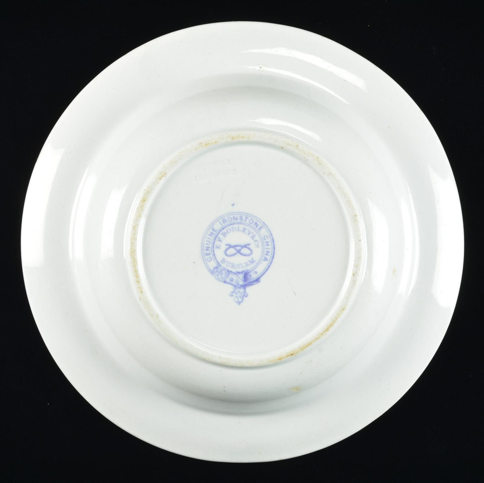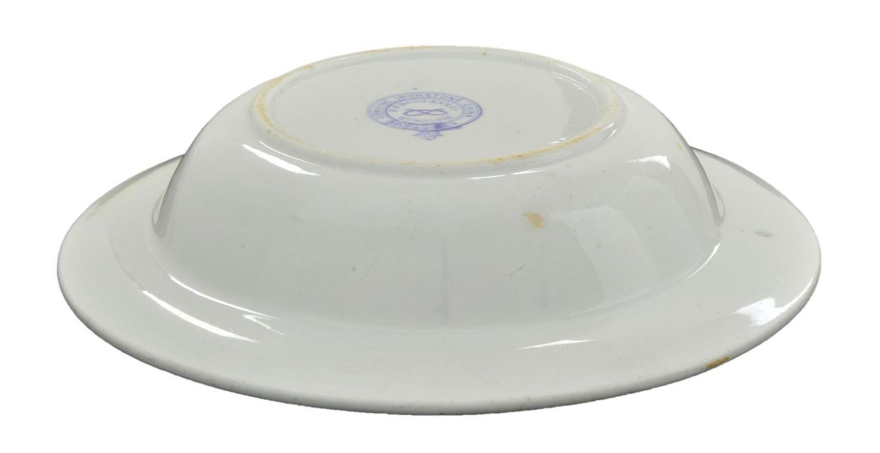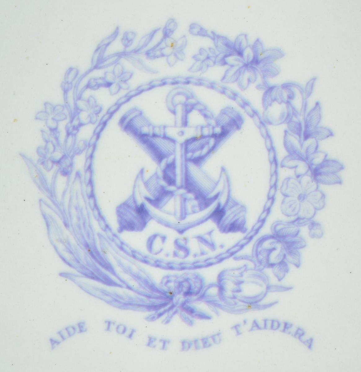 9” diameter, 2” deep, 2.5” blue CSN insignia of fouled anchor over crossed cannon surrounded by cotton and tobacco wreath (the wealth of the South), beneath is Confederate navy motto: “AIDE TOI ET DIEU T’AIDERA” translates “God helps those that help themselves”. Confederate navy china has been sought & collected right after the war ended. Most pieces known are scattered among prominent museums and institutions including Smithsonian, donated by Confederate naval officers or their families. Very few pieces have reached the collector market and these are only the 2nd & 3rd pieces to ever be sold at auction. Official Confederate Naval china is all made and bears the mark of “GENUINE IRONSTONE CHINA / E. F. BODLEY & CO / BURSLEM”. This is the only piece of this size and decoration known and in wonderful condition. All Confederate naval China pieces are rare. CONDITION: very good overall, makers mark and insignia are crisp. (02-19064/JS). $8,000-12,000.