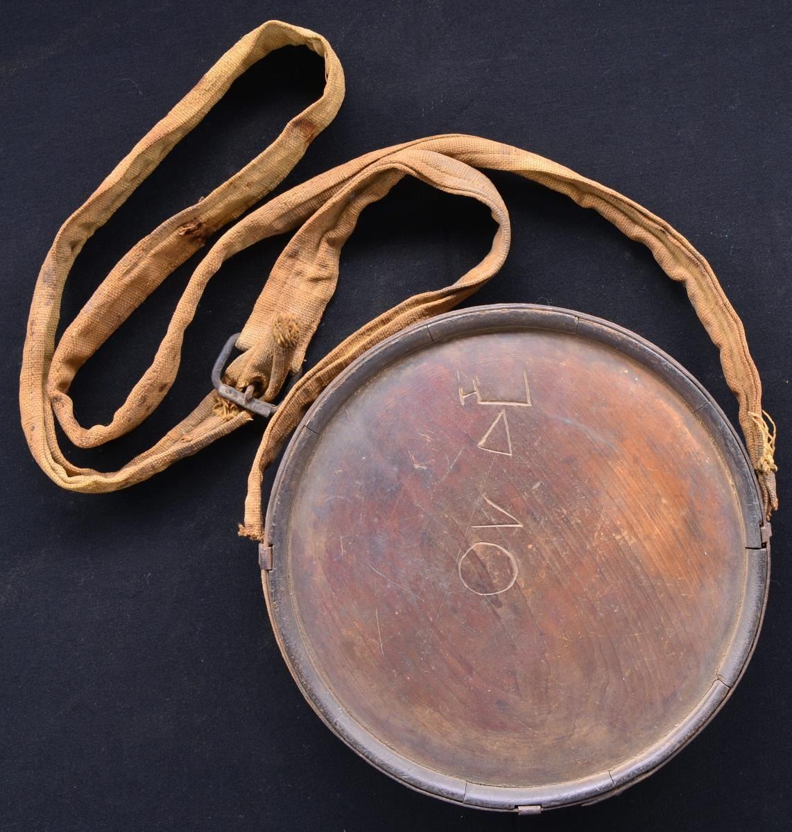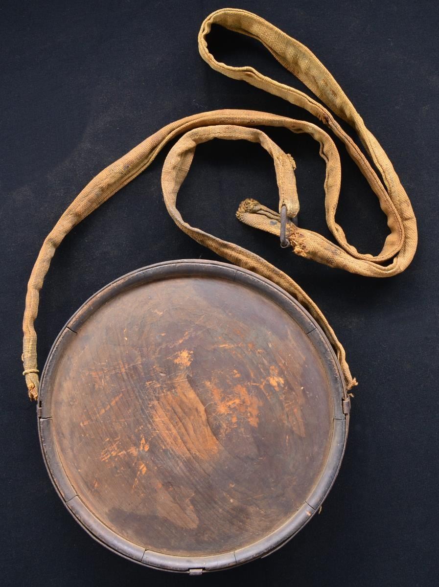 ROLLER BUCKLE HEAVY CANVAS SLING. "As found" attic condition classic wood canteen with 2 iron bands & 3 sling loops still attached with original heavy Confederate canvas sling with roller buckle. These slings are very rare. Wood has fine smooth hand worn surface. Once in the collection of Confederate authority Steve Mullinax who had among the finest Confederate canteen collection ever assembled. 7.25" diameter, 2.25" height, about 5 ft sling. This is a fine beautiful survivor.