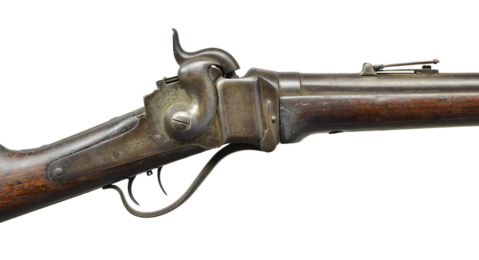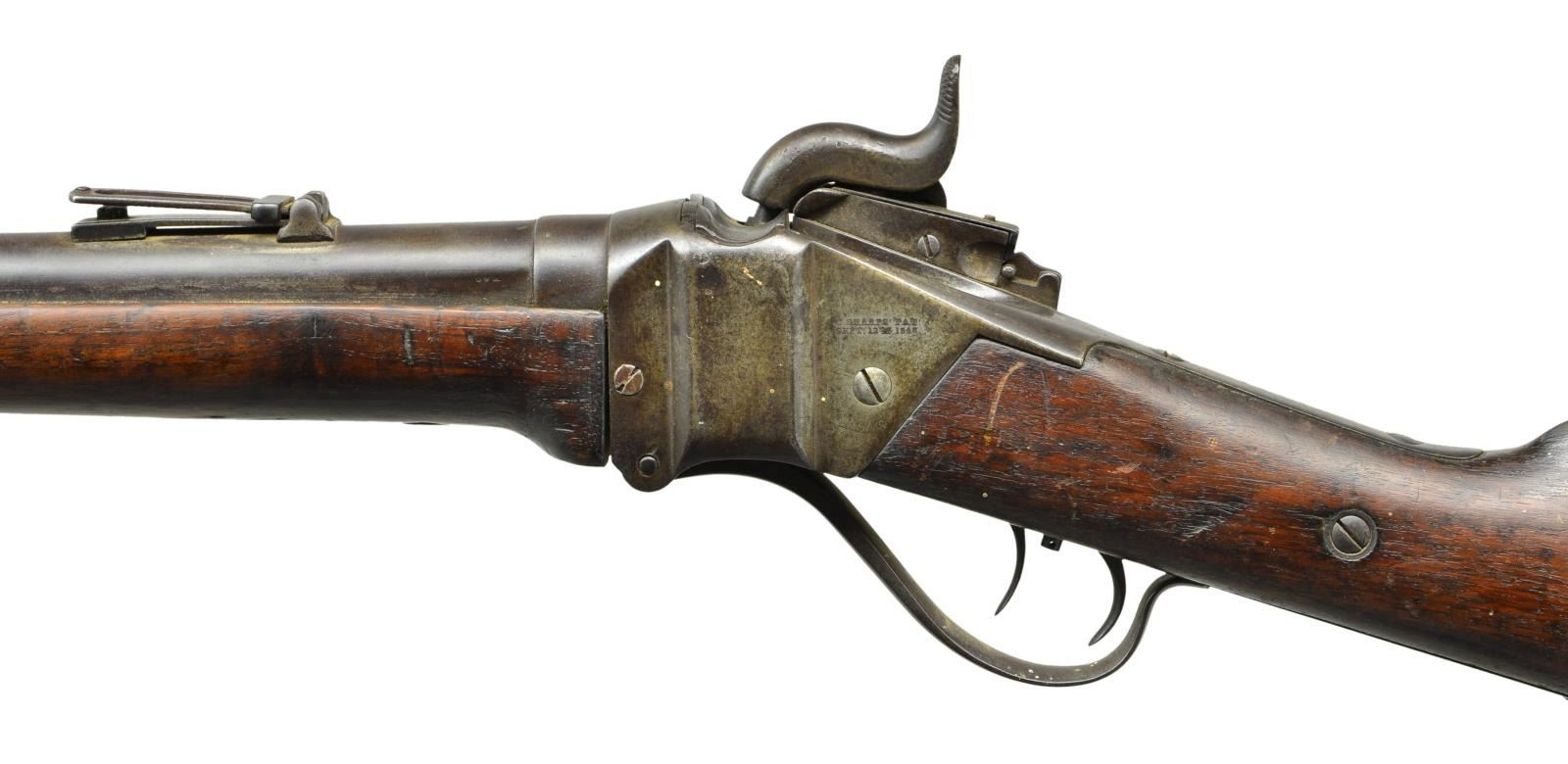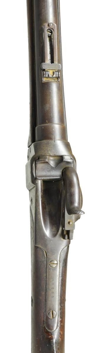 PERCUSSION RIFLE. Cal. 52. S#. 56683. Col. Hiram Berdan formed two regiments of elite sharpshooters. A portion of the Sharps rifles they were issued were fitted with double set triggers, these are the only military Sharps with double set triggers. One of the toughest tests for the sharpshooters was the battle of Gettysburg. 100 men from the 1st Regiment of sharpshooters and 200 men from the 3rd Maine infantry held Little Round Top against overwhelming odds and turned the tide of the war. Since the sharpshooters were a small unit and saw heavy action little of their equipment survives today. Bbl. 30" for socket type bayonet. Iron block front with German silver blade and Lawrence patent rear sight. Case colored action is fitted with double set triggers. Lock plate is fitted with the Lawrence patent primer feed and marked “C. SHARPS PAT./OCT. 5th 1852”. Three band forearm and straight grip stock with iron patch box and rifle buttplate. Rifle is in serial range of known issues Berdan Sharps, but this honest example is not inspected by John Taylor. Barrel has inspection of "O.W. Ainsworth" and no cartouche. CONDITION: metal finish has faded to a heavy brown patina. Wood shows heavy wear with age darkening having numerous scratches and dents. Stock has small chips around top tang with a crack extending from the buttplate peak. Screw at bottom rear of forearm is missing, sling swivels are removed. Rear sight leaf shows a slight bend. Functioning action. Pitted bore retains largely intact rifling. (01-21963/DS). ANTIQUE. $6,000-9,000.