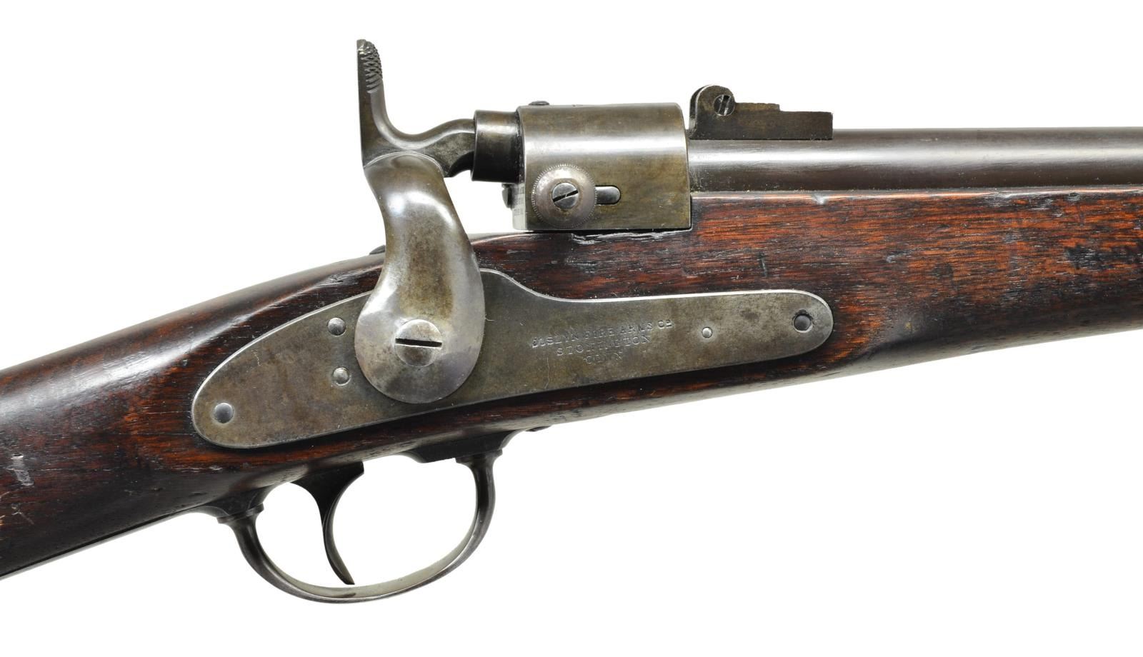 Cal. 52 RF. S# 5131. Bbl. 22" rnd. Standard configuration. Lockplate marked "JOSLYN FIRE ARMS CO / STONINGTON / CONN", hinged breechblock. CONDITION: fine overall, smooth plum patina w/ traces of finish, stock has two discernible cartouches, fine mechanics and bright shiny rifled bore. PROVENANCE: From the Collection of James B. Taylor. (01-20576/JS). ANTIQUE. $1,500-2,500.