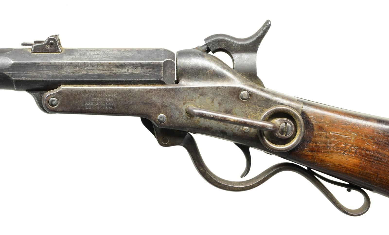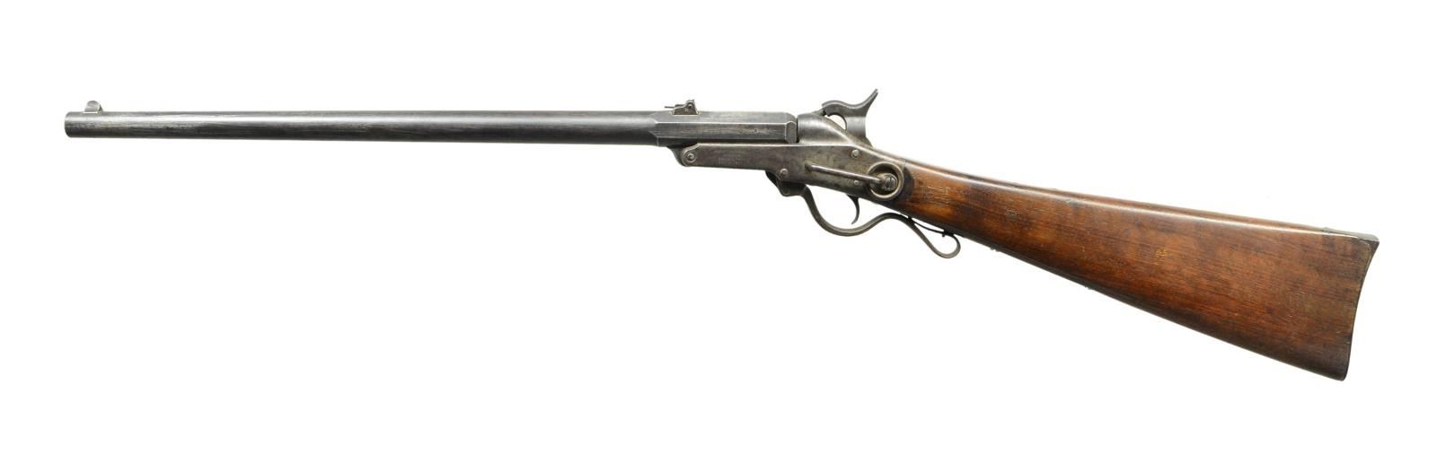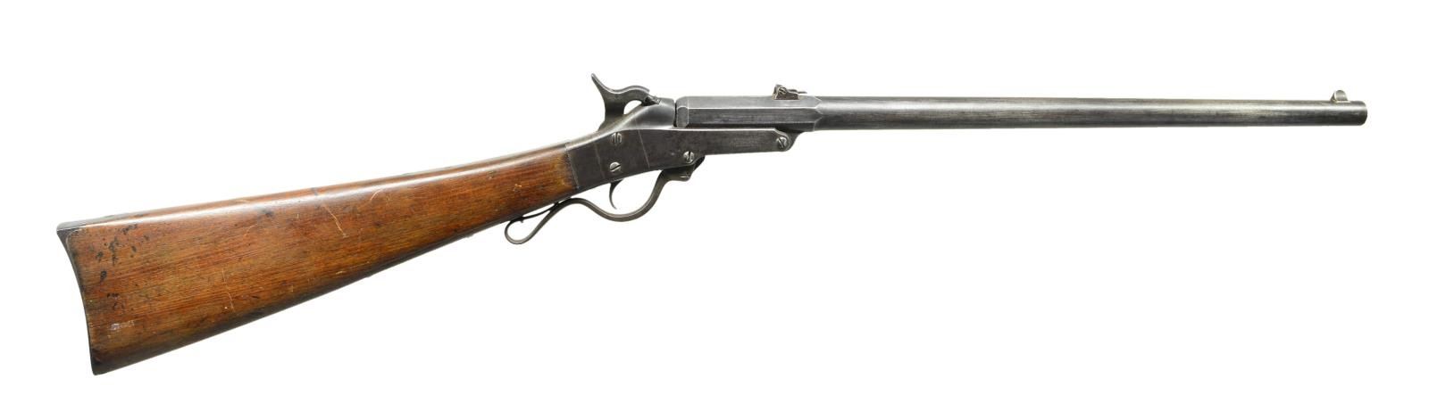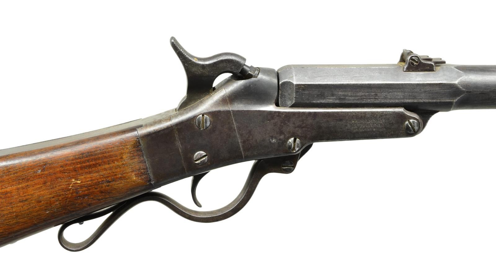 CARBINE. Cal. 50. S# 22519. Bbl. 20" round w/ octagon shank. Semicircular front sight w/ 2 folding leaf rear sight. Lever operated action. Bbl. tips down for loading. Center mounted hammer. Straight grip walnut stock w/ steel buttplate. Approx 20,000 mfg. 1863-1865 during the American Civil War. CONDITION: metal has largely faded to a mottled gray color showing spots of light pitting. Stock has lightly worn finish & retains a sharp cartouche. Dark pitted bore w/ partially intact rifling. PROVENANCE: From the Lifelong Collection of Glen E. Mattox. (01-22563/DS). ANTIQUE. $1,200-1,800.