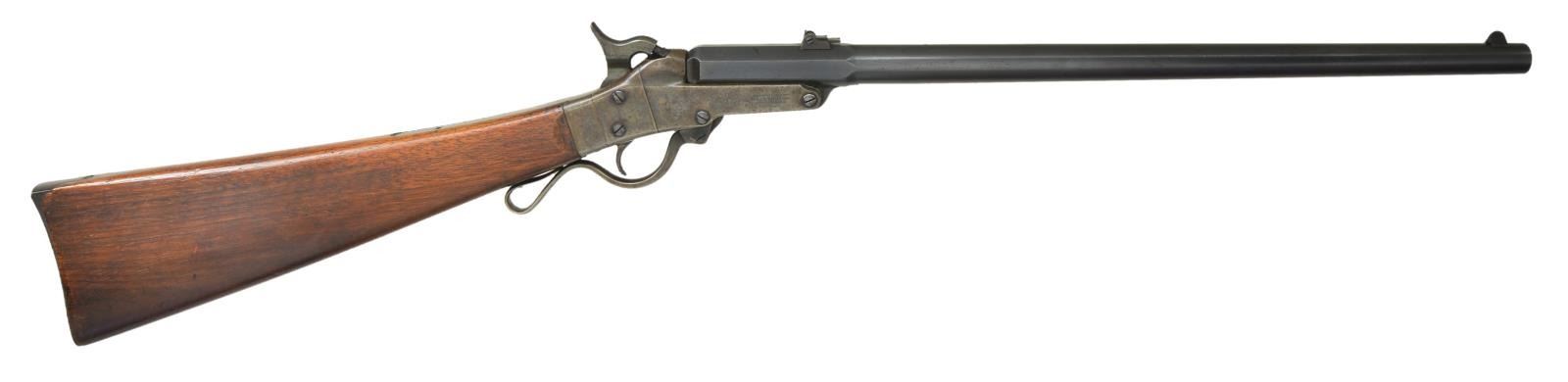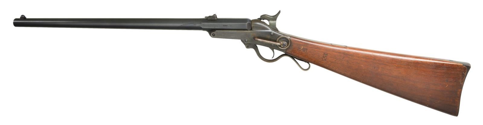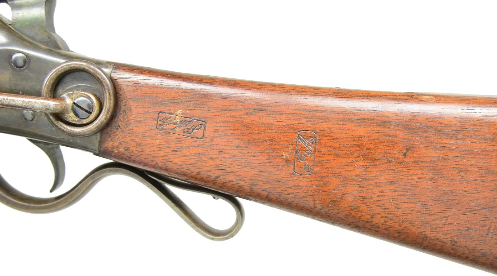 CARBINE. Cal. 50. S# 14349. Bbl. 20" round with octagon shank. Blade front sight with two folding leaf rear sight. Case colored lever operated break open action with center mounted hammer. Left side has saddle ring and bar. Left bbl. flat has “G. W. S” cartouche. Walnut stock with crescent steel buttplate. Left side has two sharp cartouches. About 20,202 mfg. 1863-65. Cavalry units armed with these included the 9th and 11th Indiana and the 11th Tennessee. CONDITION: fine. Bbl. retains 90% original blue. Action has over 90% age darkened case colors. Original stock finish shows scattered marks and small dents. Bore is bright with strong rifling showing a few small spots of pitting. (01-21971/DS). ANTIQUE. $2,500-3,500.