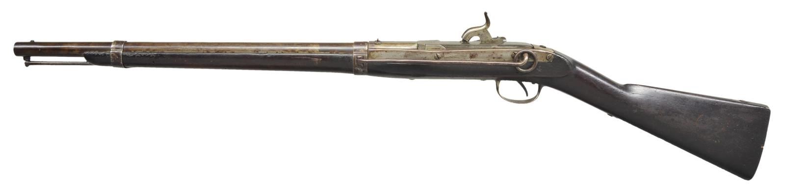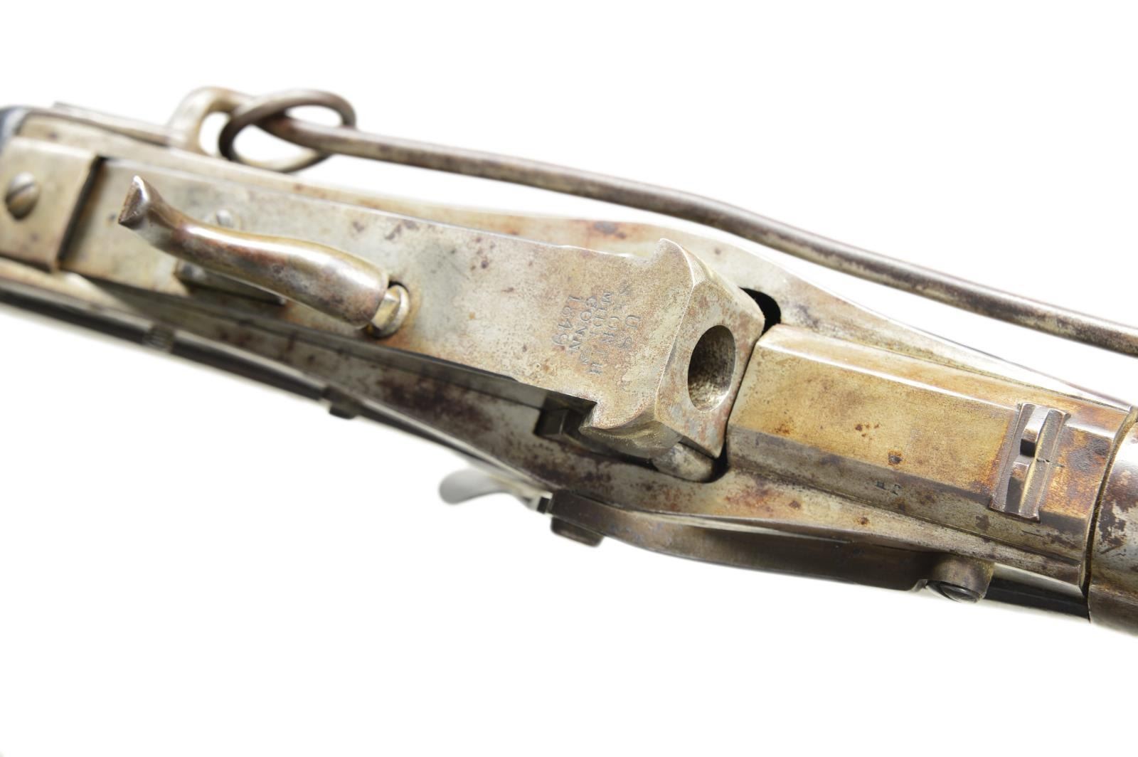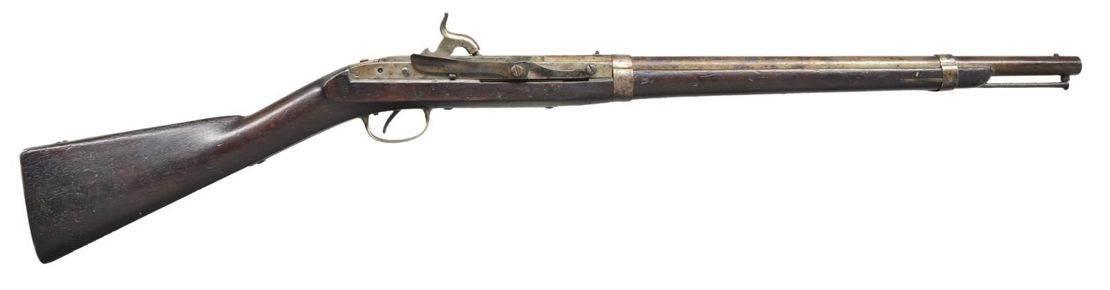PERCUSSION CARBINE. Cal. 52. NSN. Bbl. 21" with rifled bore. Approximately 10,500 mfg. by Simeon North, Middletown, CT., 1844-55. Breech Block is operated by the side lever and pivots upward for loading. Block is marked “U. S./S. North/MIDLTN/C0 and and./1849”. Two band fastened walnut stock with iron fittings and button tipped rod has saddle ring and bar on left side. Left side of stock is stamped “4”. CONDITION: metal finish has faded to a mottled brown gray. Stock has aged darkened appearance showing numerous scratches marks and dents. Stock ears have weak cartouches. Functioning action. Lightly pitted bore retains intact rifling. (01-21969/DS). ANTIQUE. $1,500-2,500.
