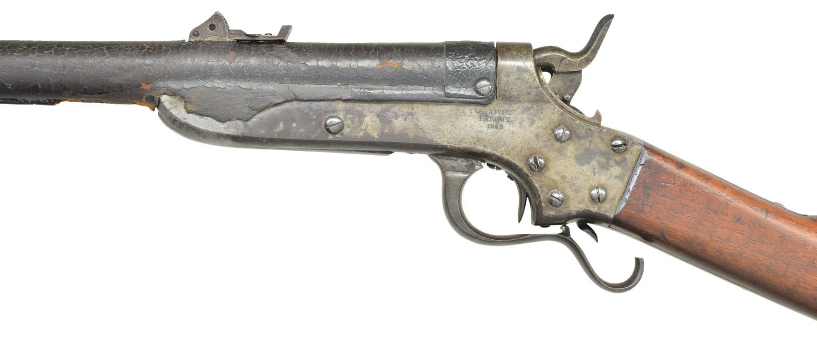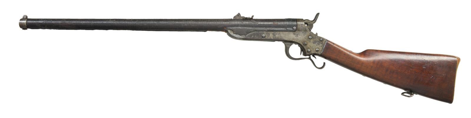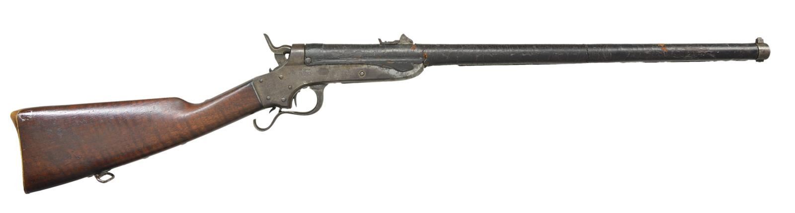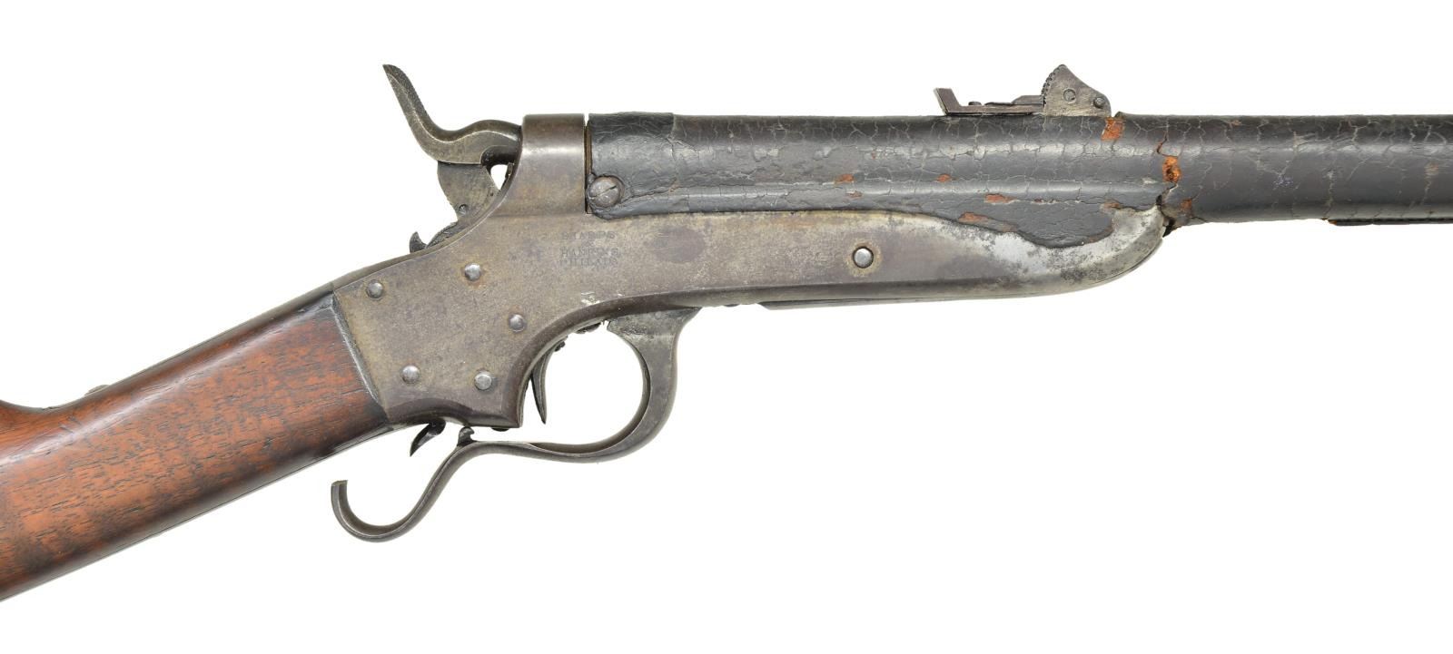 Cal. 52 RF. NSN. Bbl. 24’’ round w/ leather cover. Brass semicircular front sight w/ adj. leaf rear sight. Single shot action is activated by a lever that slides the bbl. forward for loading. Walnut stock w/ brass buttplate & sling swivel. Total production of about 8,000 mfg. 1862-1865. CONDITION: very good. Original leather bbl. covering shows age cracking & is missing a portion around the front of the action. Some sections are missing stitching. Action has faded to a mottled gray brown w/ spots of light pitting. Stock has worn finish showing numerous scratches & marks. Lightly pitted bore retains sound rifling. (01-22325/DS). ANTIQUE. $2,000-3,000.