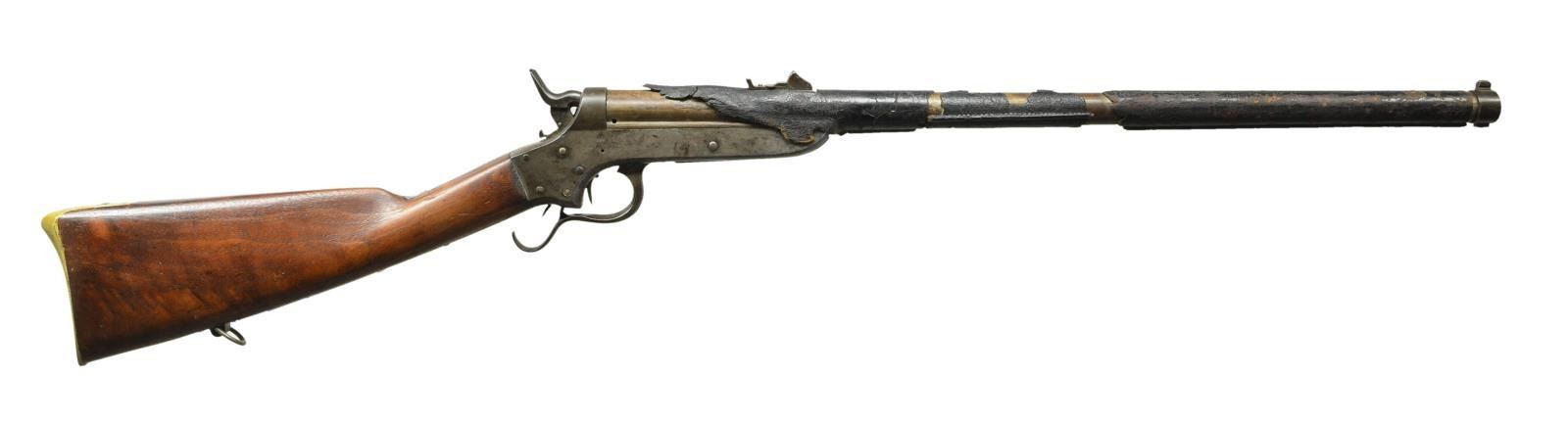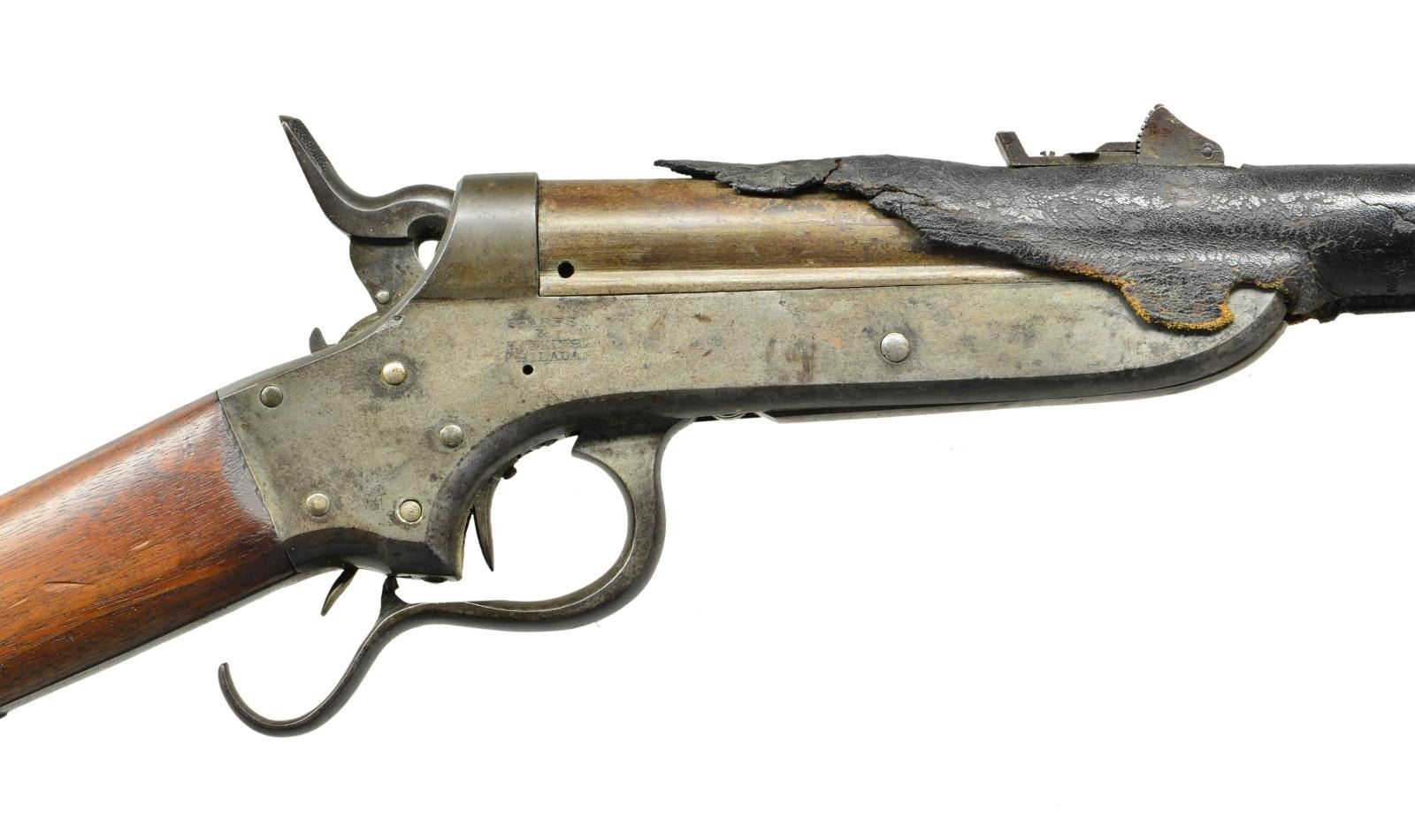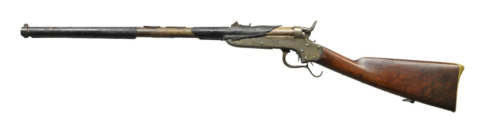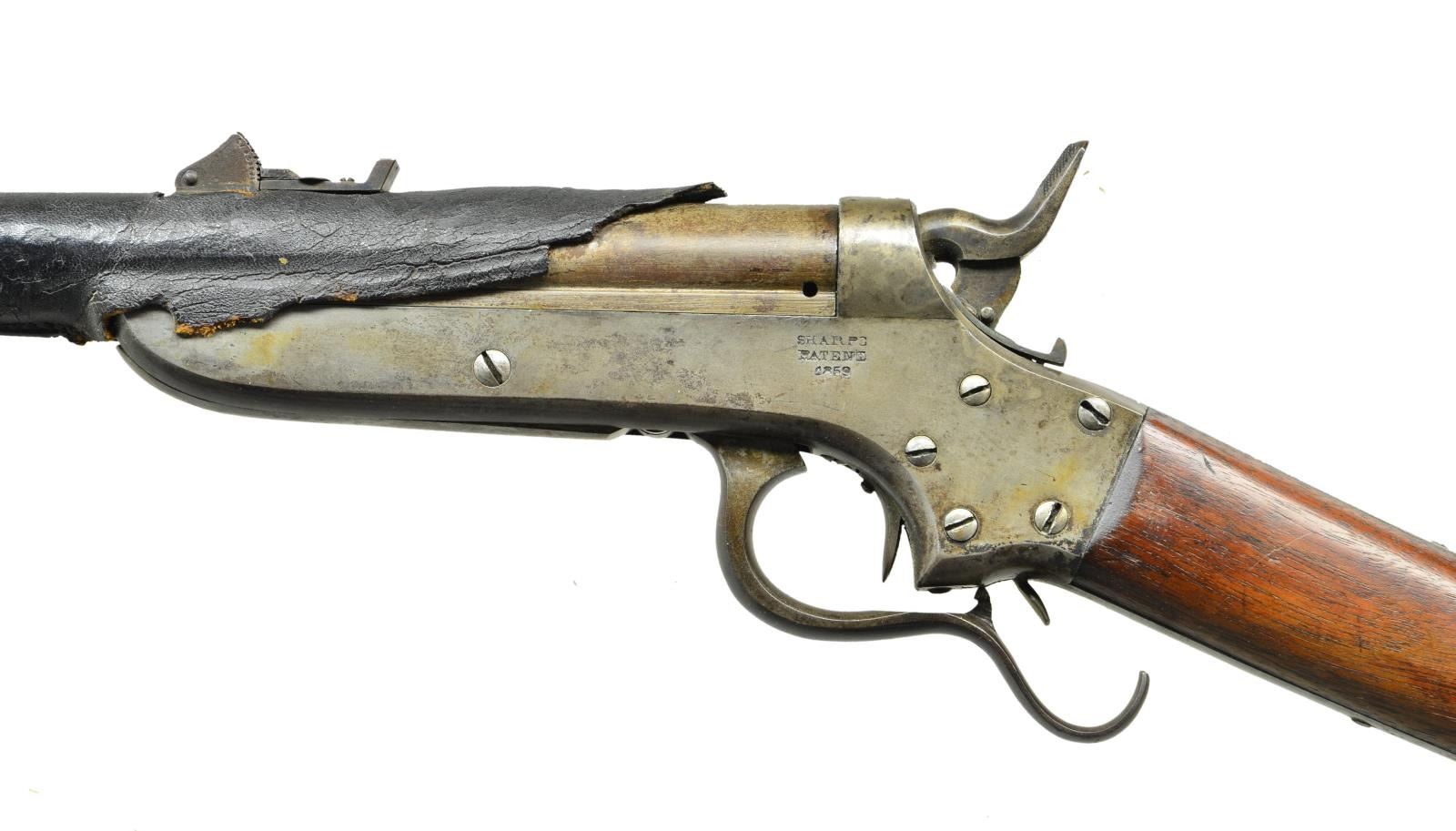 LOADING CARBINE. Cal. 52 RF. S# 11607. Bbl. 24" with leather covering. Blade front sight with Sharps-Nippes rear sight. Lever operated single shot action, bbl. slides forward for loading. Walnut stock with brass buttplate. Total of about 8000 mfg. 1862-1865. CONDITION: bbl. retains 70% dark cracking leather. Bbl. in exposed areas shows light surface corrosion. Action has faded to gray showing spots of corrosion. Stock shows wear with scratches, dents and marks. Functioning action. Dark bore retains strong lightly worn rifling. (01-21968/DS). ANTIQUE. $1,000-1,500.