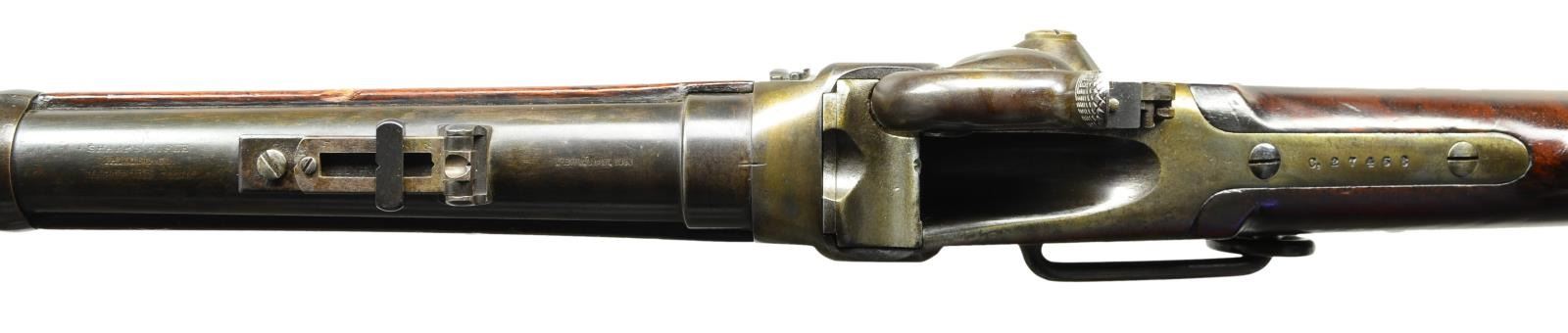 Cal. 52. S# C,27468. Barrel 22" w/ Hartford address. Blade front sight w/ Lawrence patent rear sight. Breechloading single shot action w/ saddle ring & bar on left side. Lock plate is fitted w/ Lawrence patent primer feed. Band fastened carbine forearm & straight grip stock unusually fine walnut w/ steel carbine buttplate. Action has military inspection marks "M" & "S". CONDITION: very good. Barrel has dull blue from touch up finish showing scattered marks & light pitting. Action has touch up finish over remaining faded case colors. Stock has added finish over scratches & handling marks. Lightly pitted bore is dark in the grooves & retains strong rifling. (01-22693/DS). ANTIQUE. $1,500-2,250.