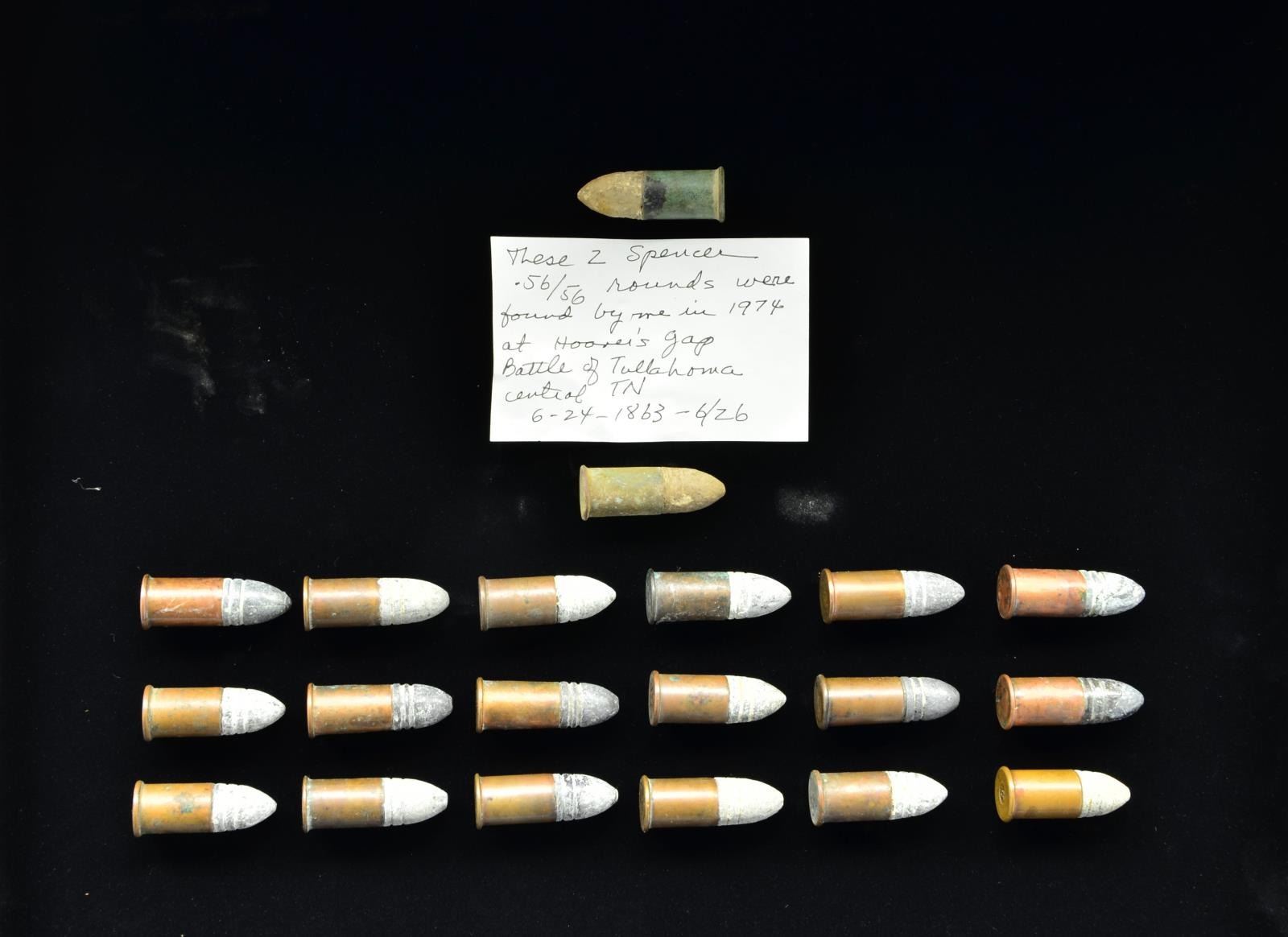 BOX & 20 ROUNDS. Cal. 56-56. S# 15713. Standard configuration, 22” barrel with adjustable ladder rear sight, modified replacement brass blade front sight. Frame stamped: SPENCER REPEATING / RIFLE CO. BOSTON, MASS / PAT’D MARCH 6, 1860”. Rear of saddle ring is inspector’s cartouche. 20 round wood block cartridge box marked “HOOVER CALHOUN & CO / NEW YORK” maker's mark. 17 Civil War Spencer cartridges and one later are found in box. There is also 2 cartridges excavated from 1st major action using Spencers, Hoover Gap, Tennessee with note from owner found in 1974. CONDITION: very good overall, carbine is “as found” with overall dark plum patina, light pitting, markings good, stock shows saddle wear, scuffed, scratched, hairline starting rear of saddle ring bar. Mechanically fine with sharp rifled bore with pitting. Cartridge box and cartridges, all very good including the two excavated. (01-23026/JS). $3,000-4,000.