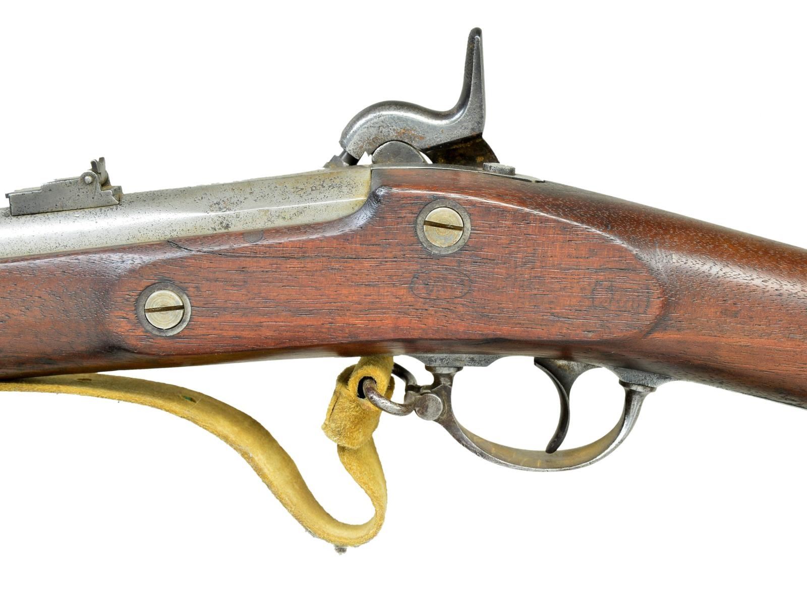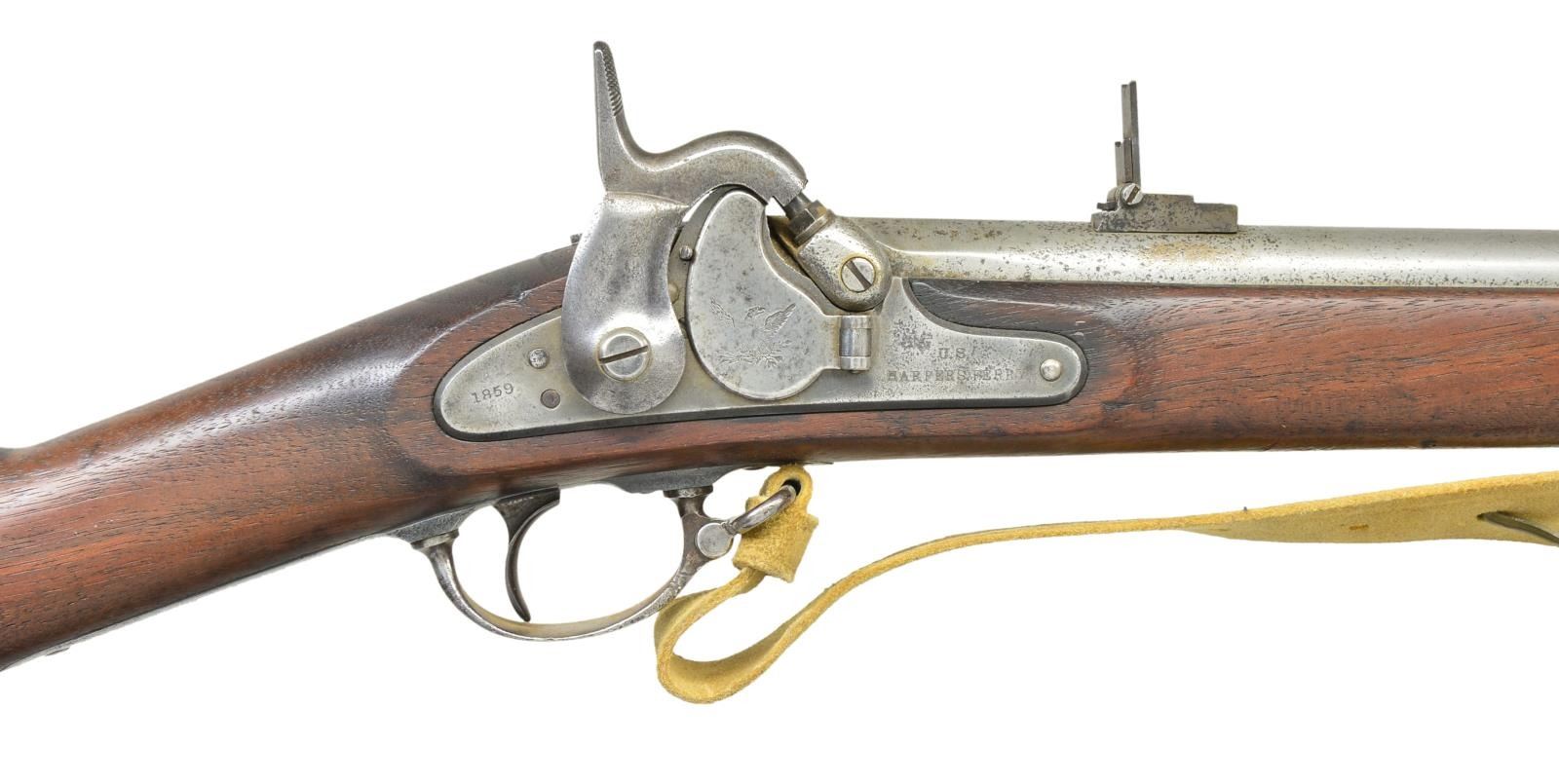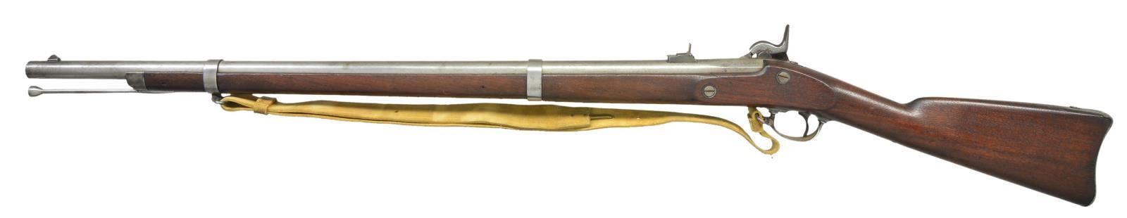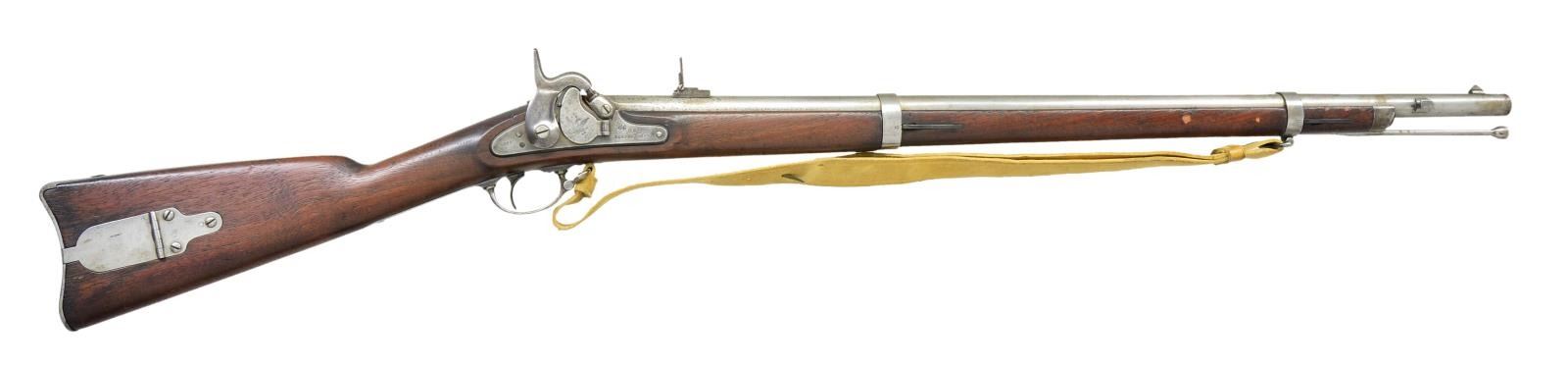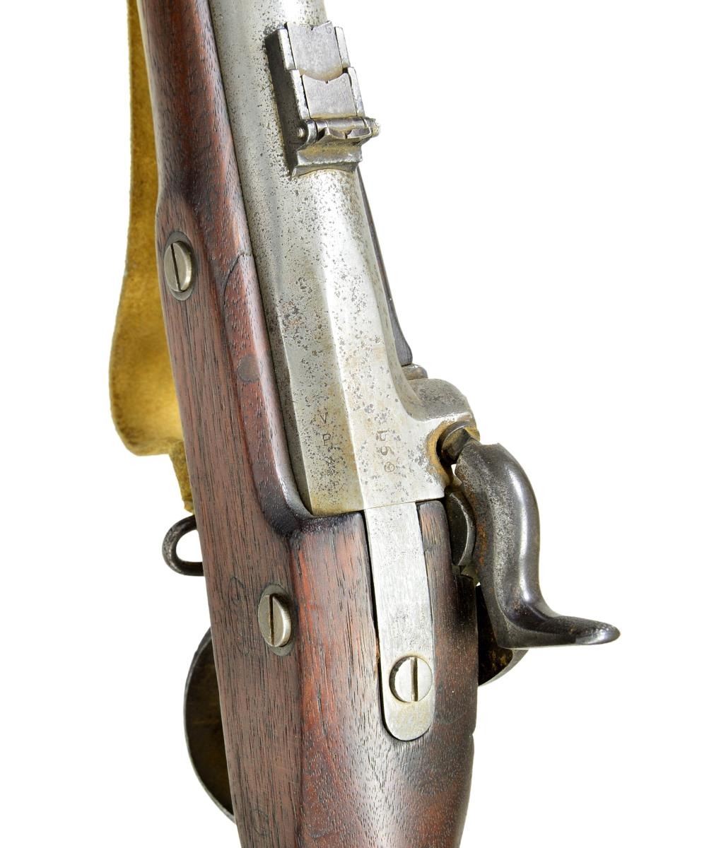 RIFLE MUSKET. Cal. 58. NSN. The 33" round barrel attaches to stock with two spring retained bands and has bayonet lug on right hand side near muzzle. Barrel is fitted with two folding leaf rear musket sight and is dated 1859 on breech end. Percussion lock is fitted with tape primer having eagle on cover. Front of lock is stamped "U.S." "HARPERS FERRY". "1859" is on tail. Later type walnut stock with iron nose cap is fitted with patchbox on right side of butt. Remnants of inspectors marks are on left side of stock opposite of lock. Ramrod is of correct type with tulip head and swell on shank. Rifle is fitted with tan leather sling. CONDITION: good. Metal parts showing heavy cleaning to silver with heavy scattered pitting. Wood with old oil refinish, inspector marks hard to read. Bore with some shine has considerable scattered pitting, rifling good. Lock is good. Tape primer works except inner leaf of spring is missing. PROVENANCE: From the Lifelong Collection of Glen E. Mattox. (01-22482/MGM). ANTIQUE. $3,000-4,000.