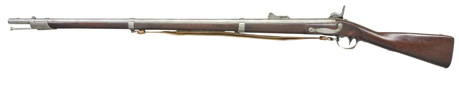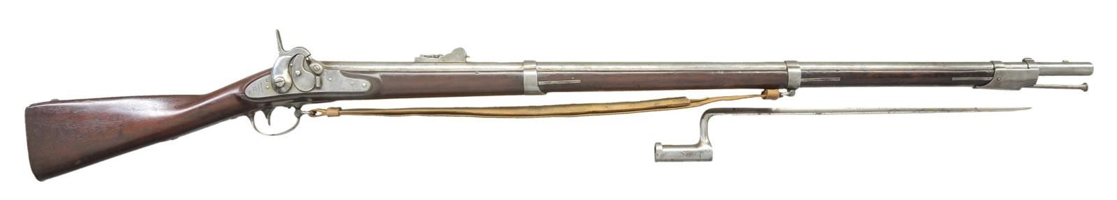 Cal. 69. NSN. Bbl. 42". Conversion w/ 1856 dated lock & upper tang w/ Maynard tape priming system containing a partial roll of 10 primers. Three Bbl. bands, fixed front & long range “marksman” adjustable rear sight. UNATTACHED ACCESSORIES: tulip head ramrod & single brass hook leather sling. US marked socket bayonet. CONDITION: metal heavily cleaned w/ numerous light dings & dents. Stock has an added coat of finish over numerous dings & dents, w/ repairs left side between middle & upper bands. Bore is fair, dark w/ light rust. PROVENANCE: From the Raymond Darida Estate. (01-22230/CW). ANTIQUE. $600-900.