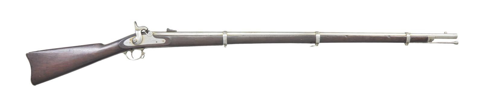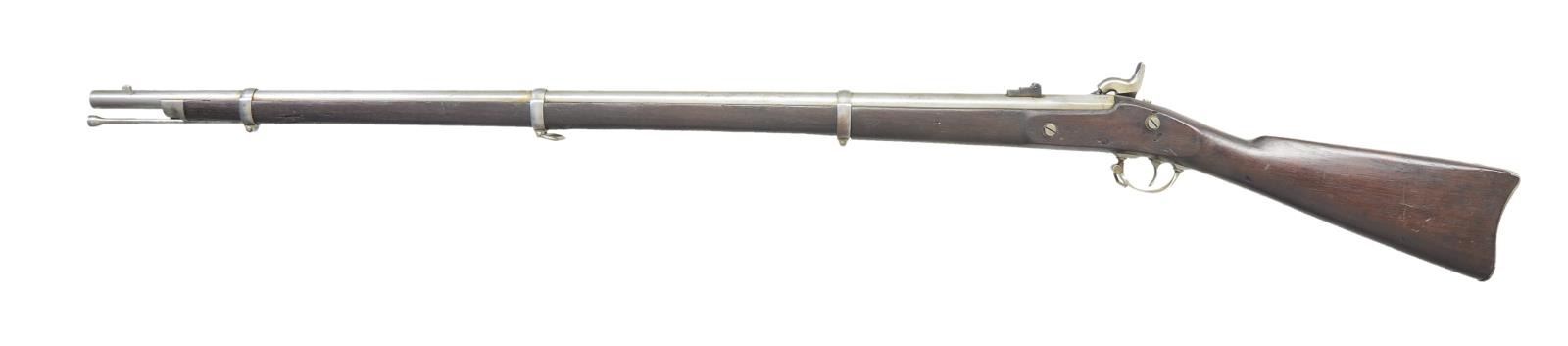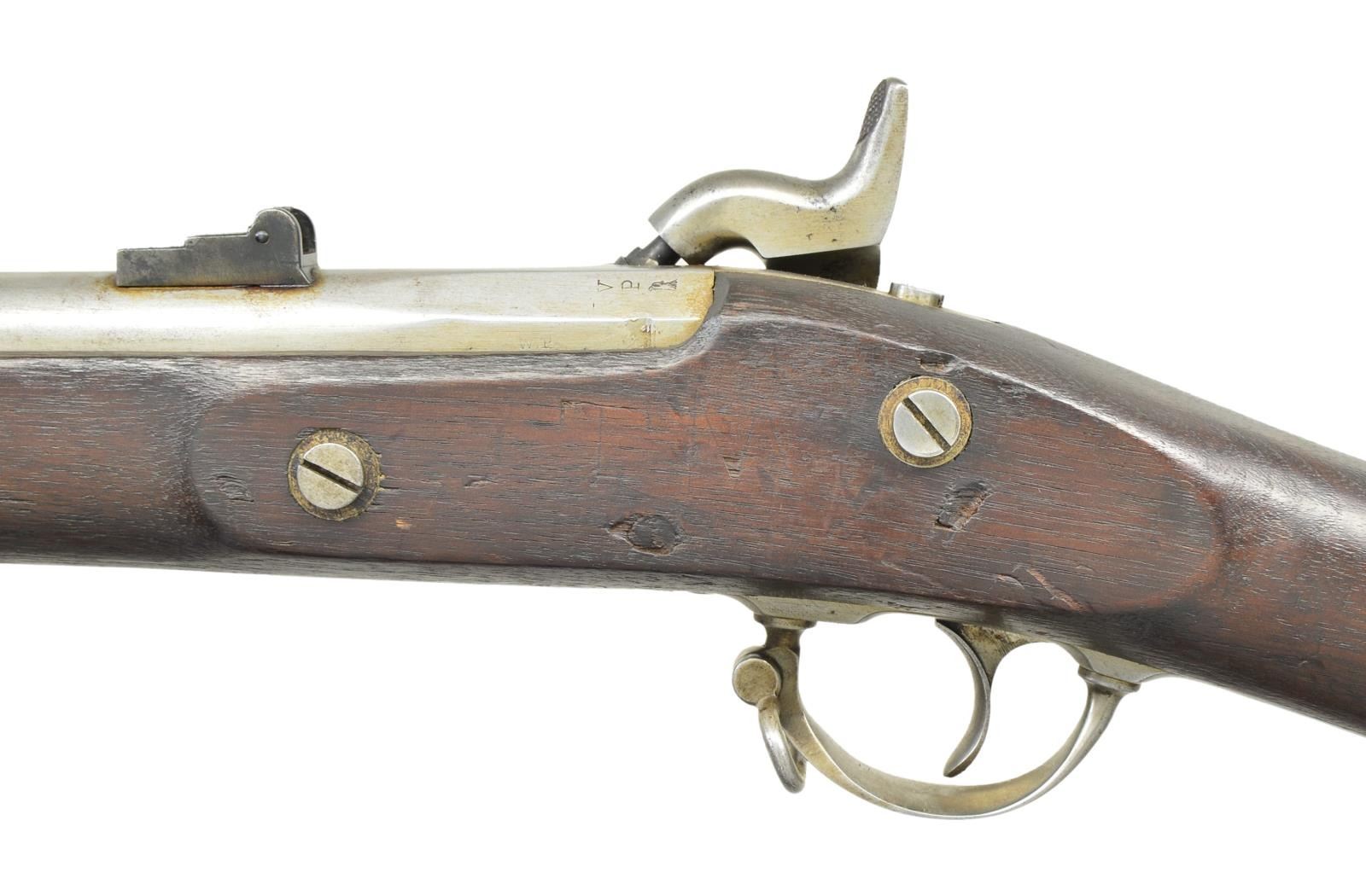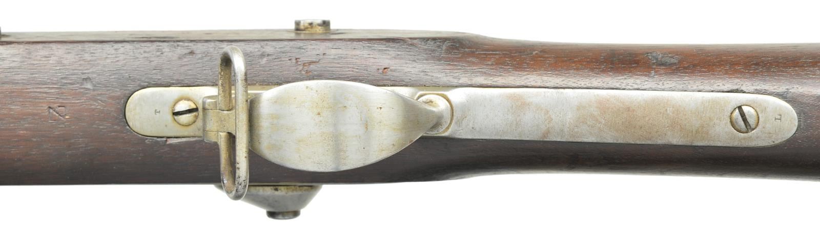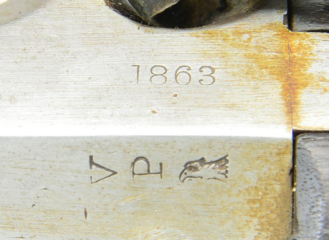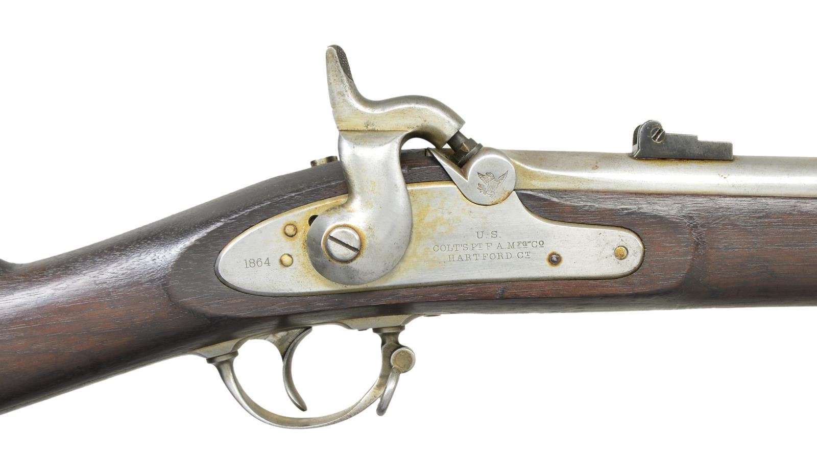 DATED COLT RIFLE MUSKET. Cal. .58. S# NSN. Bbl. 40". Standard configuration of special contract rifle musket among the thousands captured during Lee’s Overland campaign. Steve Knott brings to light in depth research in his text "Captured & Collected" Confederate Reissued Firearms". These long arms for many years were always a curiosity with the various stamped letters on bottom of stocks of many Union and Confederate long arms. We now understand that various Confederate armories repurposed the many thousands of arms captured. Several letter stamps are found that designate these reissued arms. The "Z" stamped forward of trigger guard is one of the two most common letters found and refers to Virginia armory. Many of these reissued guns have mixed parts, from several guns to make one functional gun, many were just rusted on the battlefield when found & only needed cleaning & polishing. In the case of this musket, the stock appears replaced and has no US inspection or manufacturing proofs, only the final "Z" CS inspection. The barrel is dated 1863 and appears of different manufacturer, "W.P." inspection on left mostly polished out, on bottom is "P" & "G.B.F." inspection. Bolster was filed on bottom front edge to fit. Lock has been made functional with several replaced parts along with original Colt proofed parts. Hammer has been polished losing all but outline of Colt factory inspection initial. Front band has also had "U" almost entirely polished out which is common to see on "C&R" muskets. CONDITION: very good overall, "Z' crisp and well defined. Mechanically fine with crisp good rifled bore. (01-22947/JS). ANTIQUE. $2,000-3,000.