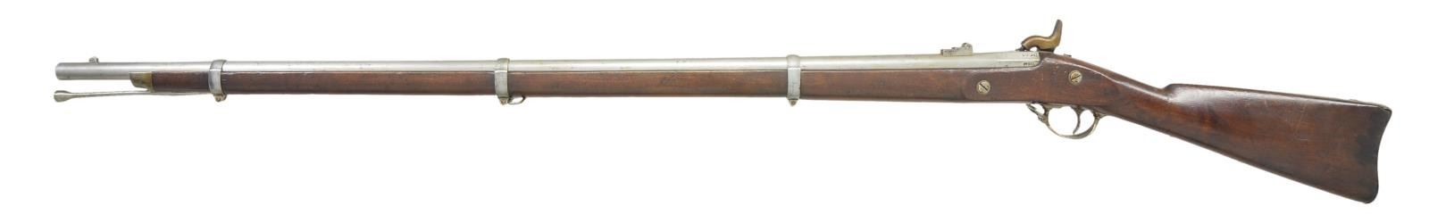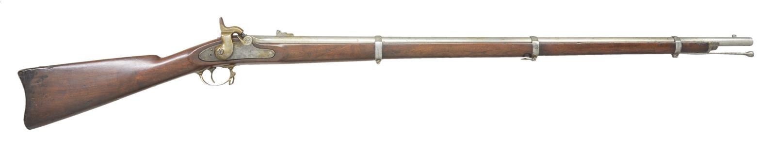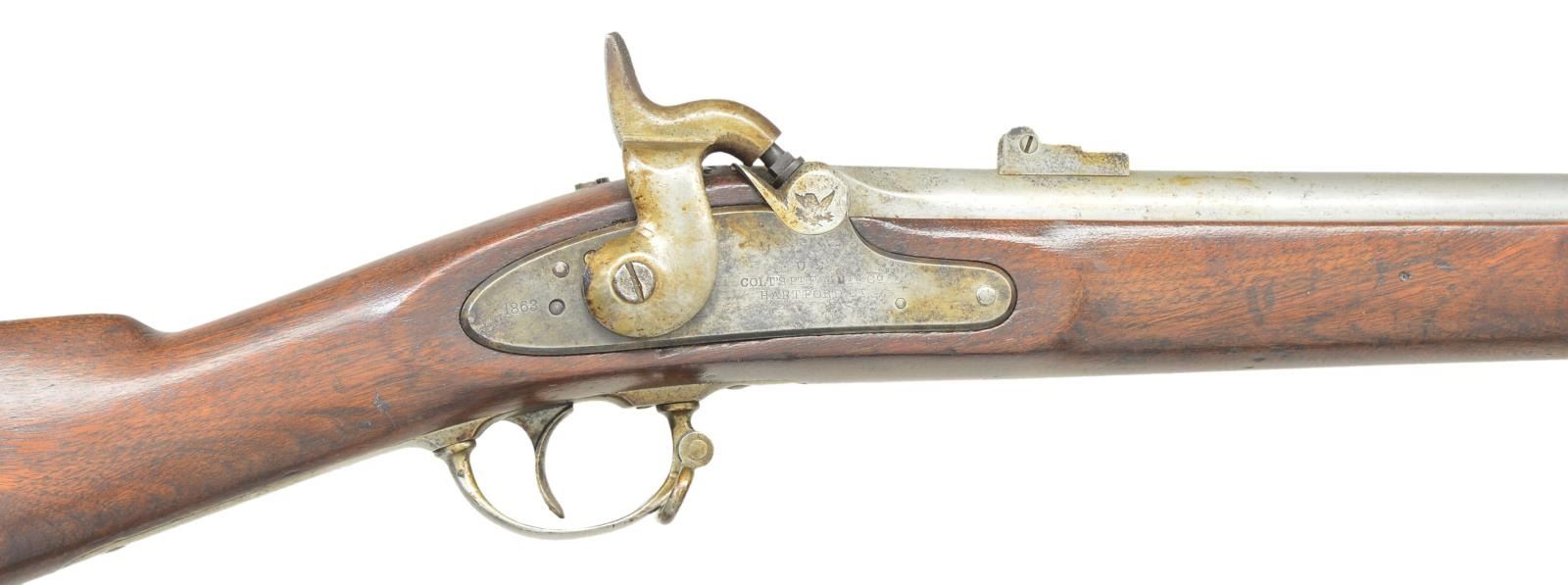 Cal. 58. NSN. Bbl. 40" w/ Barleycorn front sight, 2 folding leaf rear sight & 1863 date. U.S. marked Colt lock w/ Hartford address having 1863 date. 3 band full length walnut stock w/ iron fittings. Left ear has 2 lightly visible cartouches. Tulip tipped iron ramrod. Mfg. 1861-1865 during the American Civil War. CONDITION: bbl. is cleaned to original white appearance showing scattered light pitting. Lock has darkened appearance w/ light pitting. Sanded & refinished stock shows dents & marks w/ a crack extending from the rear lock screw. Modern replacement nipple. Bore is bright w/ strong rifling. PROVENANCE: From the Lifelong Collection of Glen E. Mattox. (01-22485/DS). ANTIQUE. $1,500-2,000.