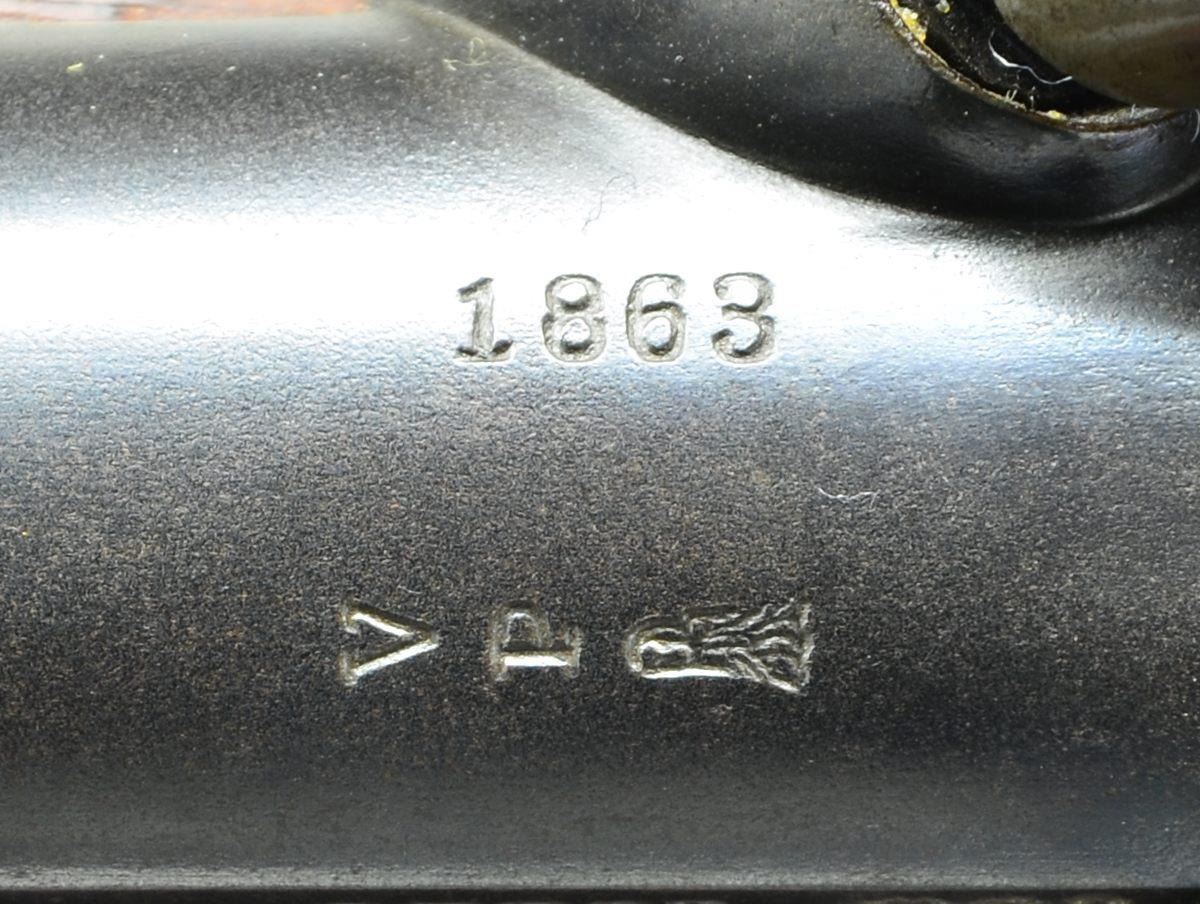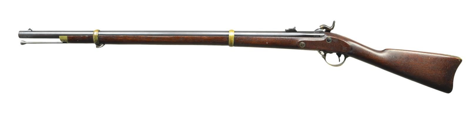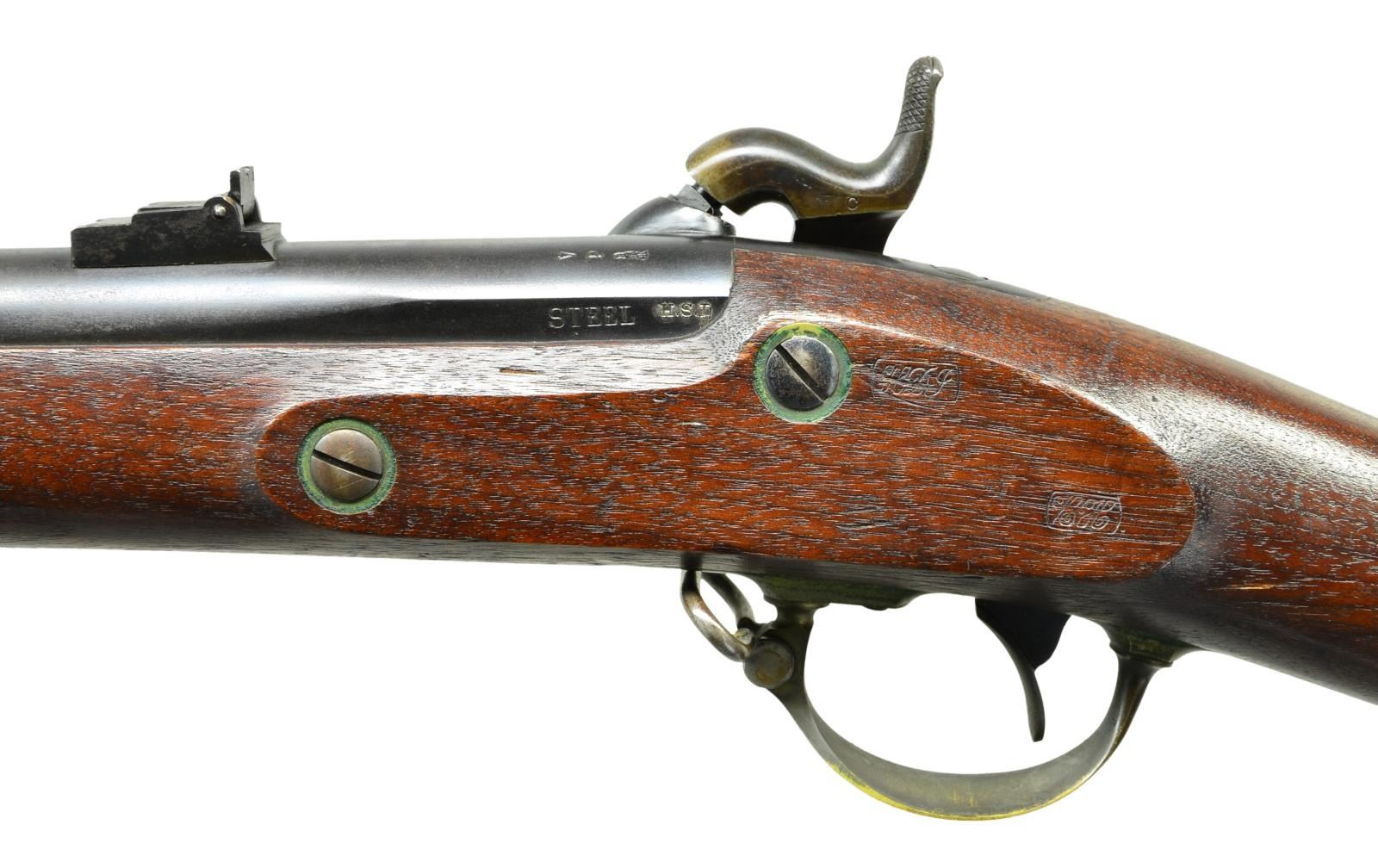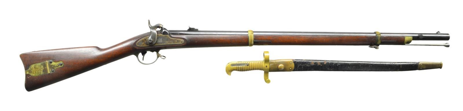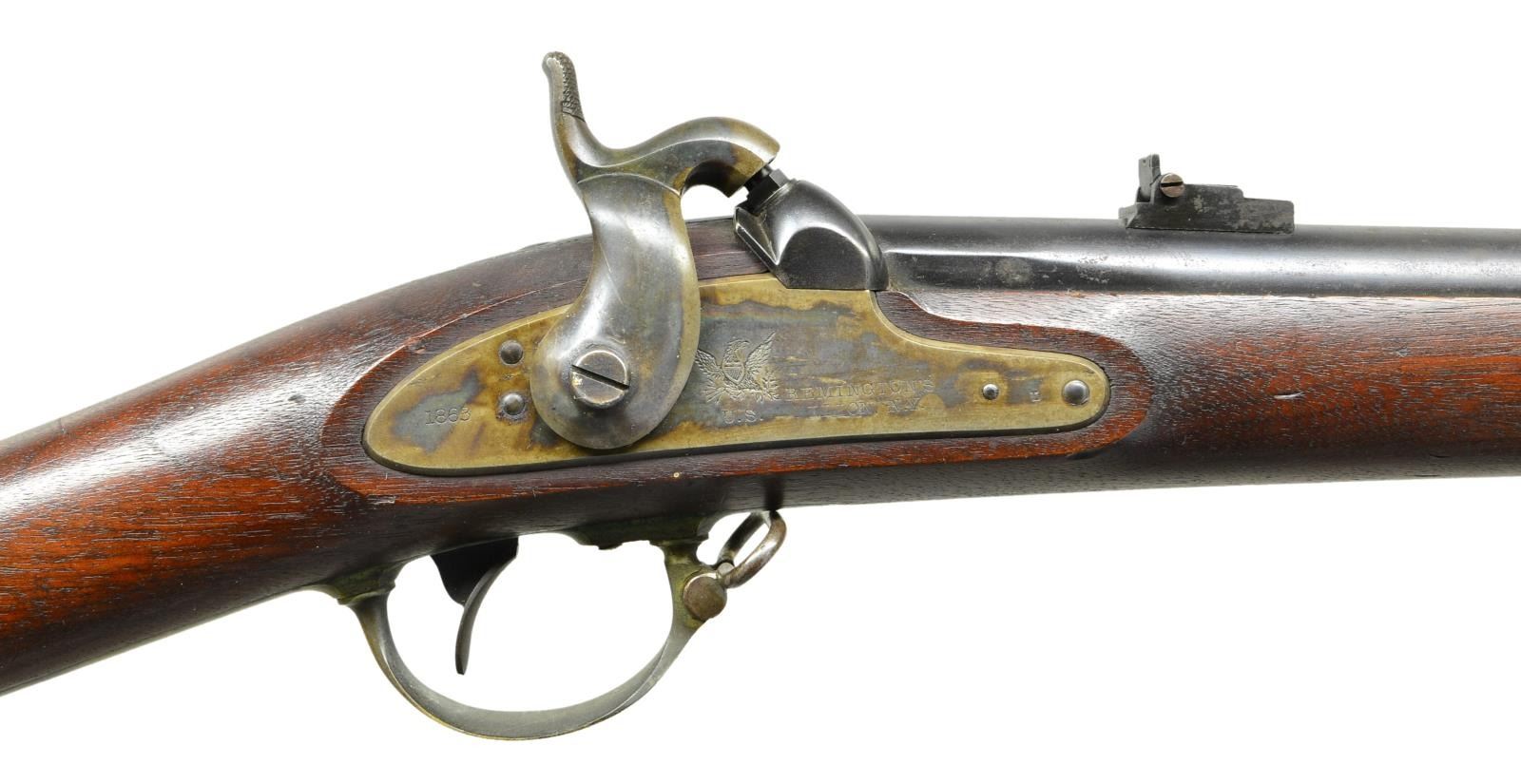 RIFLE & BAYONET. Cal. 58. NSN. Standard configuration of the popular brass mounted Civil War rifle, 33" blued barrel marked at breech "1863” & “V” / “P” & eaglehead proofs. "STEEL" & inspector “HSL” left side. 2-leaf 3-position rear sight and saber bayonet lug. Case colored lock stamped with eagle and “REMINGTON’S / ILION, NY” and “1863 at tail. Brass furniture and straight grain stock with 2 crisp inspector cartouches. CONDITION: Fine to excellent overall, complete & matching, retains 95% plus original bright blue, 60-80% dark strong case colors on lock and hammer. Stock is fine, crisp cartouches, scattered cosmetic blemishes. Mechanically fine with bright shiny rifled bore. Matching bayonet and scabbard are very fine, bright shiny blade, leather sound with craquelure. (01-22816/JS). $2,250-3,250.