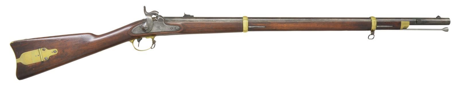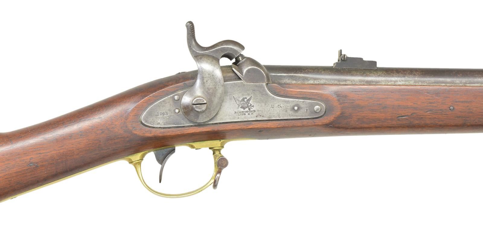 Cal. 58. NSN. Standard configuration of the popular brass mounted Civil War rifle, 33" blued barrel marked at breech "1863” & “V” / “P” & eaglehead proofs. "STEEL" at left side. 2-leaf 3-position rear sight and saber bayonet lug. Case colored lock stamped with eagle and “REMINGTON’S / ILION, NY” and “1863 at tail. Brass furniture and straight grain stock with 2 inspector cartouches. This rifle saw some use, additional “US” stamp on top of breech. CONDITION: Very good overall, complete & matching. Iron & brass patinas. Stock is solid, hand worn patina. PROVENANCE: From the Lifelong Collection of Glen E. Mattox. (01-22512/JS). $2,000-2,500.