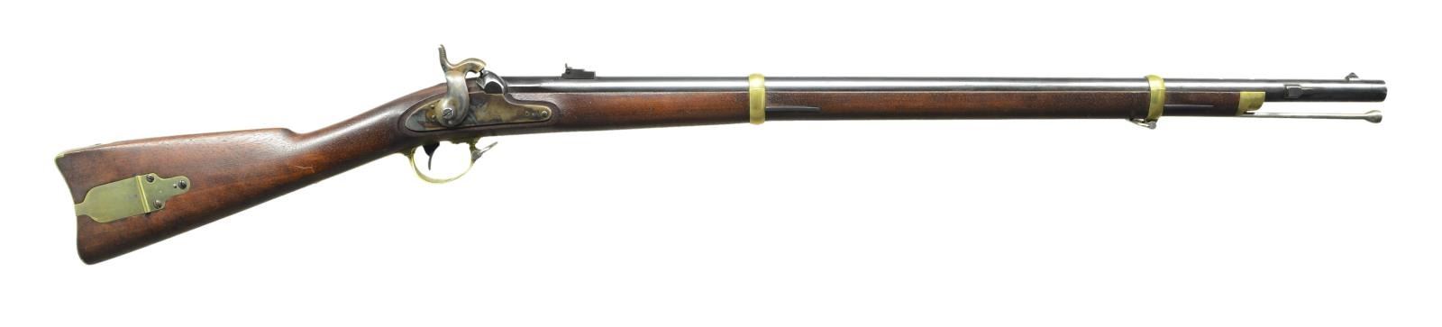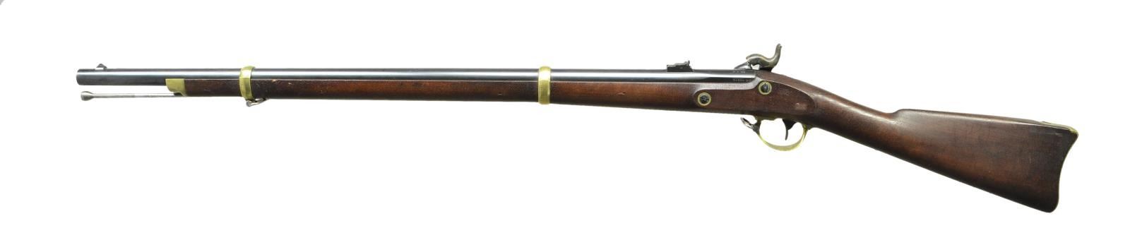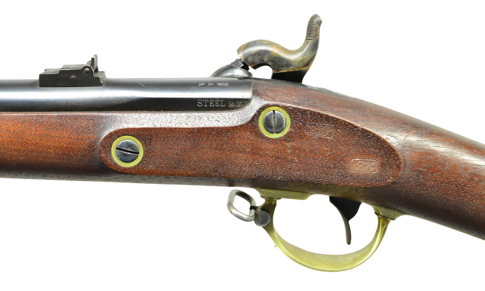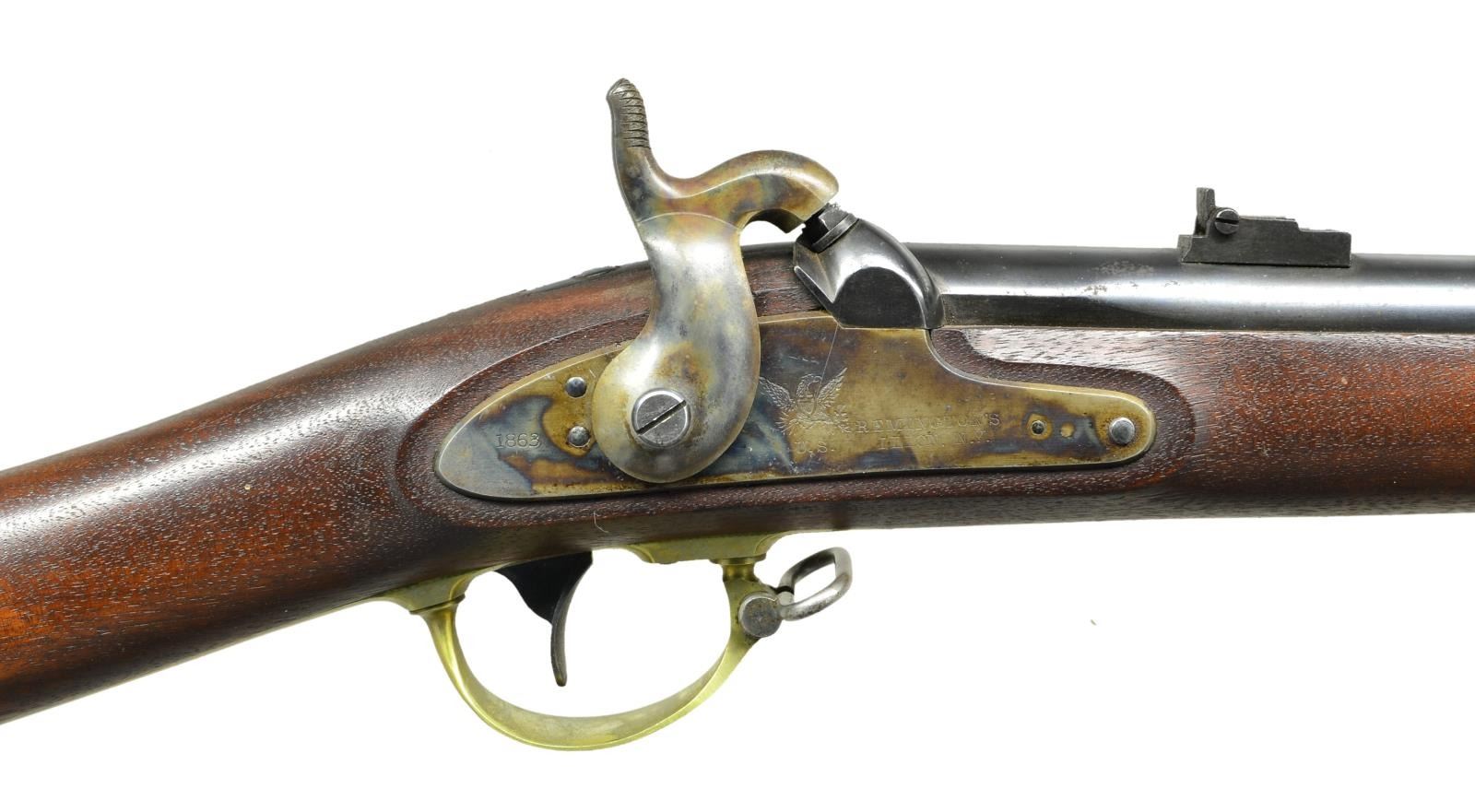 RIFLE. Cal. 58. NSN. Standard configuration of the popular brass mounted Civil War rifle, 33" blued barrel marked at breech "1863” & “V” / “P” & eaglehead proofs. "STEEL" & inspector “RKA” left side. 2-leaf 3-position rear sight and saber bayonet lug. Case colored lock stamped with eagle and “REMINGTON’S / ILION, NY” and “1863 at tail. Brass furniture and straight grain stock with 2 crisp inspector cartouches. Many are found in very fine condition like this one retaining most of its original finish. CONDITION: : Fine to excellent overall, complete & matching, retains 95% plus original bright blue, 80% strong case colors on lock and hammer. Brass polished bright. Stock is fine, crisp cartouches, scattered cosmetic blemishes. Mechanically fine with bright shiny rifled bore. PROVENANCE: From the Lifelong Collection of Glen E. Mattox. (01-22514/JS). $2,000-3,000.