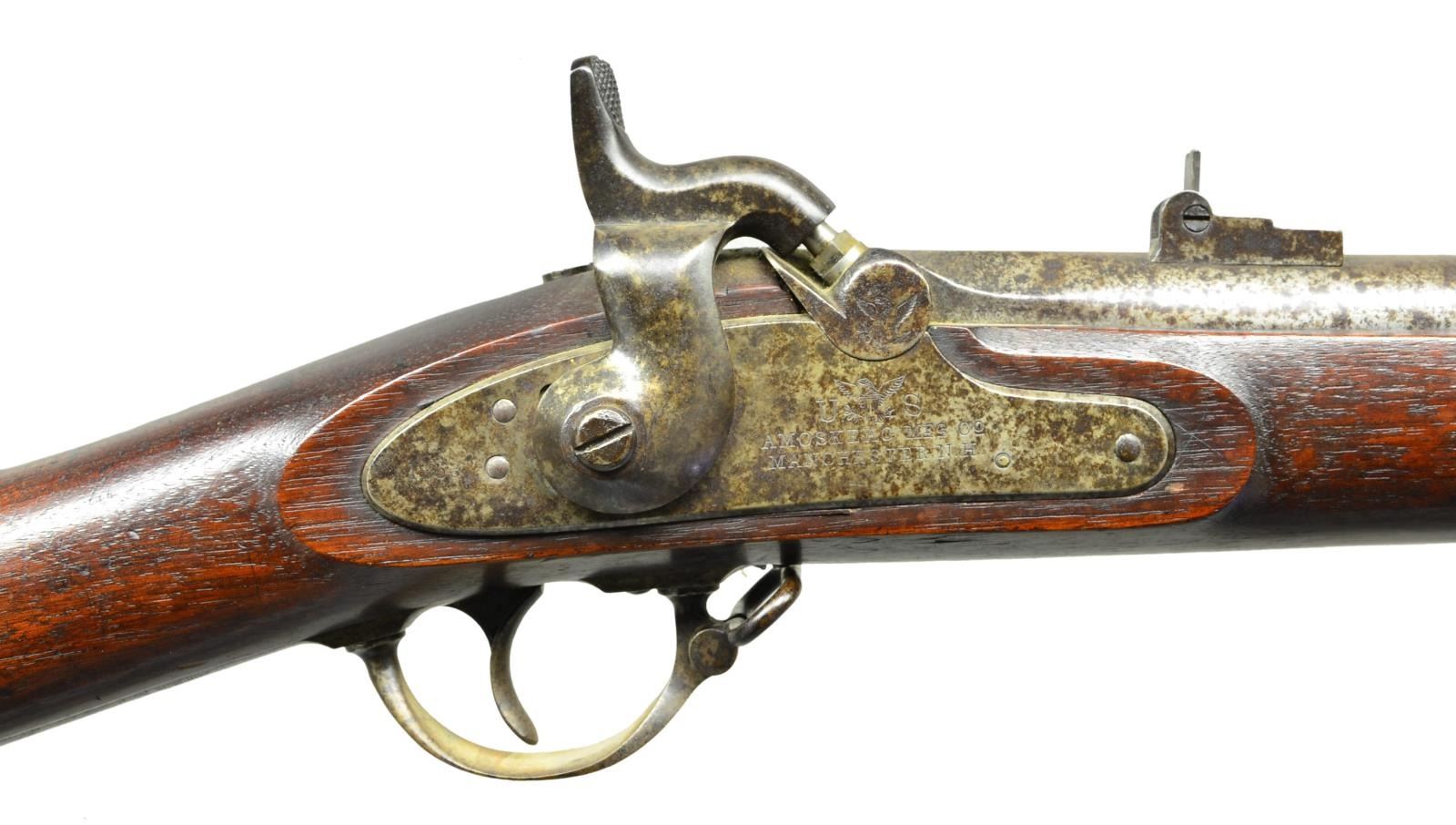VP / eaglehead proofs, "A.M.C." inspection stamped forward of bolster. 3 position 2 leaf rear sight, 3 clamping barrel bands without band springs made late 1863 and early 1864, return to band springs with Springfield model 1864 and contractors required to follow. Bolster marked with spread wing eagle, unique to special models made without cleanout screws. Lock marked "U" & "S" on either side of eagle above "AMOSKEAG mfg Co / MANCHESTER, N.H." & "1863" at tail. Walnut stock has no government inspection cartouches but does have "B" stamped rear of trigger guard. This is superior condition musket, original, & complete with bayonet, 16" blade. CONDITION: very good to fine overall, crisp markings, metal is spotted gray/brown smooth patina, pitting at breech, stock has raised grain, sharp edges. Mechanics crisp, bright rifled bore. Bayonet fits well with US surcharge. PROVENANCE: Michael E. Bray estate collection (01-23291/JS). ANTIQUE. $2,000-3,000.