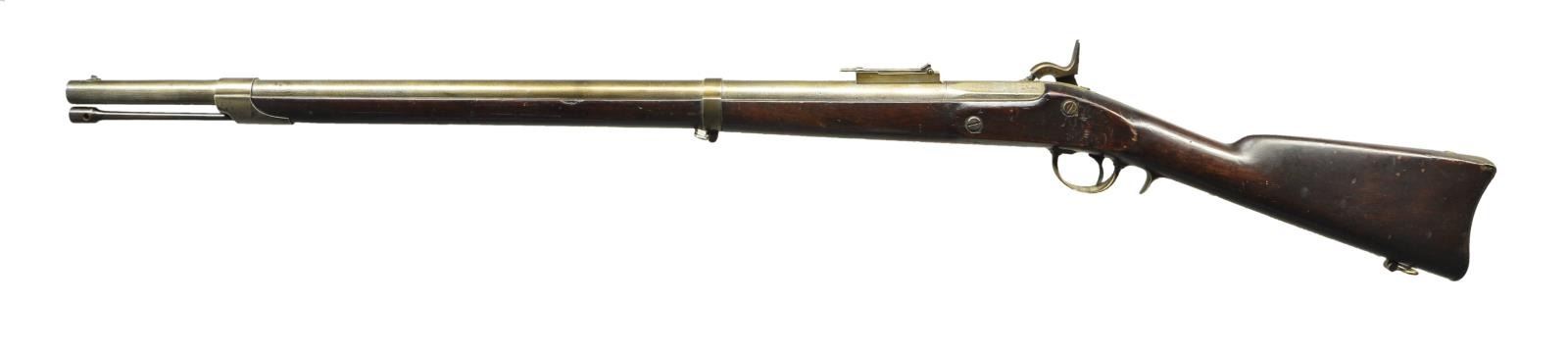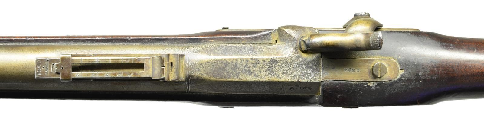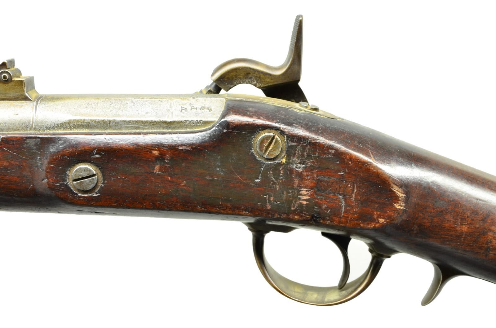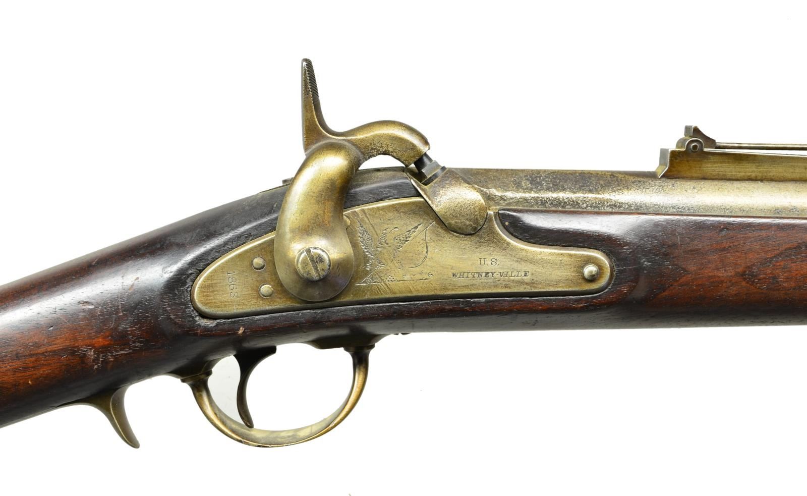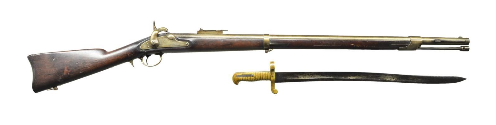 Cal. 69. S# 4082. Bbl. 34-3/16". Standard configuration of the Commander John Dahlgren designed heavy naval rifle based on French pattern 1849 Chasseur. 50.25" overall, iron mounted, long range ladder sight, "VP / eaglehead" proofs, S# 4082 stamped on tang. Lock stamped with large eagle & arms & “U.S. / WHITNEY-VILLE” & "1863" on tail. Often referred to as Plymouth rifles, they were originally field tested on USS Plymouth in 1861. Stock has script cartouche opposite lock "FCW" for inspector Franklin C. Warner and barrel also has his initials. Bayonets were serial numbered to match guns, accompanying bayonet made by "COLLINS & CO / HARTFORD / CONN" mis matched S# "2051". CONDITION: very good overall, complete & original, metal cleaned & varnished, pitted breech, toned to gray patina, markings all discernible, stock sound, discernible cartouche, mechanics fine, pitted worn rifled bore. Bayonet has pitted cleaned blade, fits well. PROVENANCE: Michael E. Bray estate collection. (01-23285/JS). $2,000-3,000.