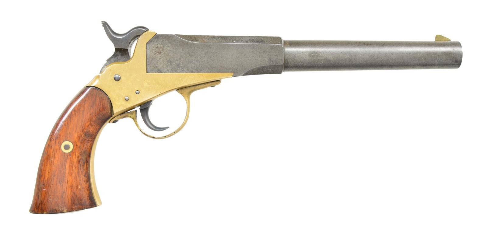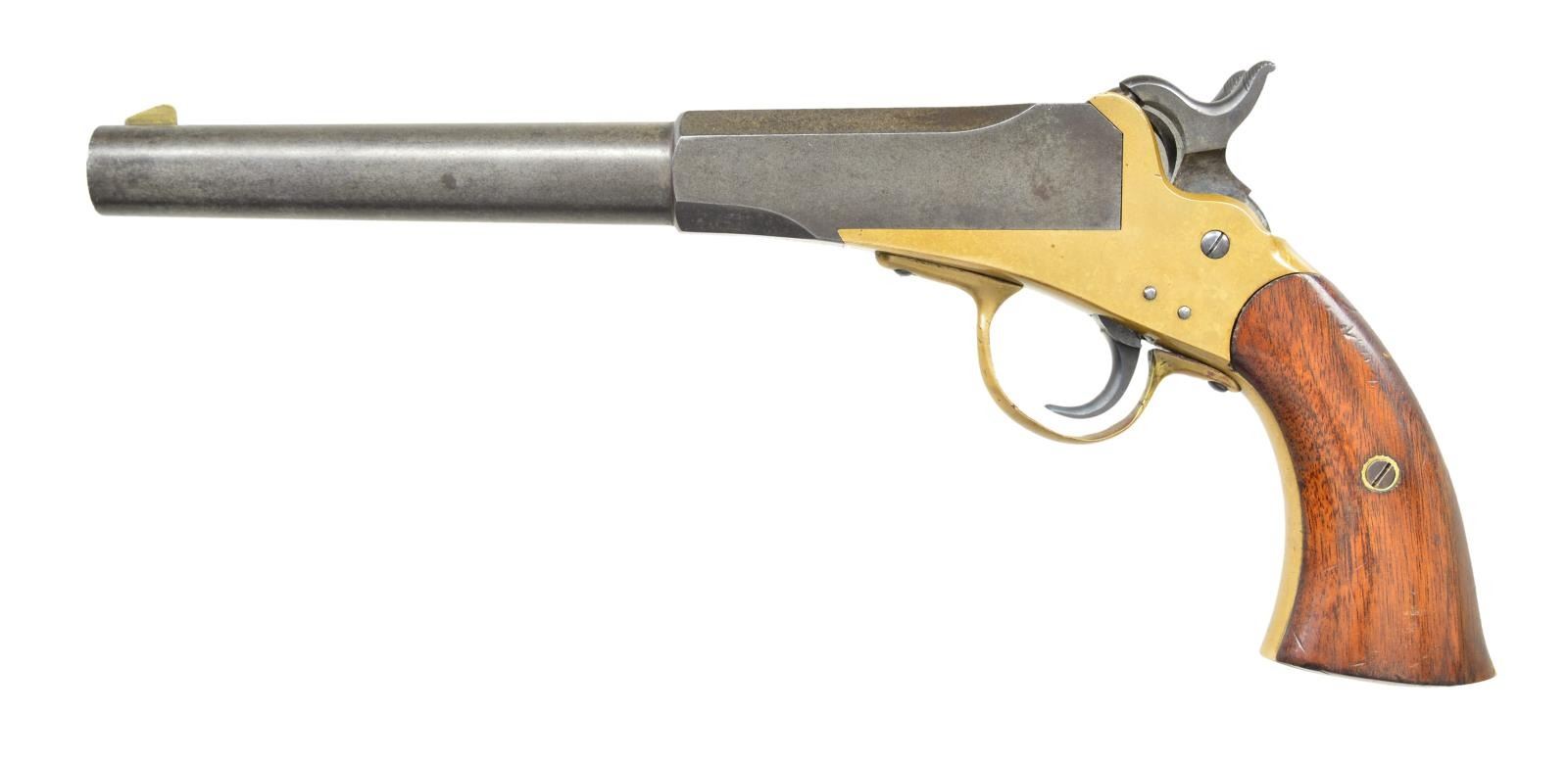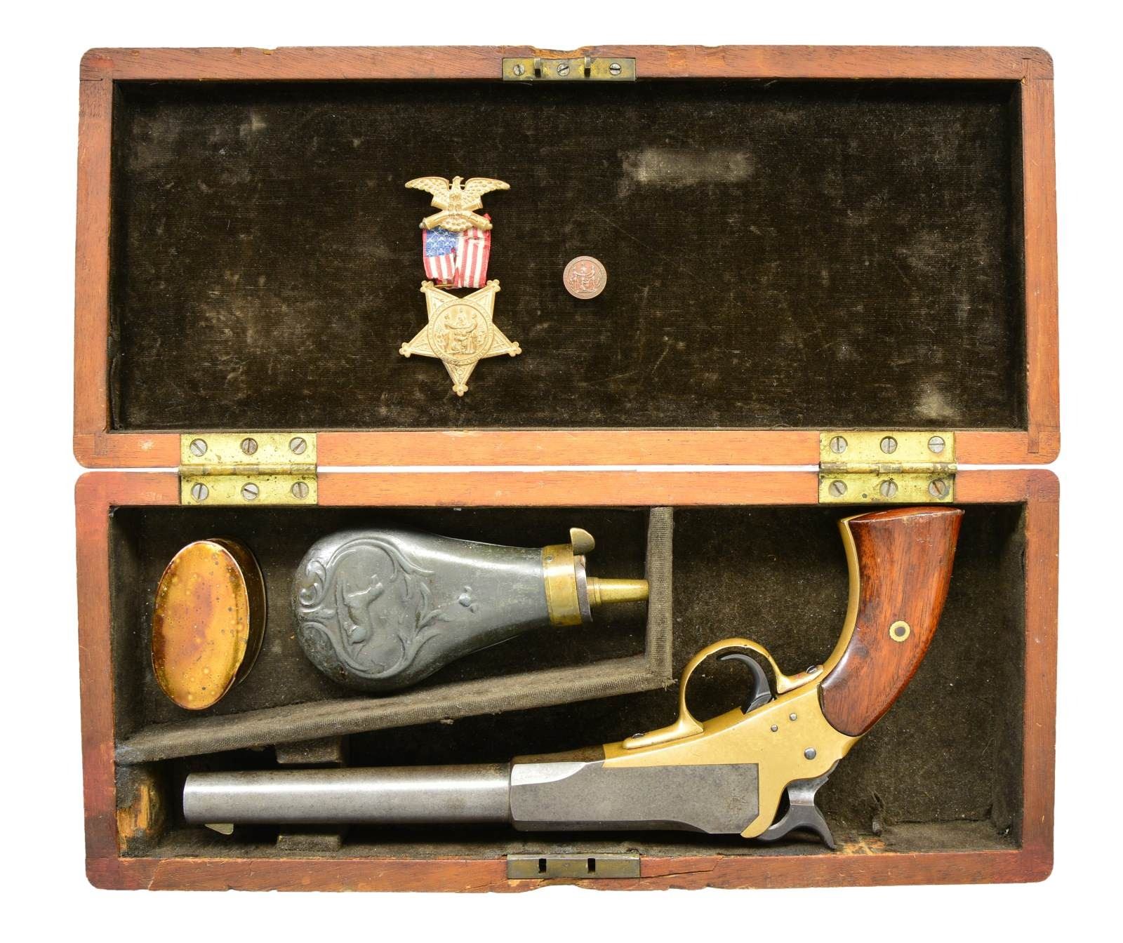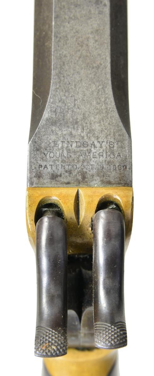 PERSUSSION PISTOL WITH CASE. Cal. 44. S# 19. The heavy iron barrel is designed to take superimposed loads like all weapons of Lindsay design. Barrel is octagonal at breech and transitions to round. Top of breech marked "LINDSAY'S" "YOUNG AMERICA" "PATENTED OCT. 9. 1860". S# 19 stamped on bottom of barrel and bronze frame. Frame fitted with two case hardened hammers which are fired in the correct sequence with a single trigger. Frame unmarked except for S#. Varnished grips are two piece and of walnut. UNATTACHED ACCESSORIES: pistol is housed in mahogany case with key lock closure which is lined in brown velvet. Pistol fits well and case is possibly original. Case contains zinc bodied powder flask embossed with scrolls and dogs. A Japanned oval cap tin and a GAR medal with star suspended by a flag from eagle on crossed cannons. Also included is a GAR button. CONDITION: good to very good. Barrel shows scant traces of blue under smooth gray brown overall patina. A good amount of case hardening remains on hammers. Bronze frame is unpolished and exhibits fine patina. Grips retain most of their original varnish. Bore is shiny. Mechanically good. Case retains most of its exterior varnish heavily crazed and with many marks. Interior cloth is good. Accessories are good. PROVENANCE: From the Lifelong Collection of Glen E. Mattox. (01-22388/MGM). ANTIQUE. $7,000-9,000.